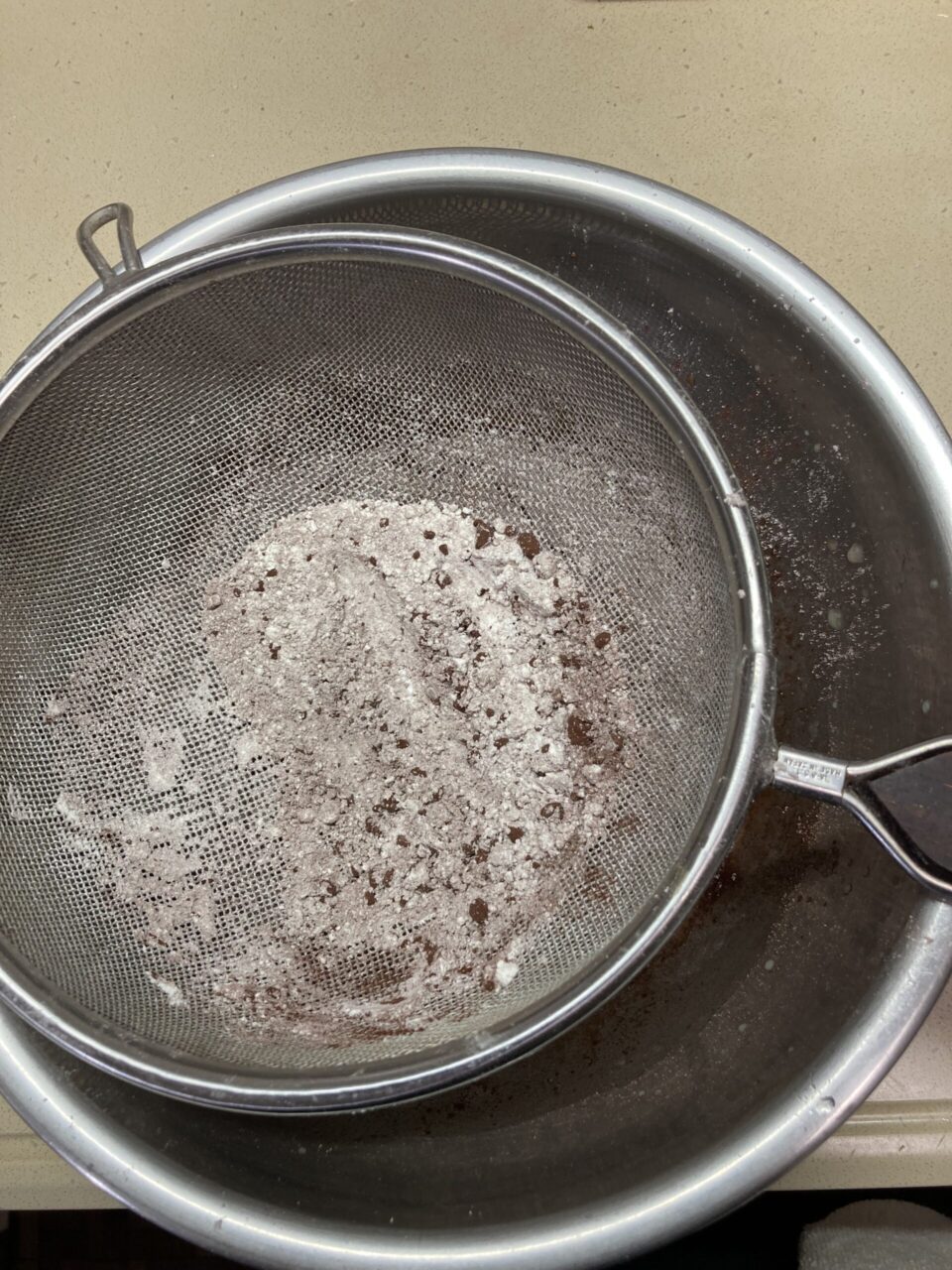 イ) ボールにBを入れて良く混ぜ合わせ、ふるったAを加えてさっくりと混ぜる。