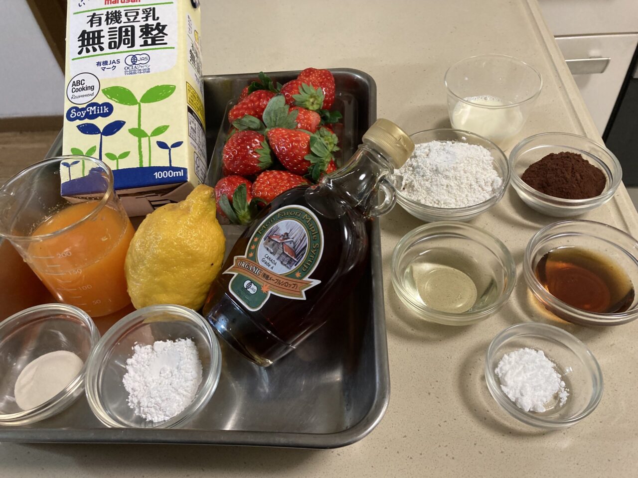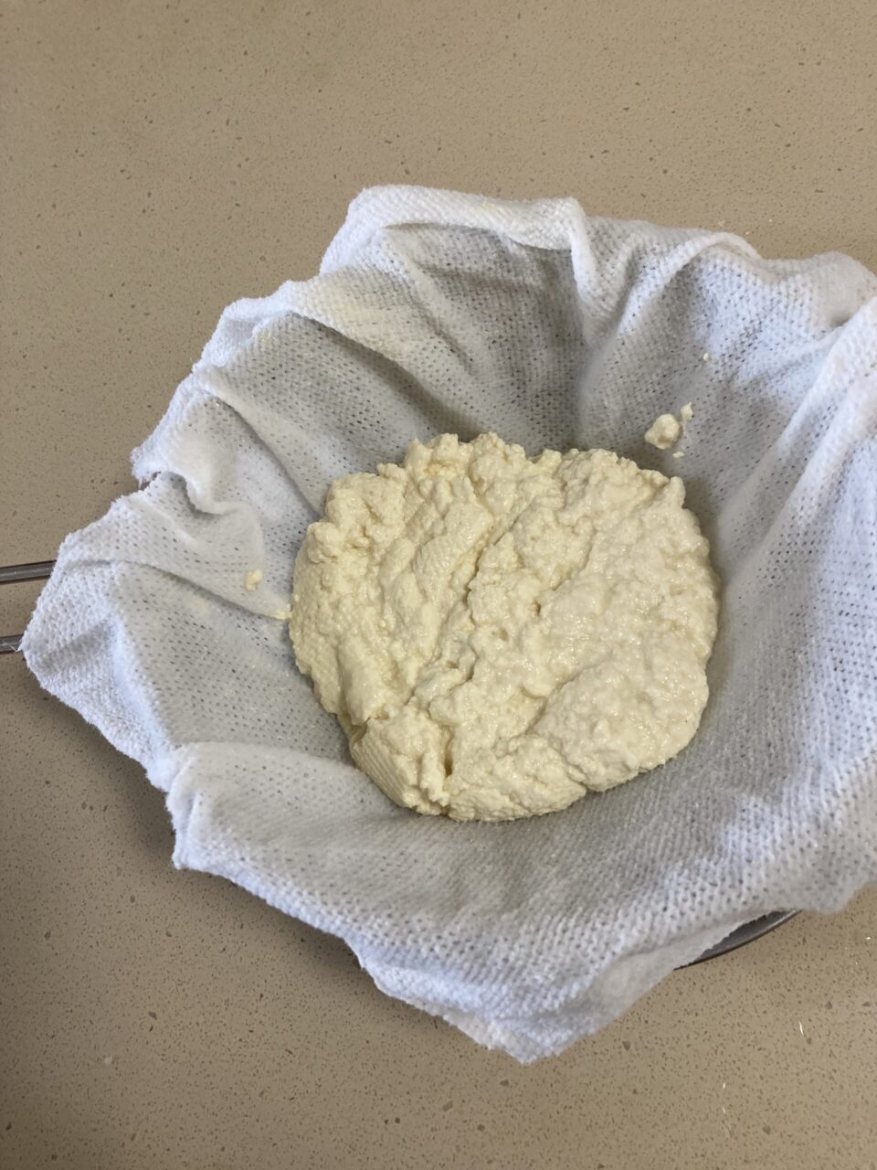 豆乳を60℃まで温め、レモンを加えてまぜ合わせて2~3分置き、分離してきたらざるにペーパーを敷いて流し入れ、半量になる位まで水分をしっかりと切る。
