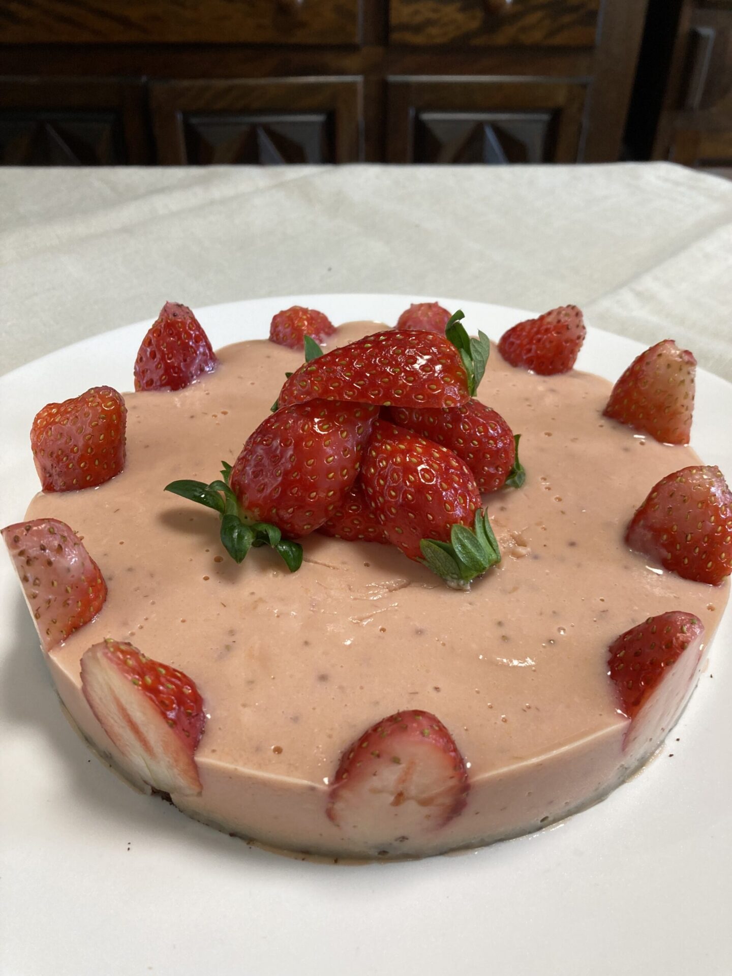 ケーキ型の側面にいちごの切り口を外側にして並べ、④を流し入れる。冷蔵庫で冷やし固め、型から外して上にいちごをトッピングする。いちごの風味豊かなケーキ。