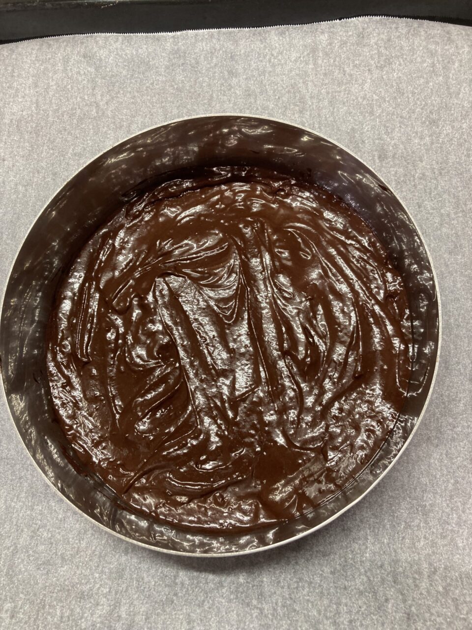ロ) ケーキ型(又はセルクル)にオーブンシートをひき、Aの生地を平らに流し入れ170℃-7~8分焼く。