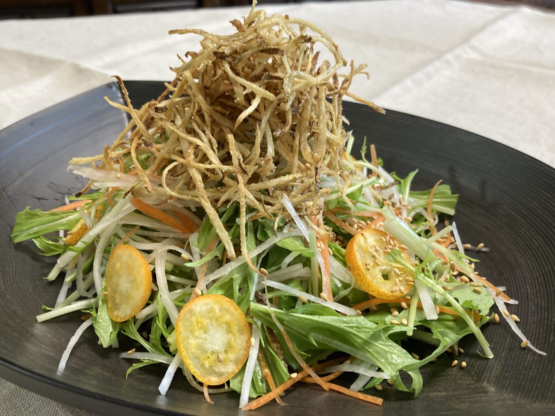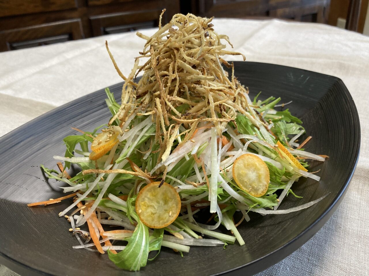 器に③をのせ、ごぼうときんかんをトッピングする。炒り胡麻をふりかける。風味豊かなサラダ。