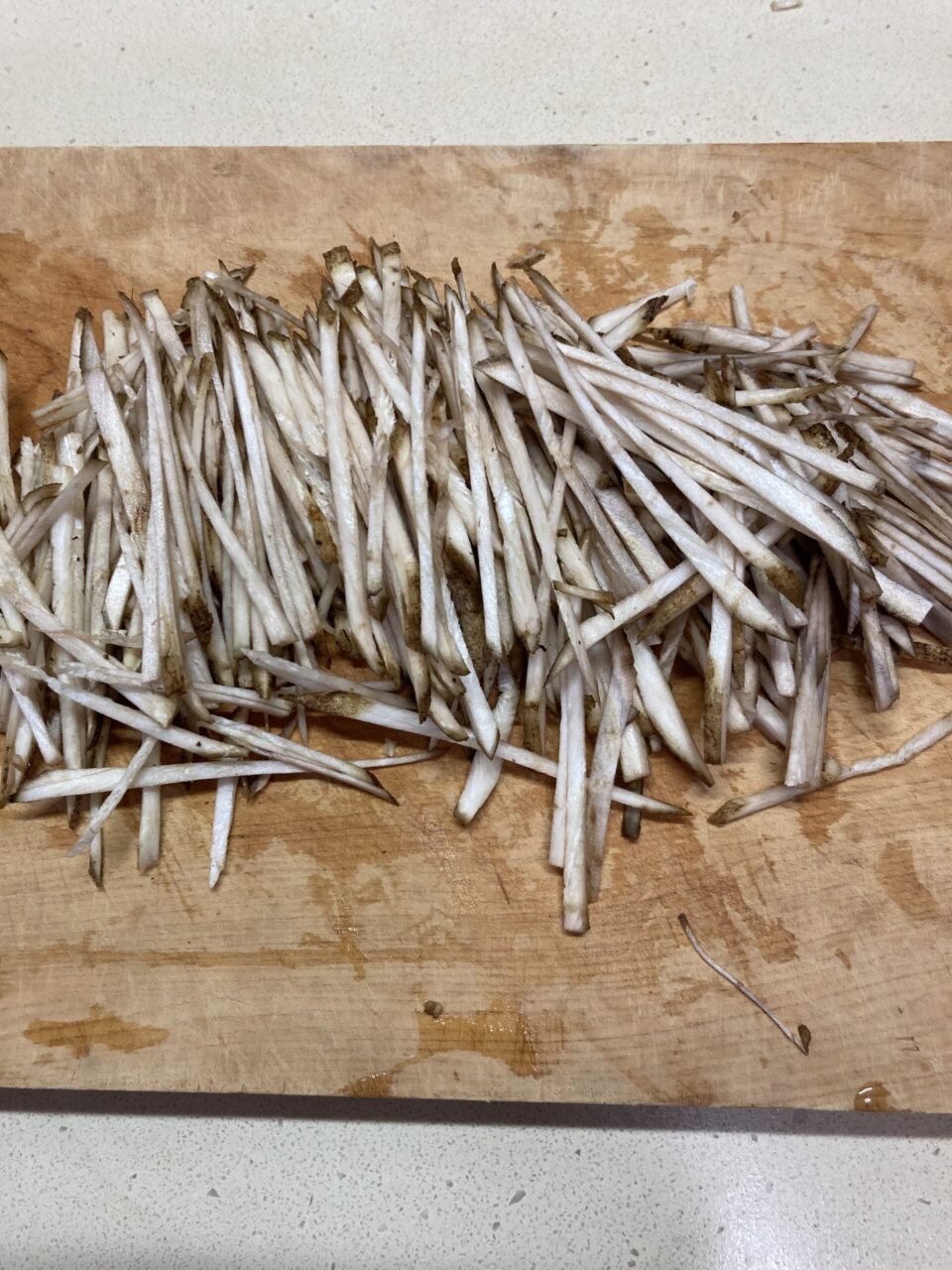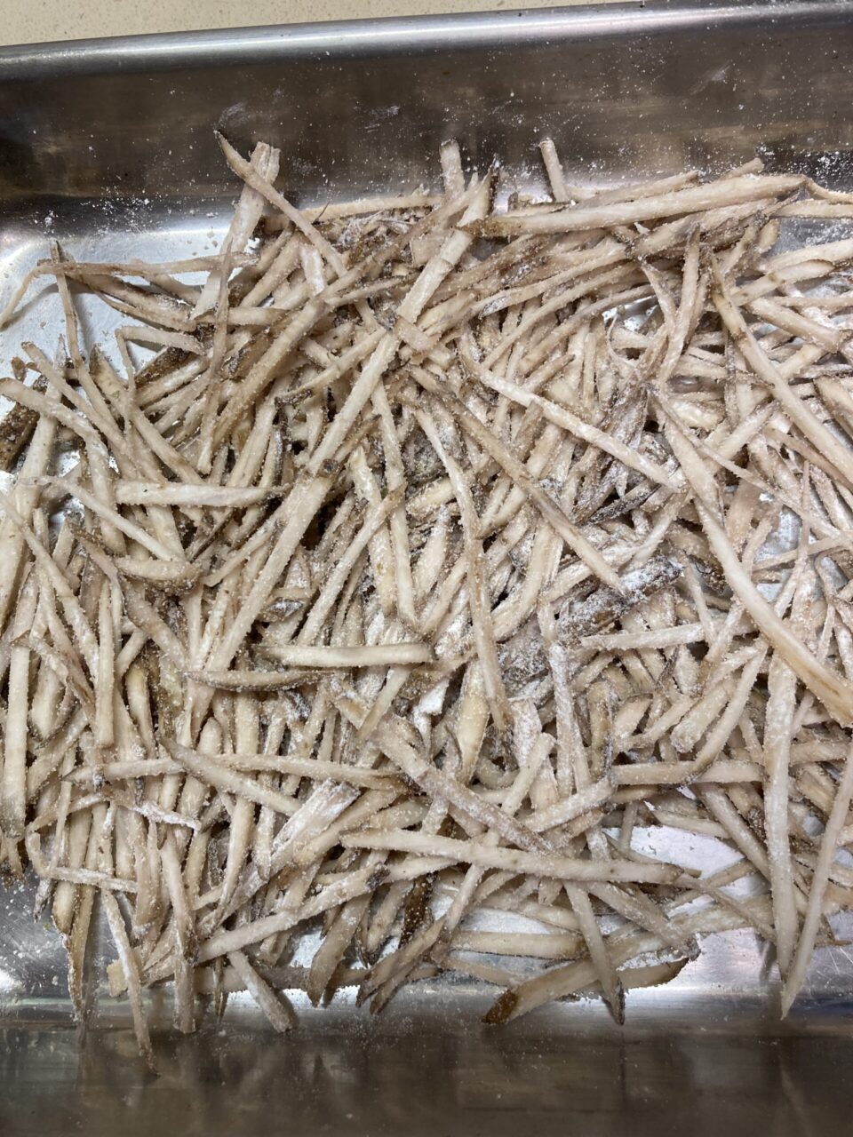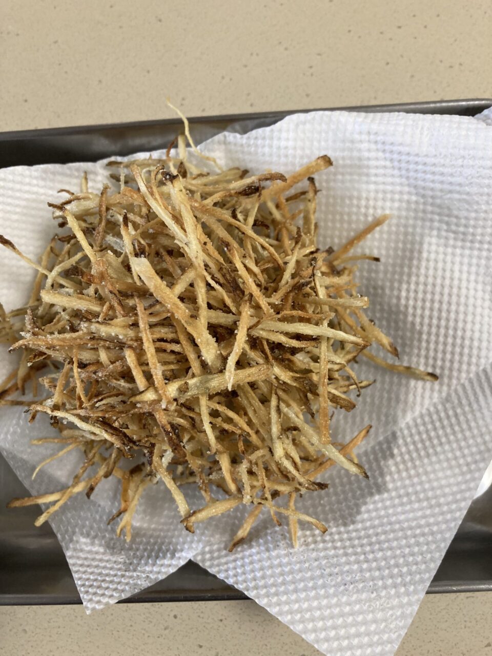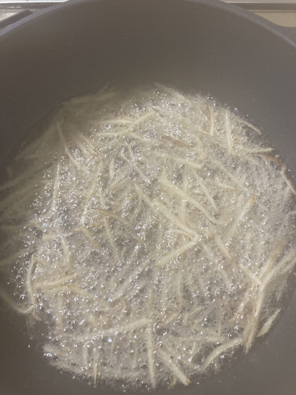 フライパンに油を2 cm位入れ、中火で3~5分ごぼうがカリッとするまで揚げて油を切っておく。