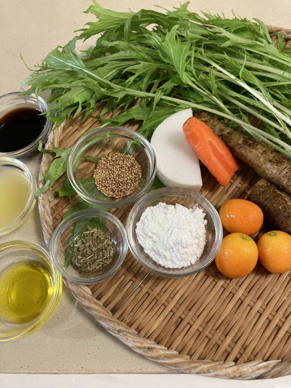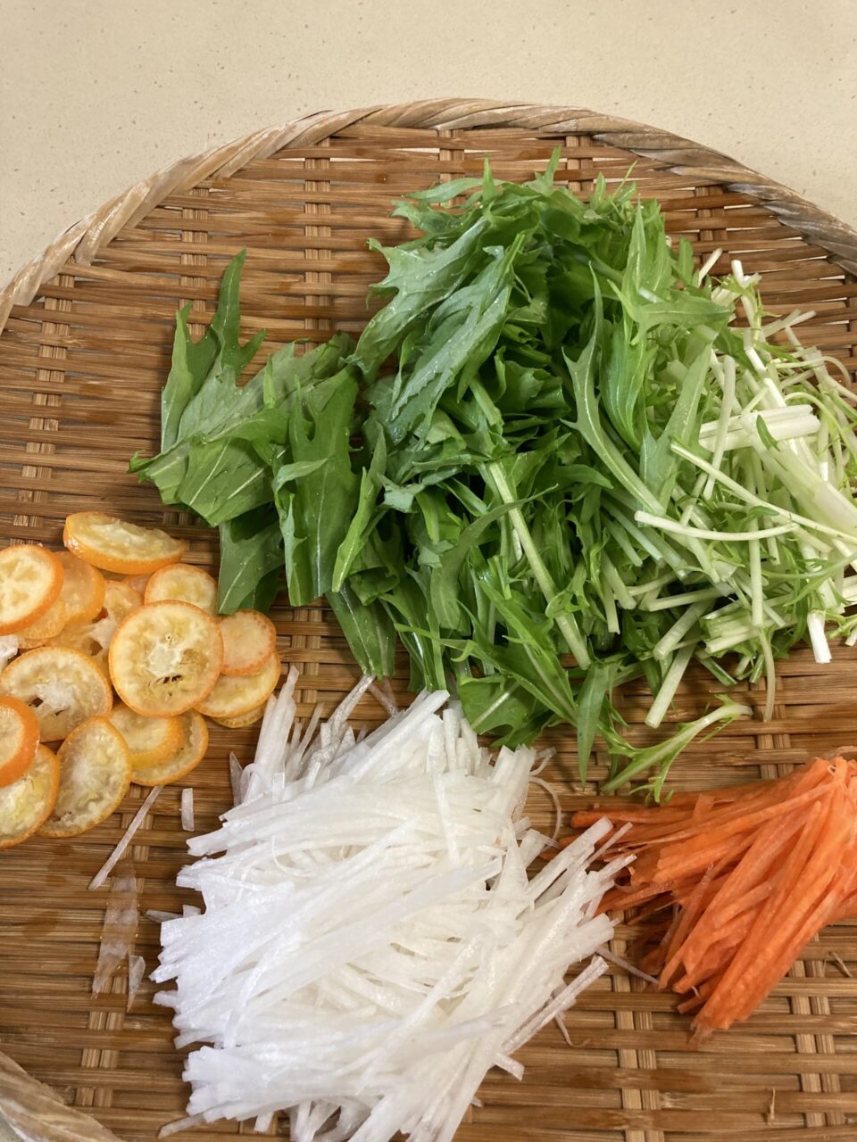 大根と人参は千切りにし、水菜は3~4 cmに切り、Bを加えて混ぜ合わせておく。