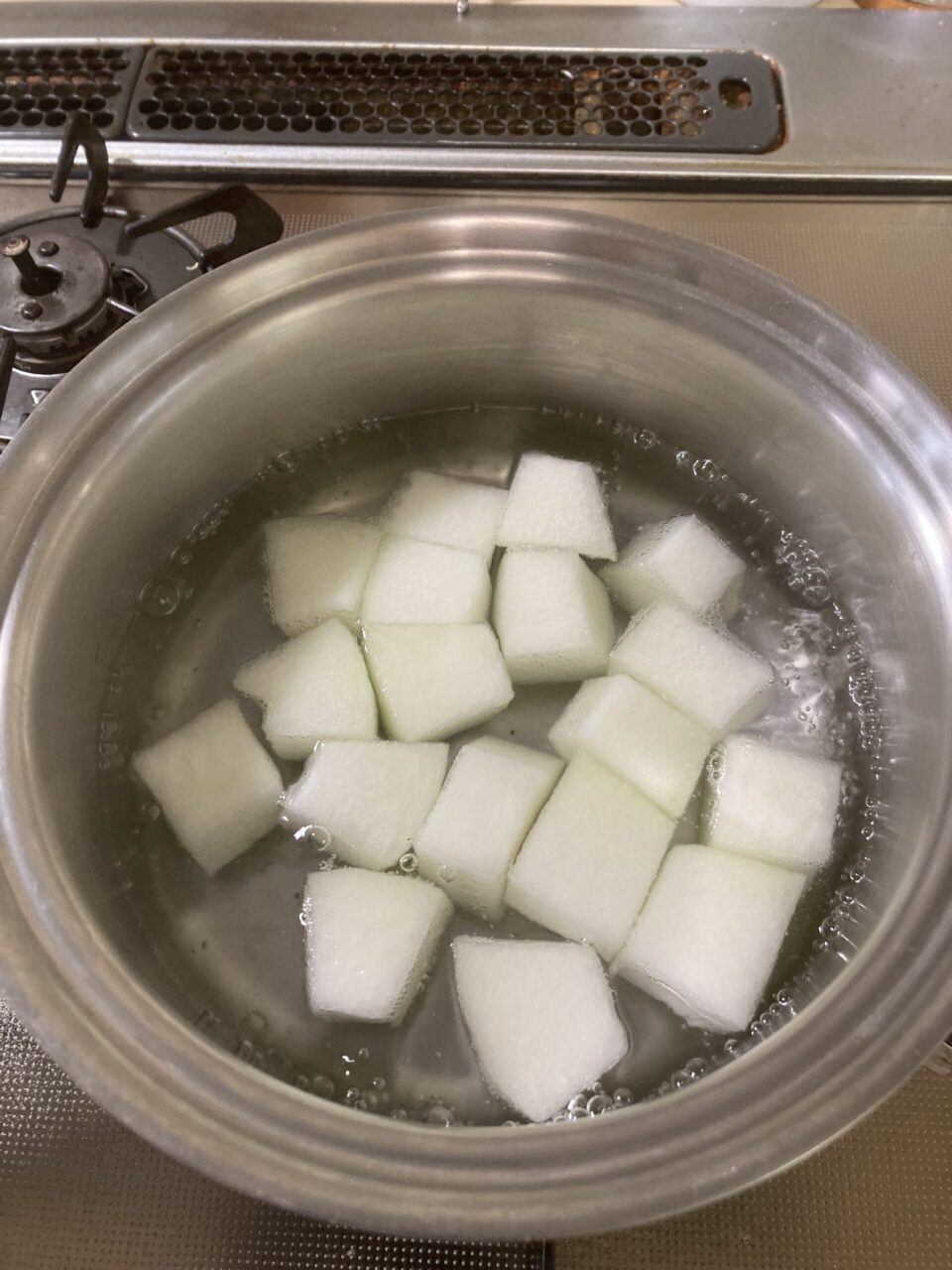 とうがんは皮をむいて種を取り除き、一口大に切って一度ゆでこぼす。