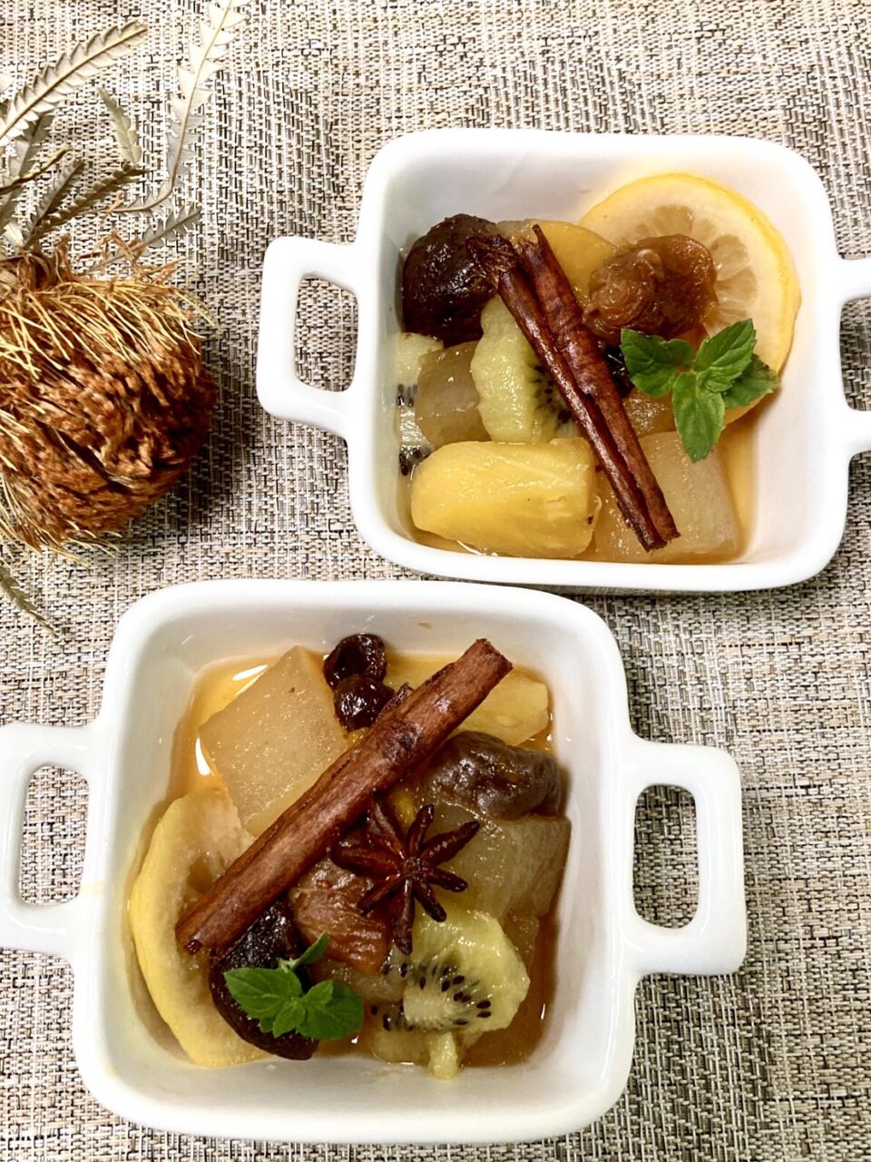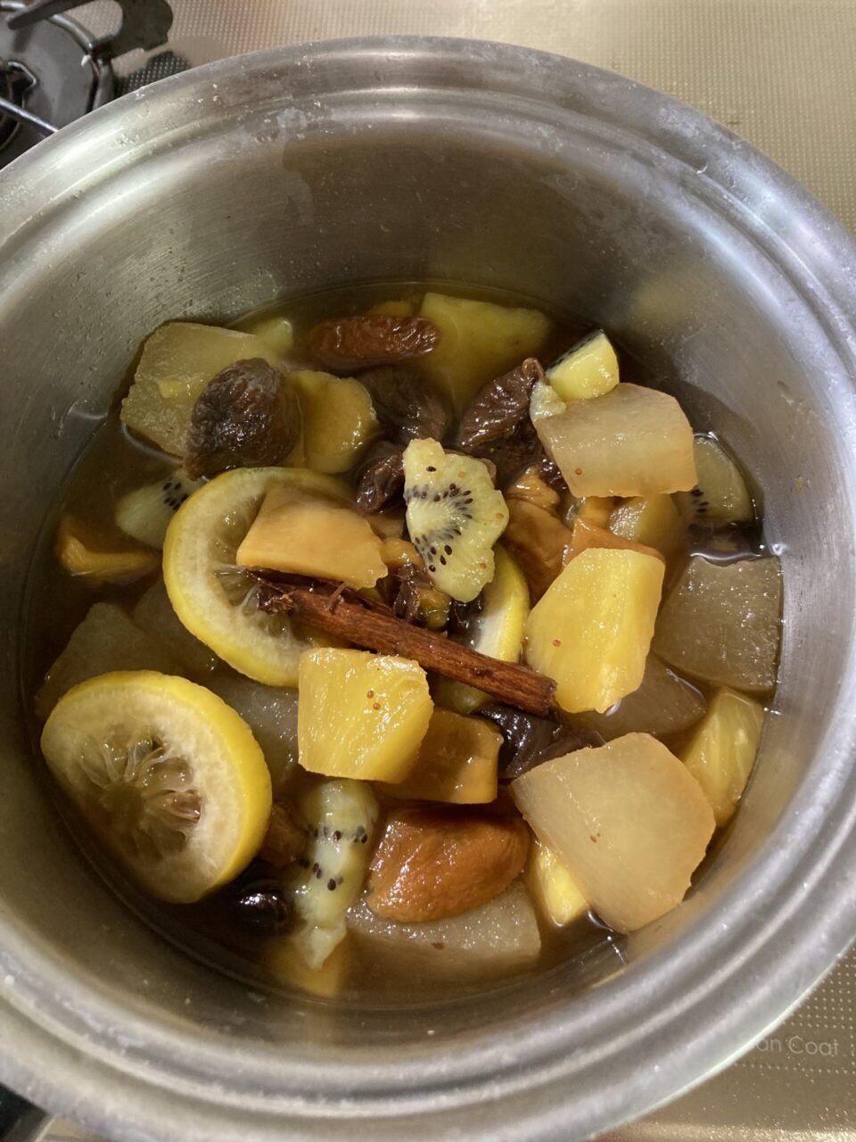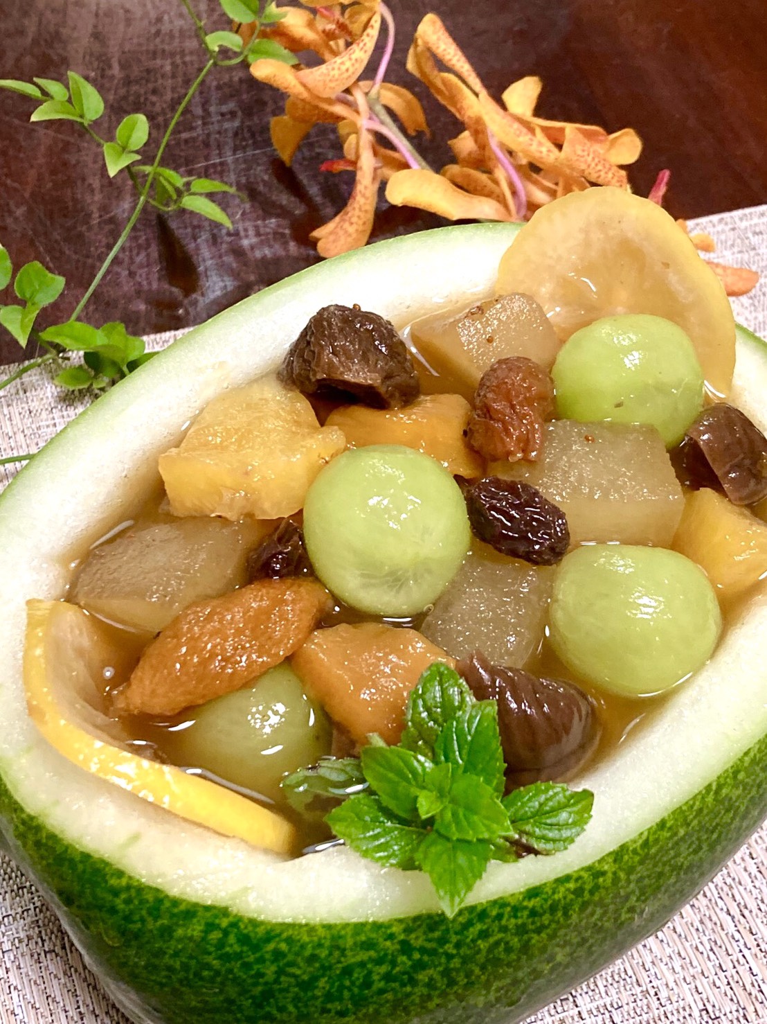 キュウィーフルーツは皮をむき、とうがんと同じ位の大きさに切る。パイナップルも皮をむいて同じように切る。鍋にAととうがん、ドライフルーツを入れて火にかけ、弱火で20分位煮る。途中でキュウィーフルとパイナップルを加えて更に5~6分煮る。