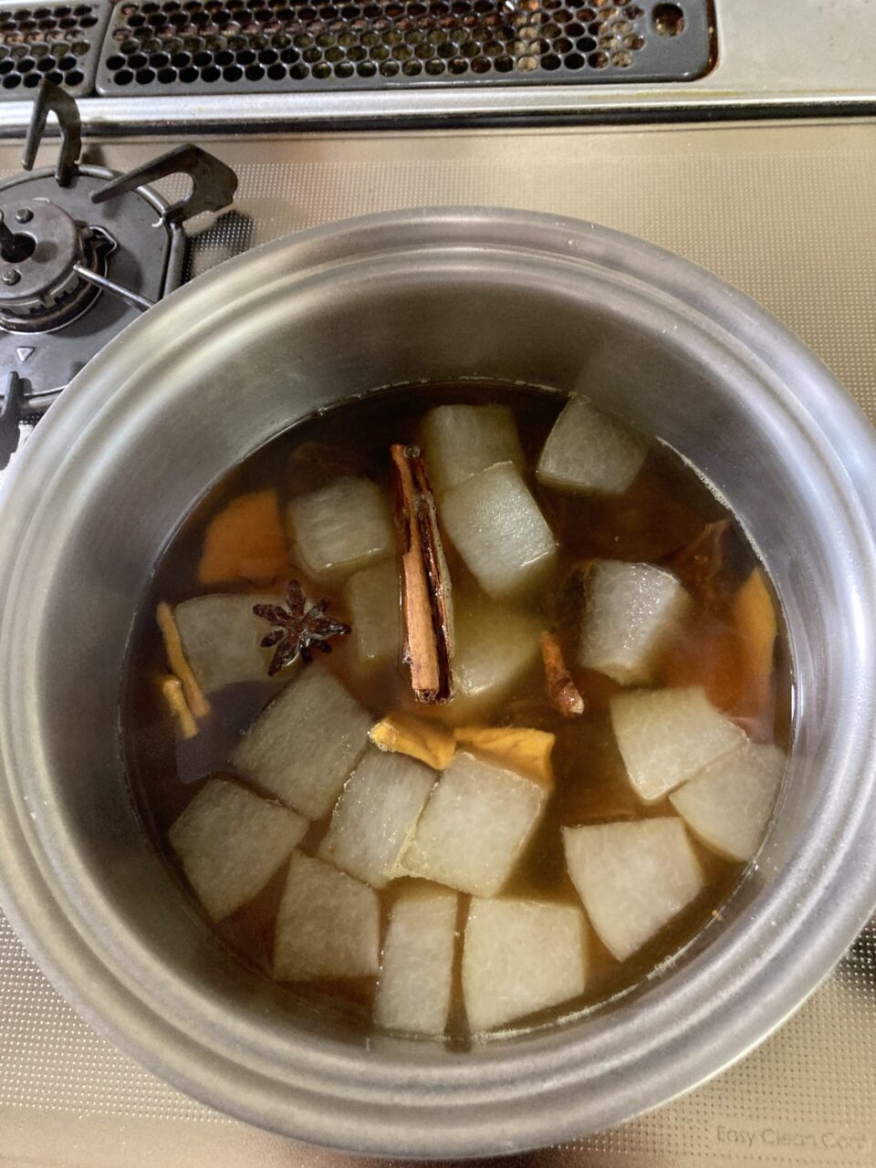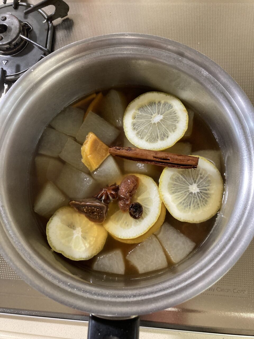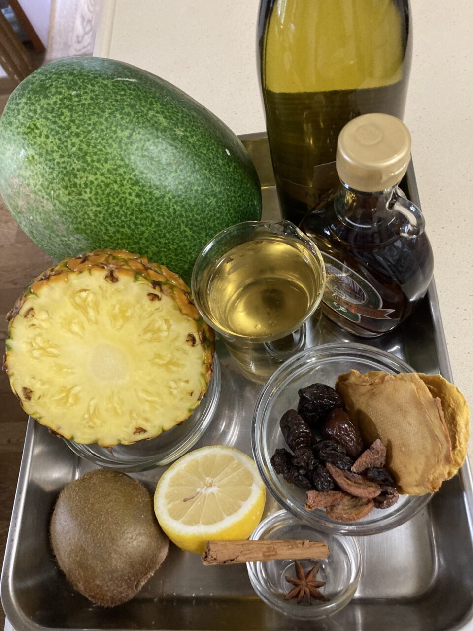 キュウィーフルーツは皮をむき、とうがんと同じ位の大きさに切る。パイナップルも皮をむいて同じように切る。鍋にAととうがん、ドライフルーツを入れて火にかけ、弱火で20分位煮る。途中でキュウィーフルとパイナップルを加えて更に5~6分煮る。