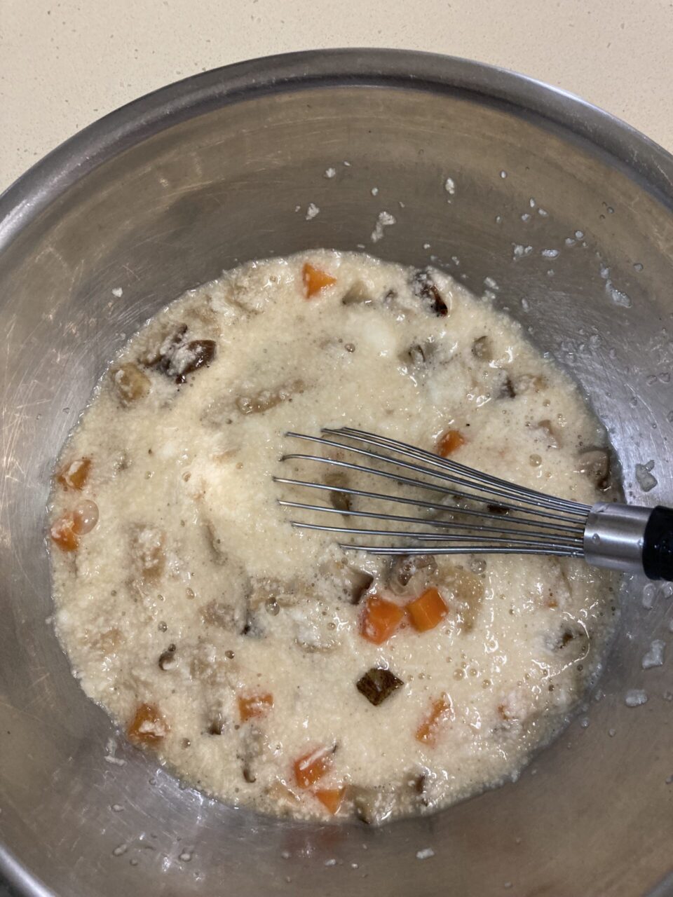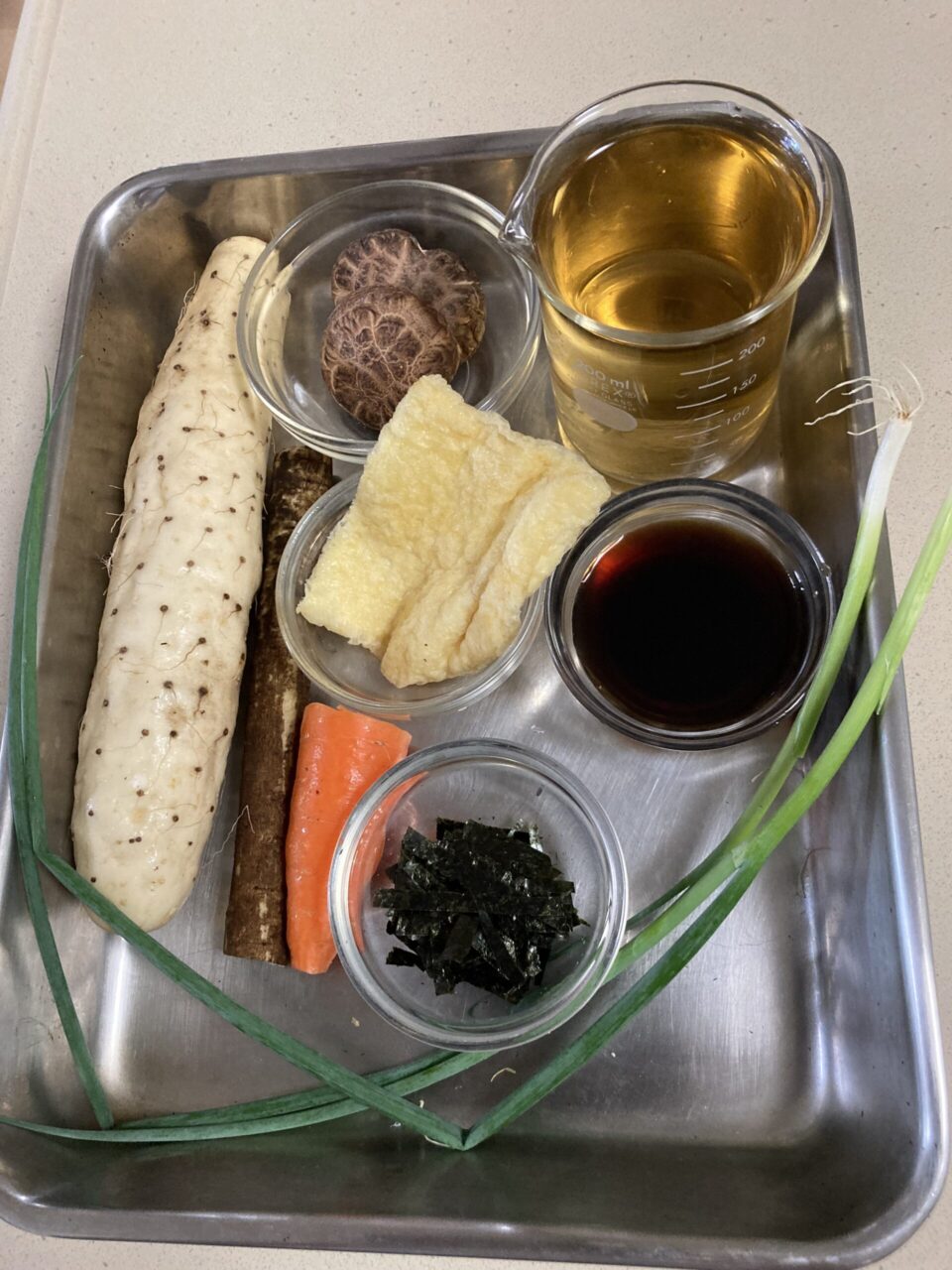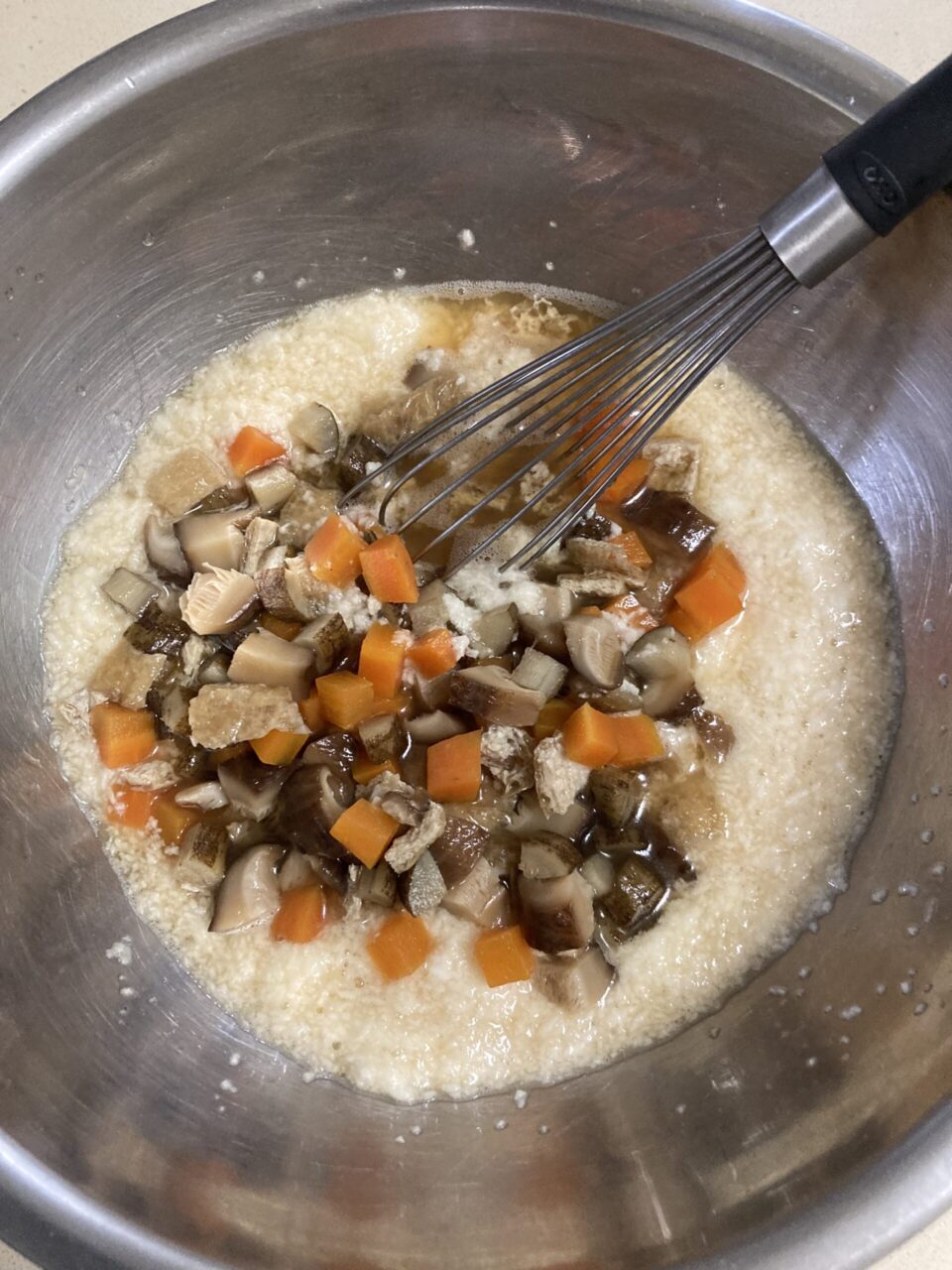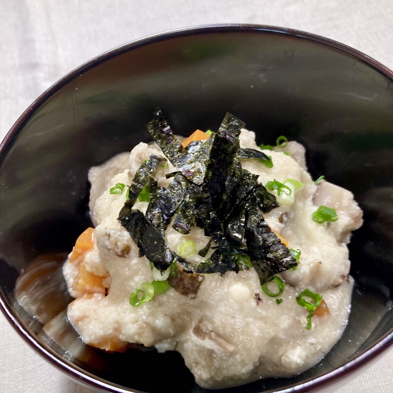 大和芋はすりおろして②の煮汁を少しづつ加えて滑らかにし、具も加えて五目とろろを作る。