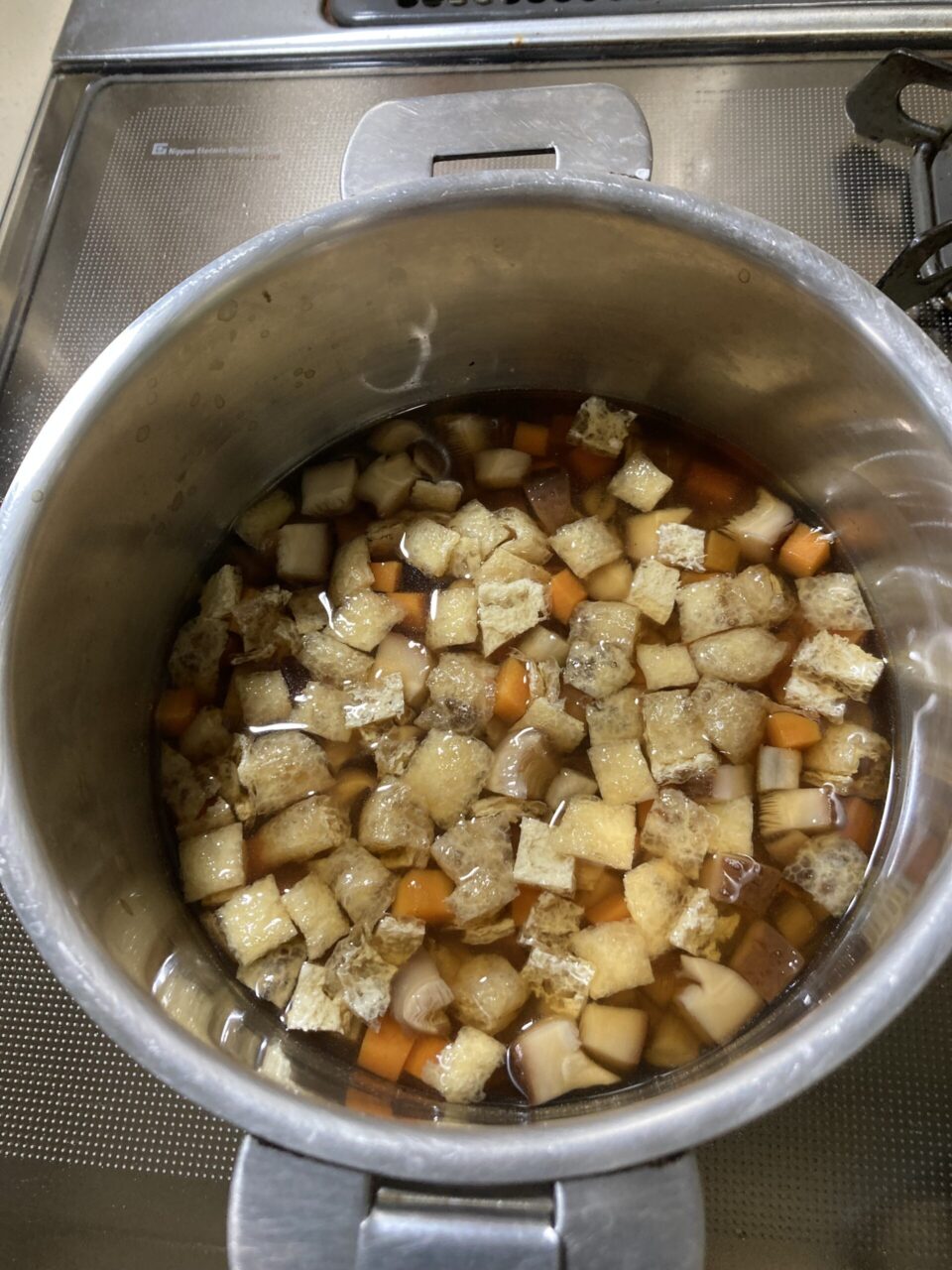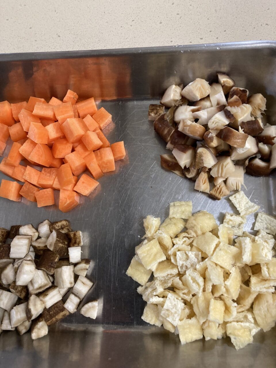 干ししいたけは戻して、ごぼう、人参、油揚げはそれぞれ5~6mm角に切る。