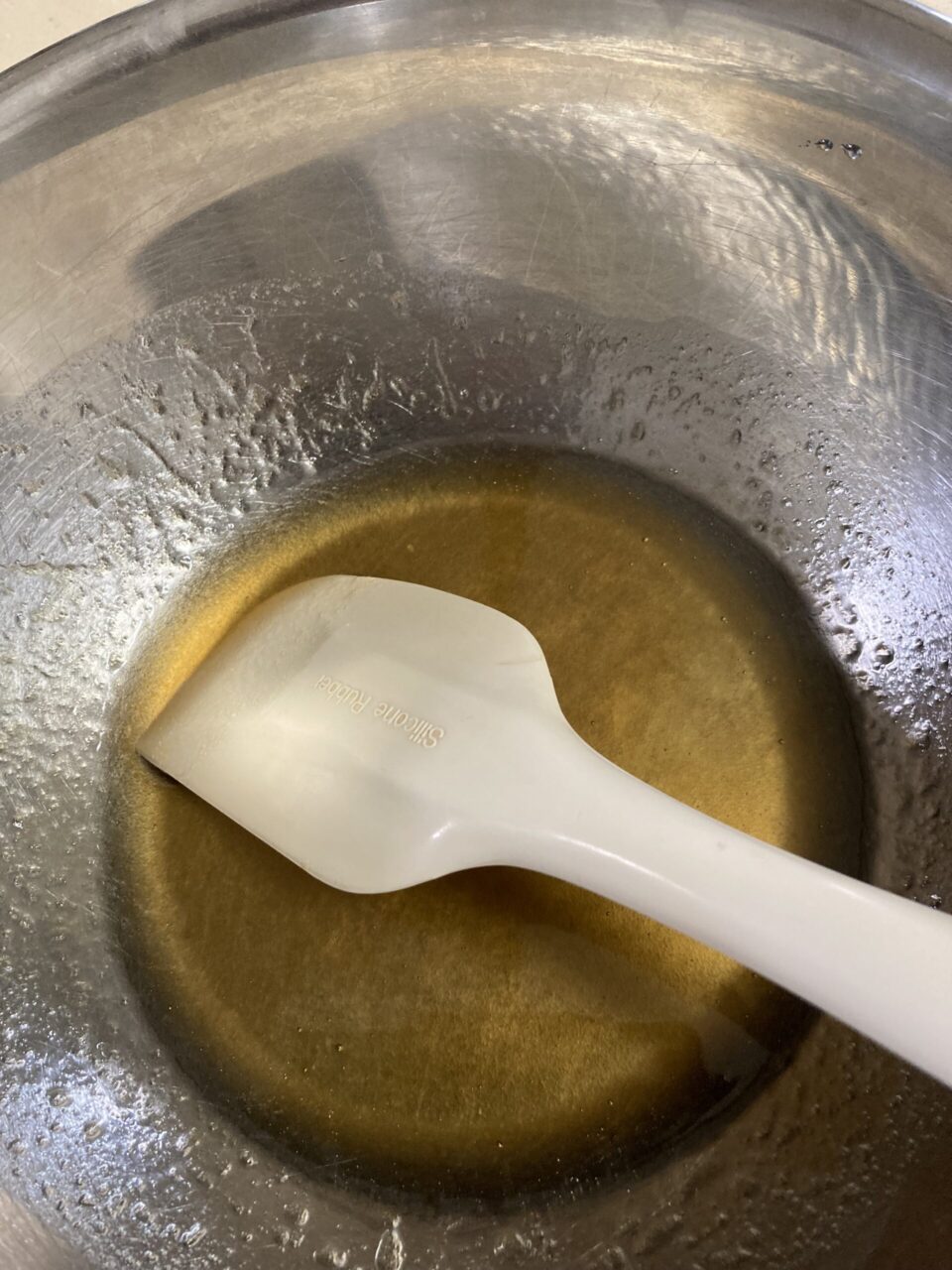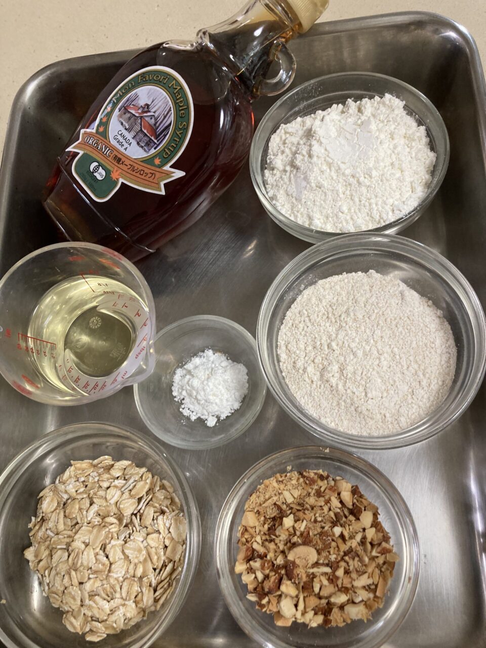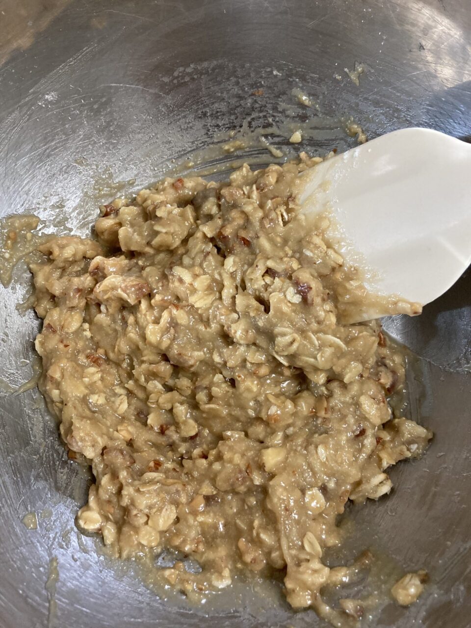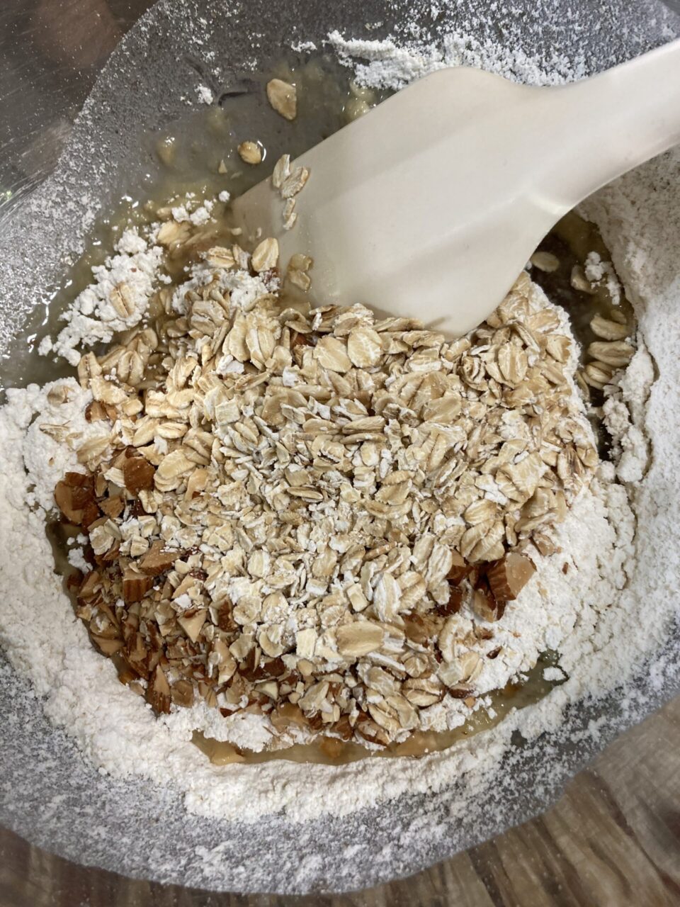 ①にふるったAとオートミール、ローストアーモンドを加え、粉が無くなるまで軽く混ぜる。混ぜ過ぎないようにする。