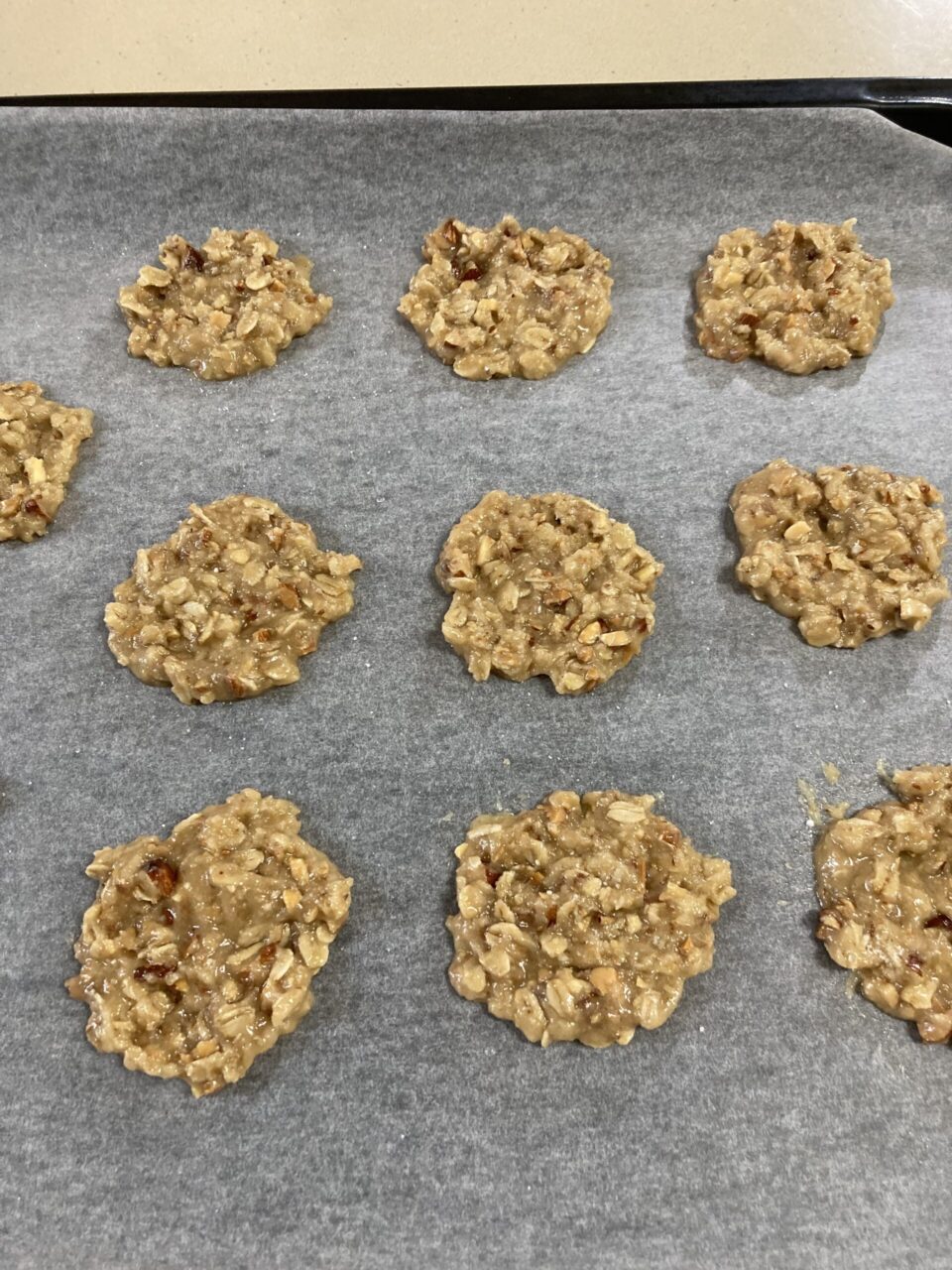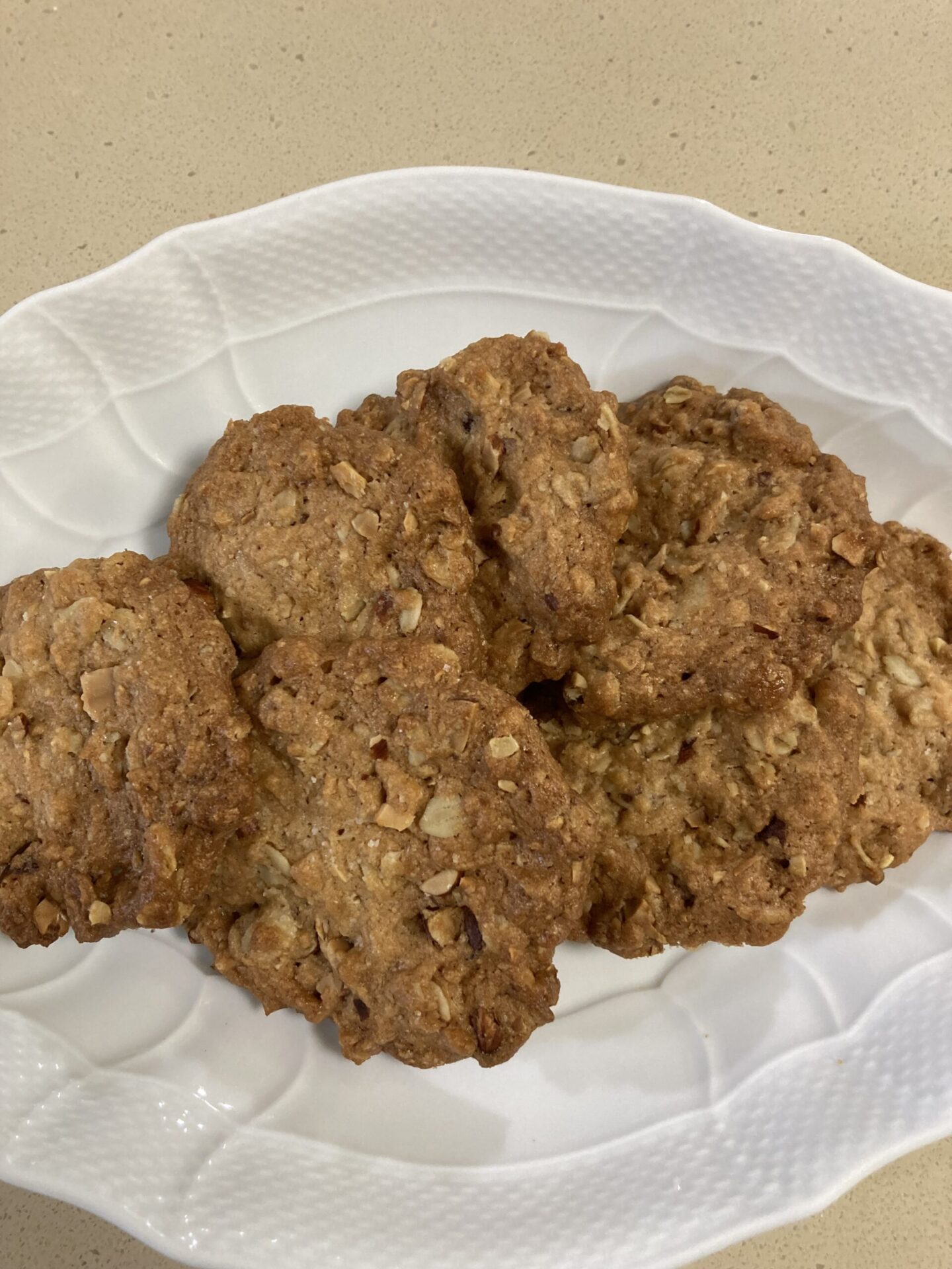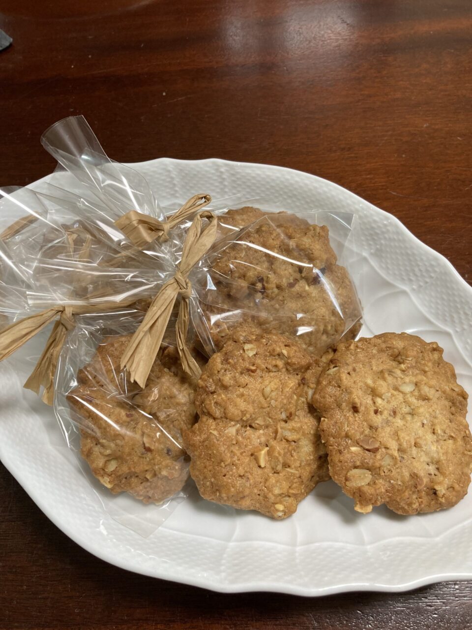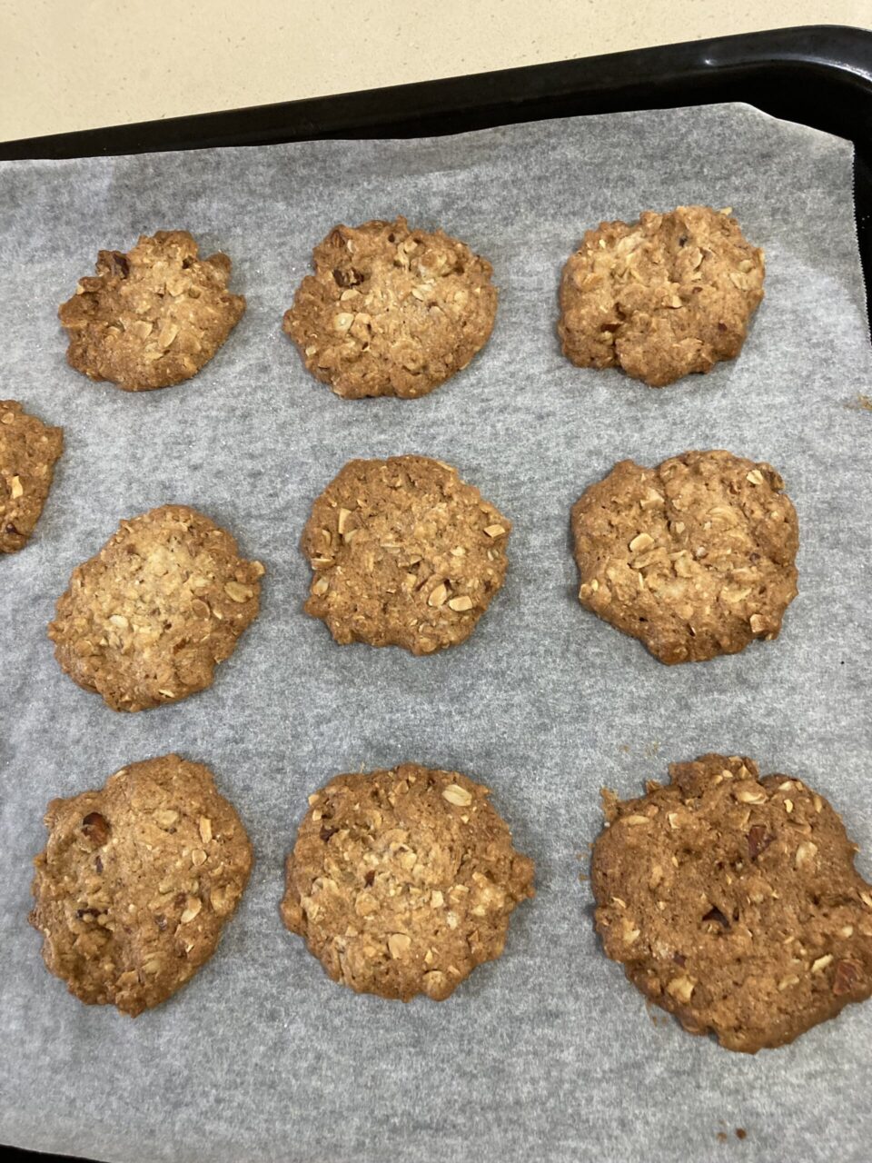 天板にオーブンペーパーを敷き、①を丸く平らに広げ(直径5 cm位)、180℃のオーブンで7分焼き、160℃に下げて5~6分焼く。