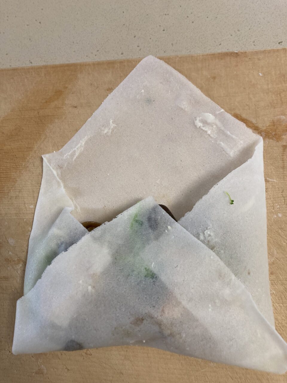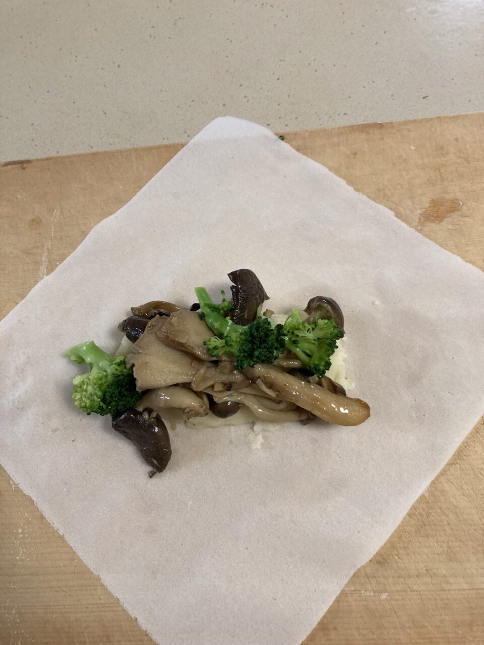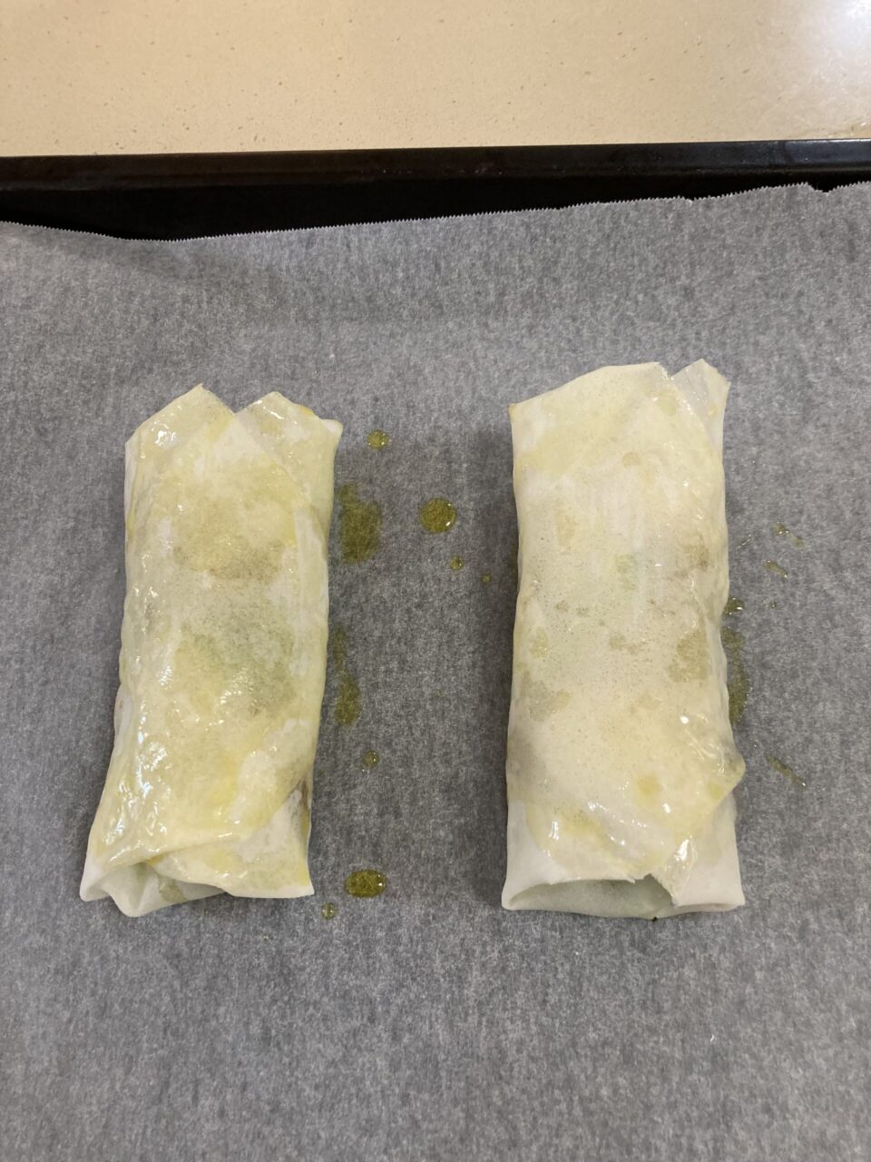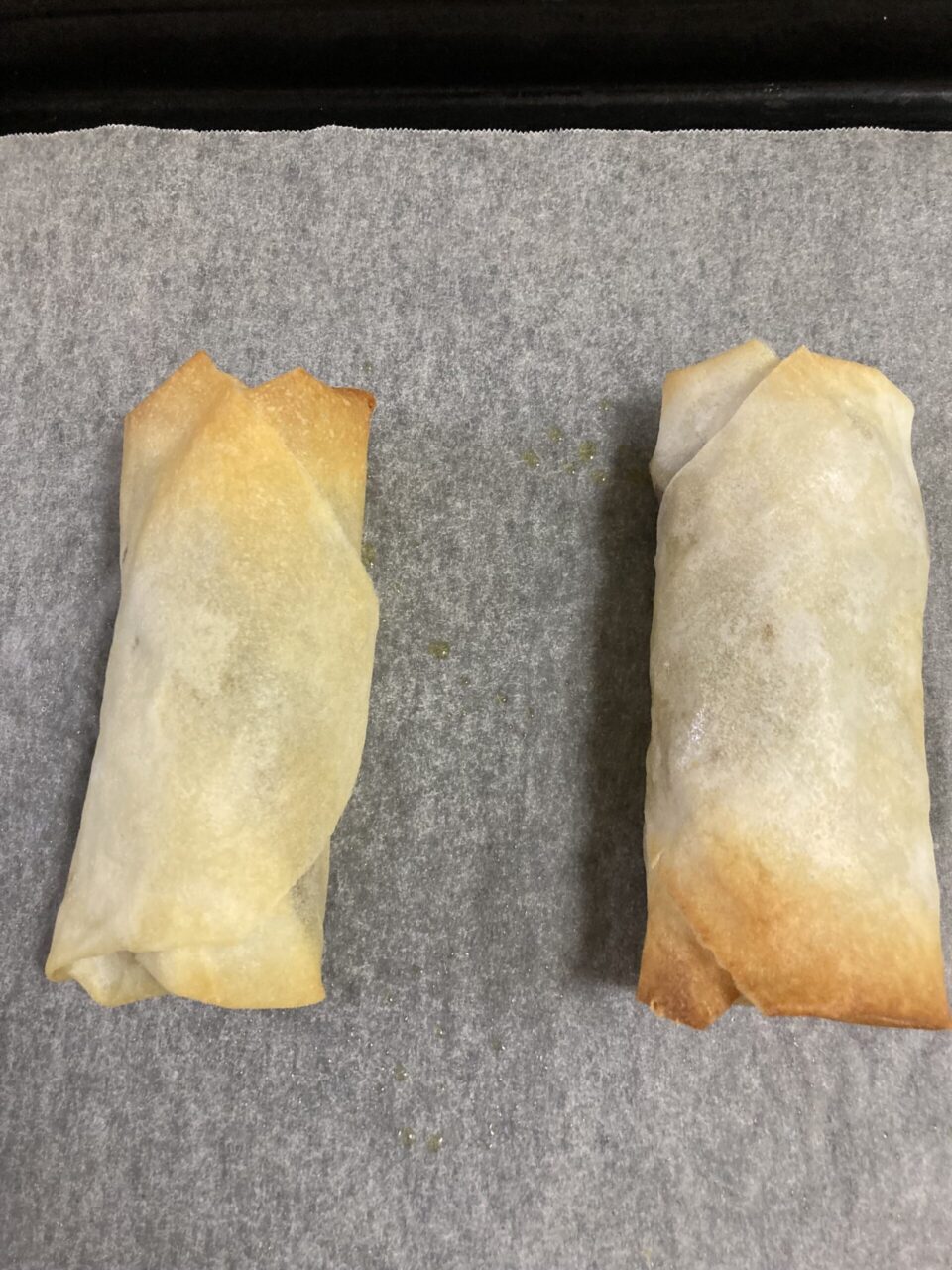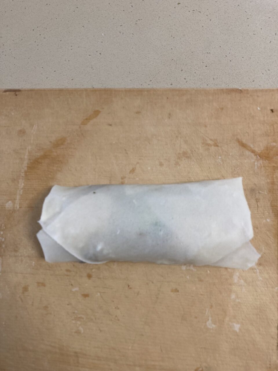 春巻の皮を広げ、中央に②を広げてのせ、その上に①、ブロッコリーを置き、ふんわりと包む。最後を水溶き小麦粉で止める。