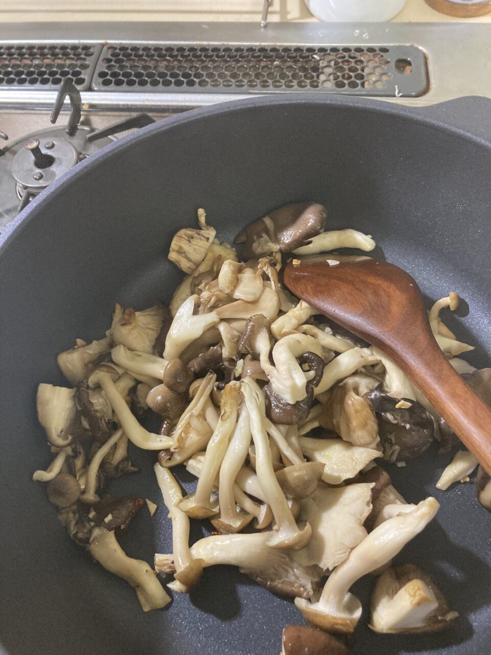 きのこは石づきを切り落とし、適当な大きさに切る。フライパンにオリーブオイルとにんにくを入れ、香りが出たらきのこを加え、強火で炒めて塩、こしょうする。