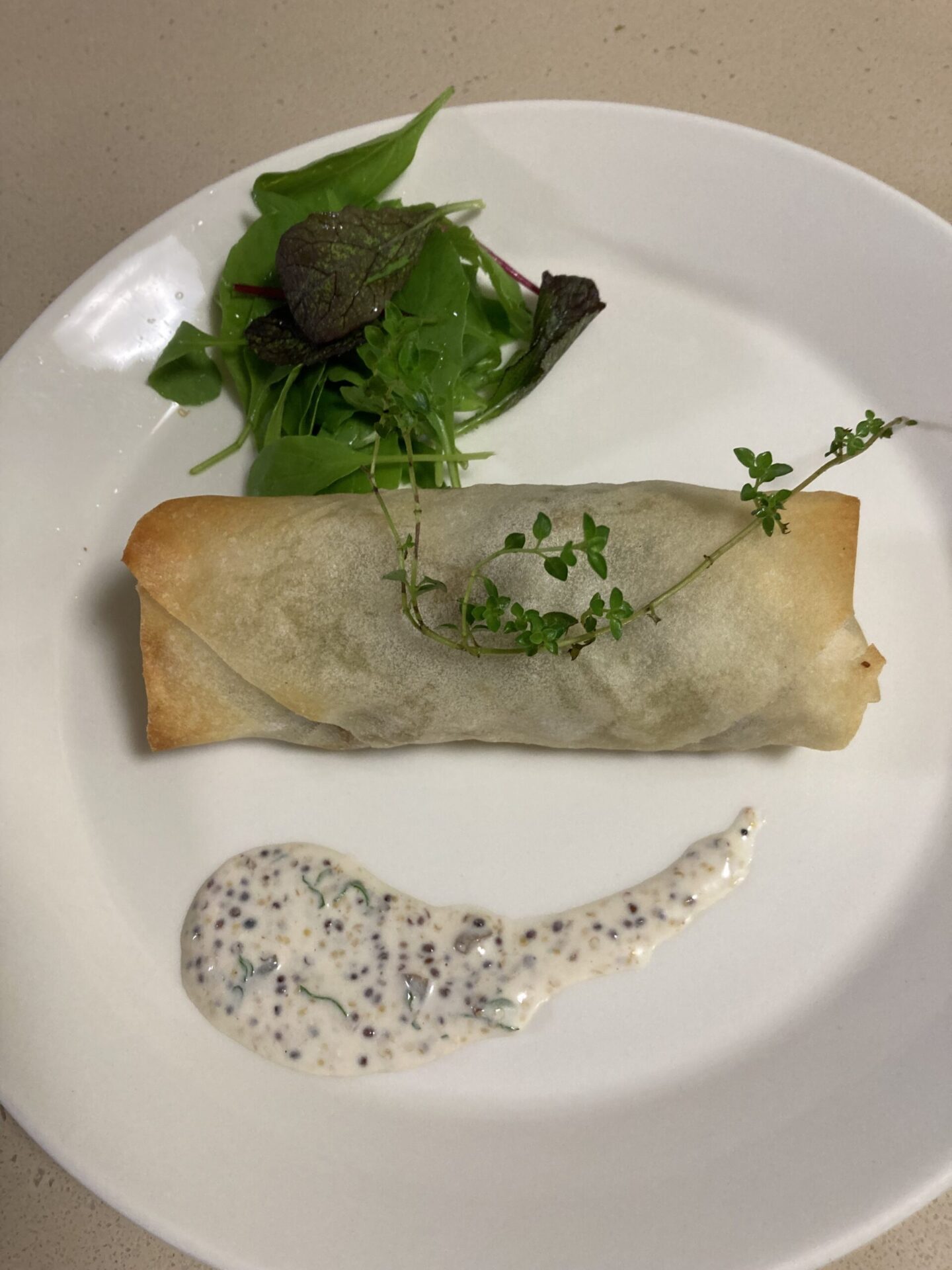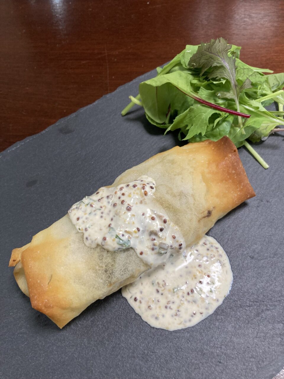 皿に盛り、マスタードソースを添え、ハーブを飾る。きのこ類のうまみを閉じ込める。