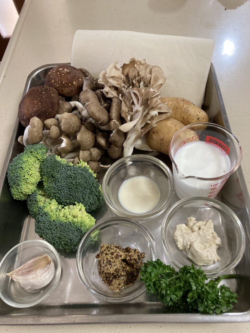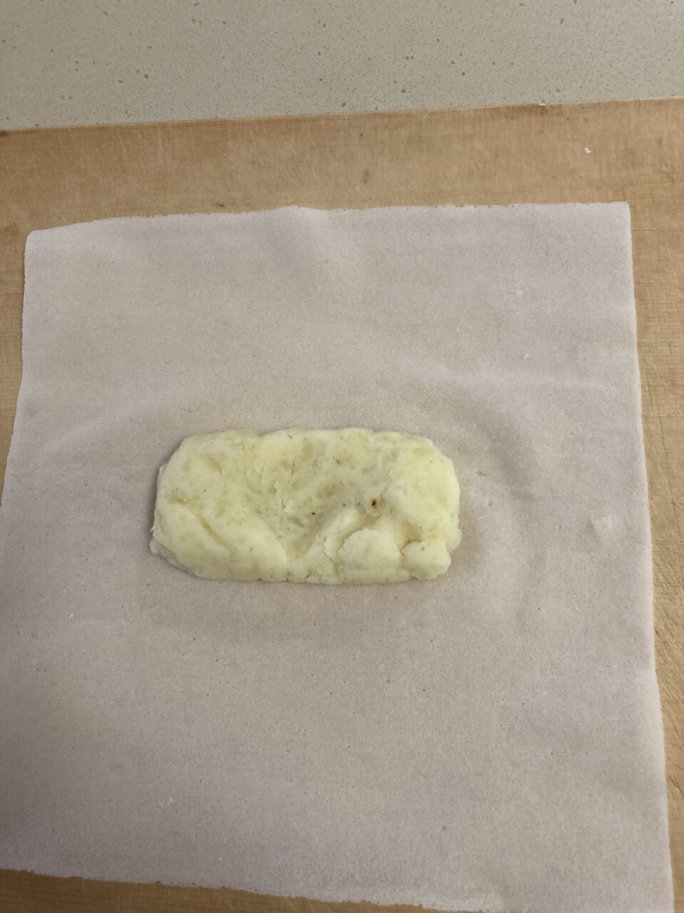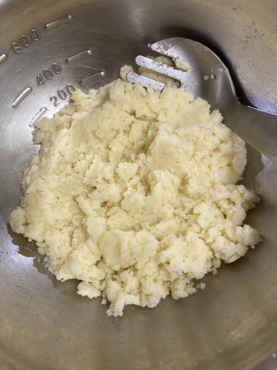 じゃが芋はゆでてマッシュし、オリーブオイル、豆乳を加えてマッシュポテトを作り、塩、こしょう少々する。