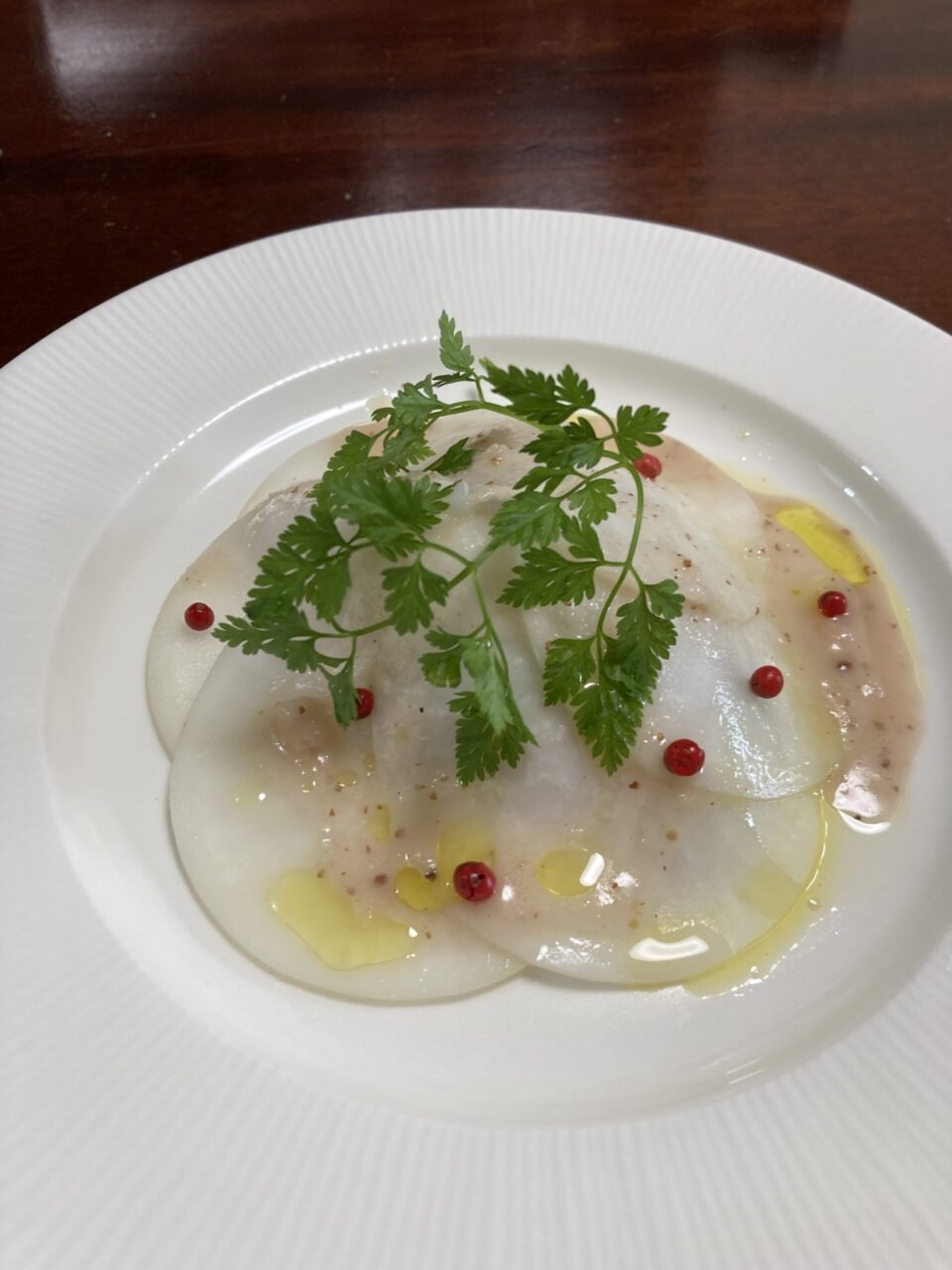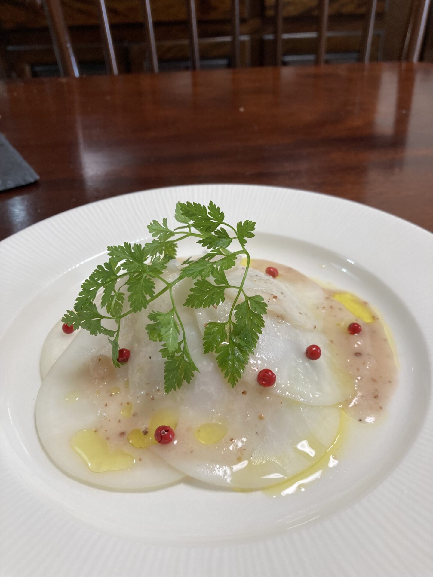 皿に③をこんもりと置き、上にかぶの薄切りを5~6枚重ならないよいうに並べ、上から残りのドレッシングをかけ、ピンクペッパーとセルフィーユを飾る。簡単なのにおしゃれな前菜。