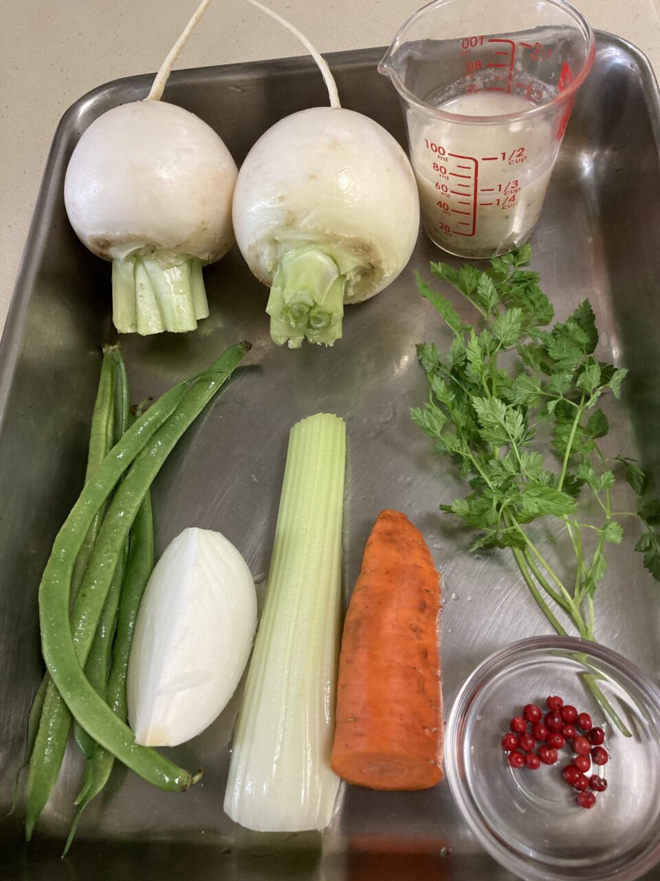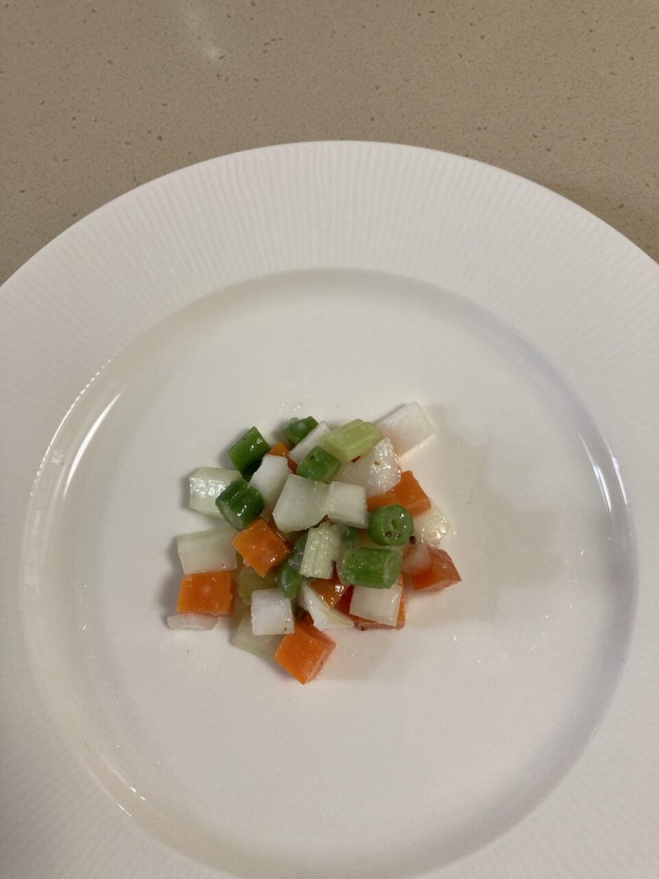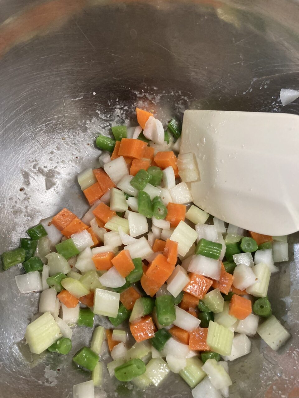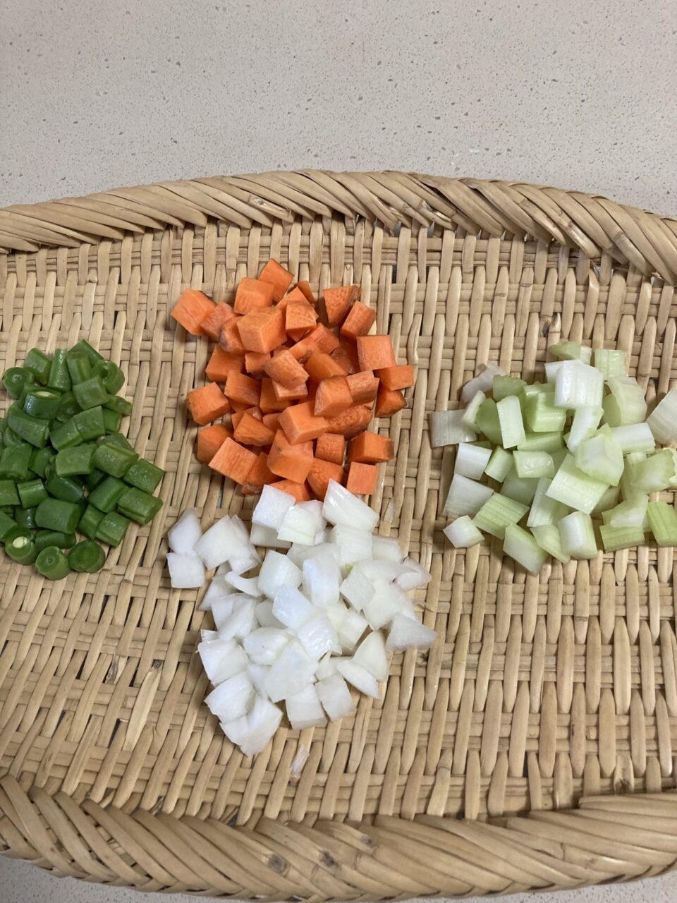 人参、セロリ、さやいんげんは7~8mm角に切ってゆでておく。セロリ、玉ねぎも同じ位の大きさに切っておく。