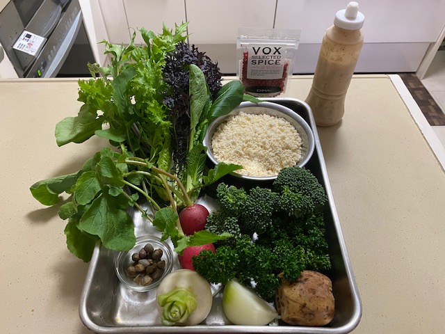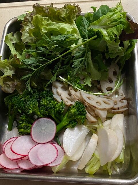 かぶは串切りにて塩少々し、しんなりしたら水分を取っておく。ラディッシュは薄切りにする。他の野菜は食べやすい大きさに切っておく。