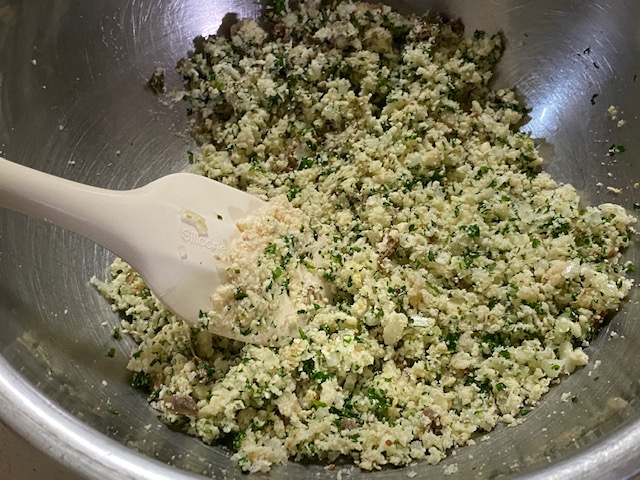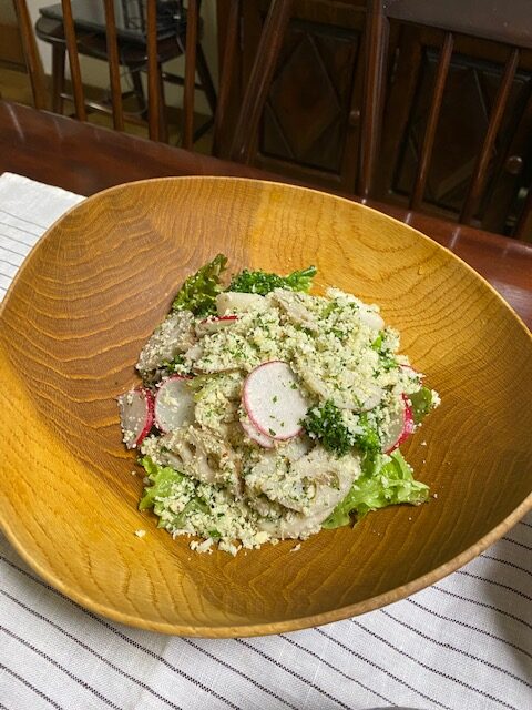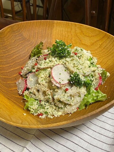 おからは乾煎りし、温かい内にドレッシング、玉ねぎ、パセリ、ケッパー、塩、コショウと合わせておく。
