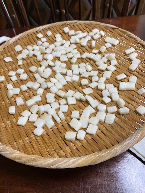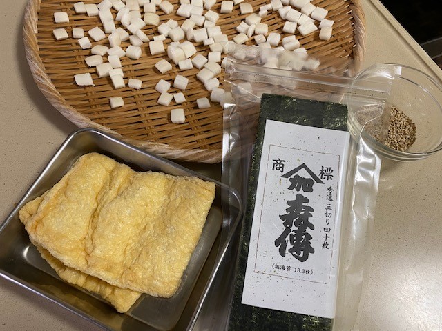 大根の皮は1 cm角位に切る。薄揚げも同じ位の大きさに切っておく。