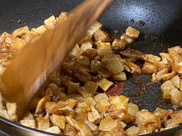 フライパンに胡麻油を熱し、大根の皮を炒める。じっくりと少々焦げ目を付く位まで炒めたら、薄揚げを加えてさらに炒め、Aを回しかける。