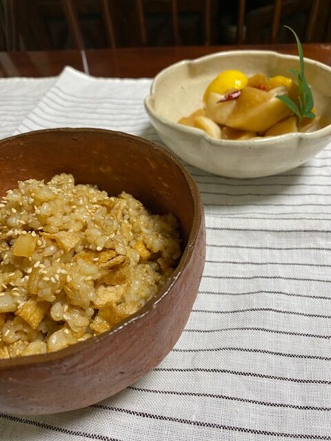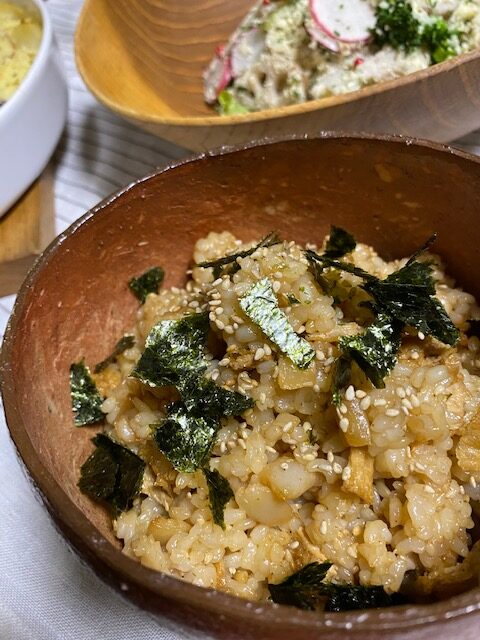 玄米が温かいうちに②と炒り胡麻を加えて混ぜ合わせ、器に盛りもみのりを散らす。大根の甘味が堪能できる。