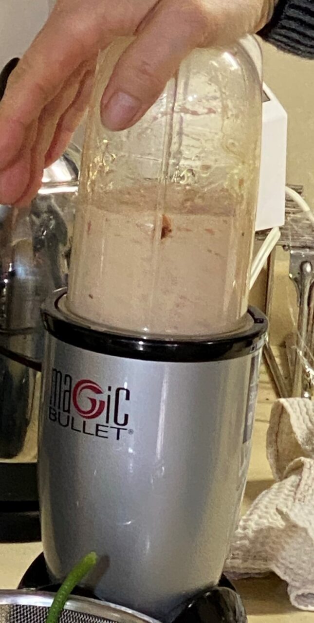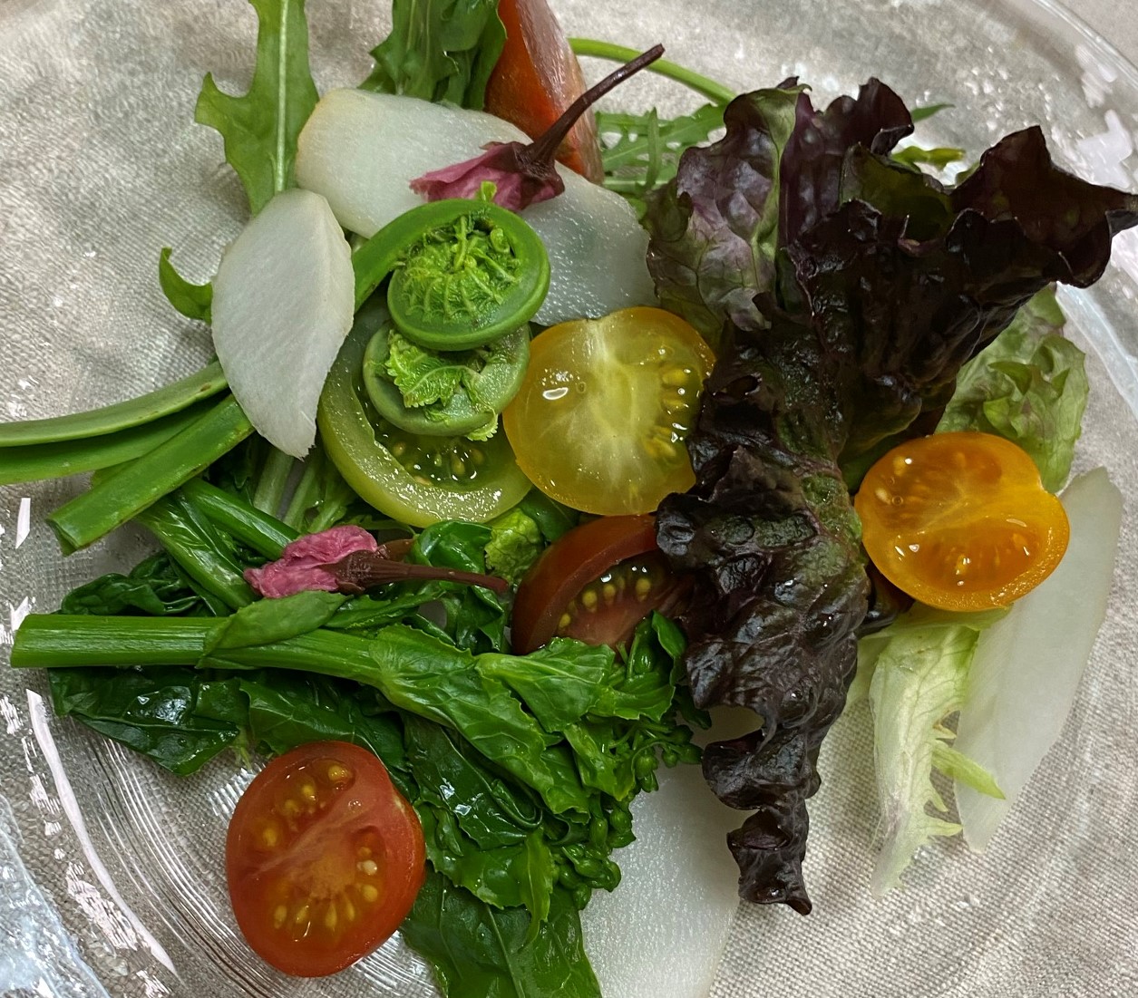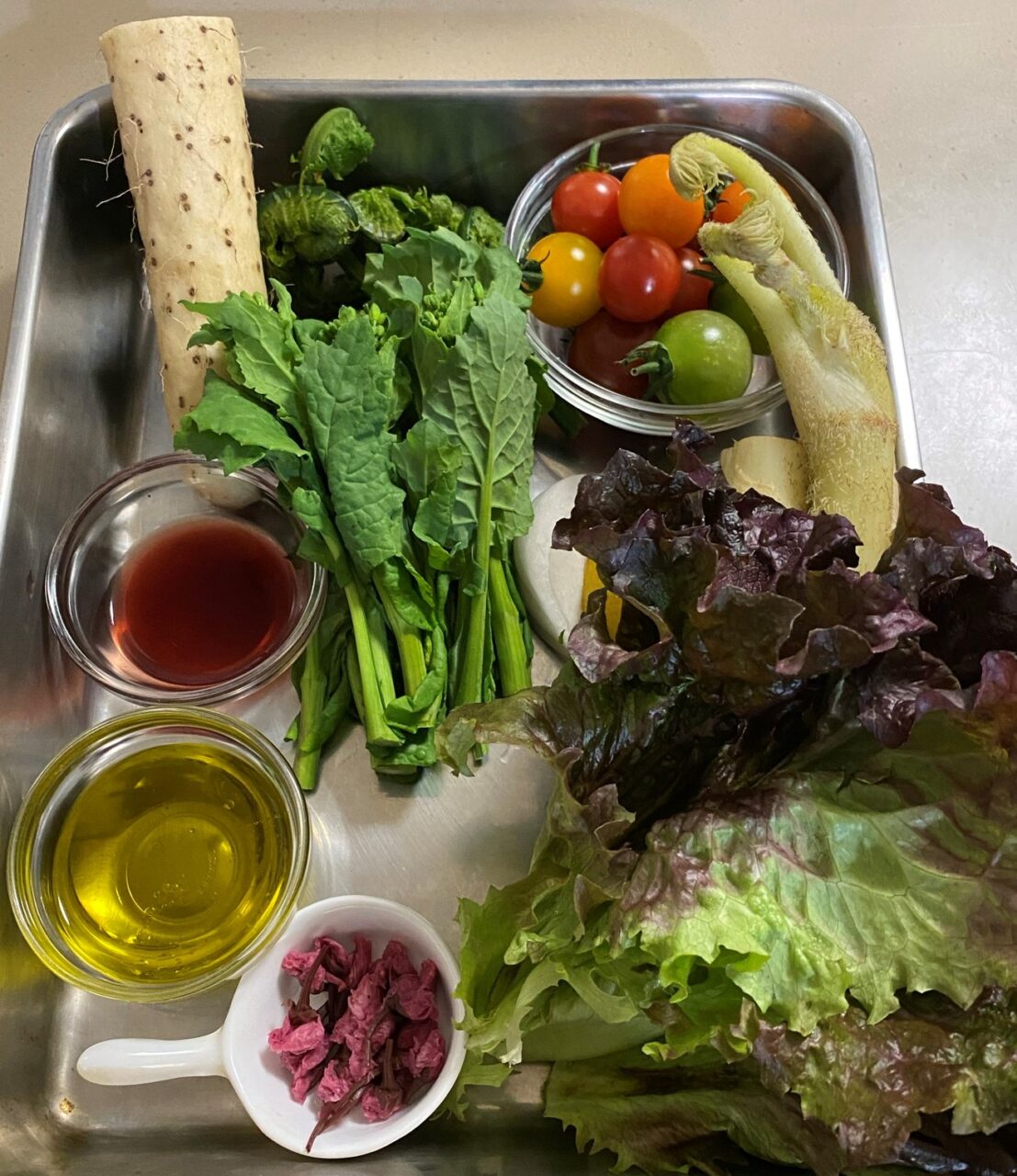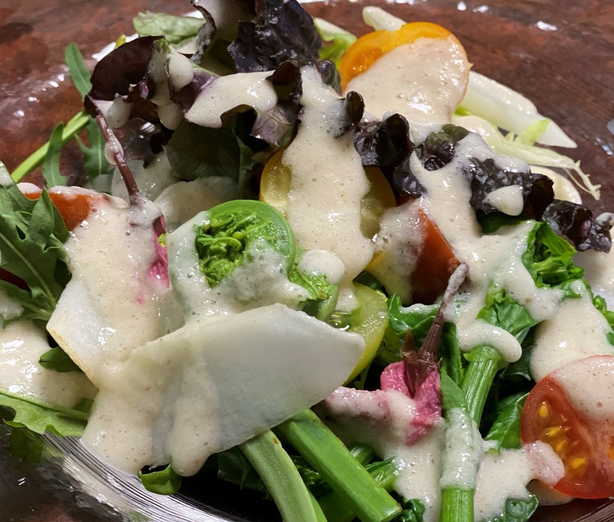 ドレッシングを作る。大和芋は小さ目に切り、Aの材料と共にミキサー(又はブレンダー)にかけ、泡立てる。