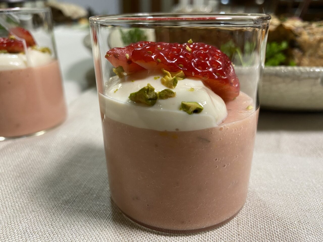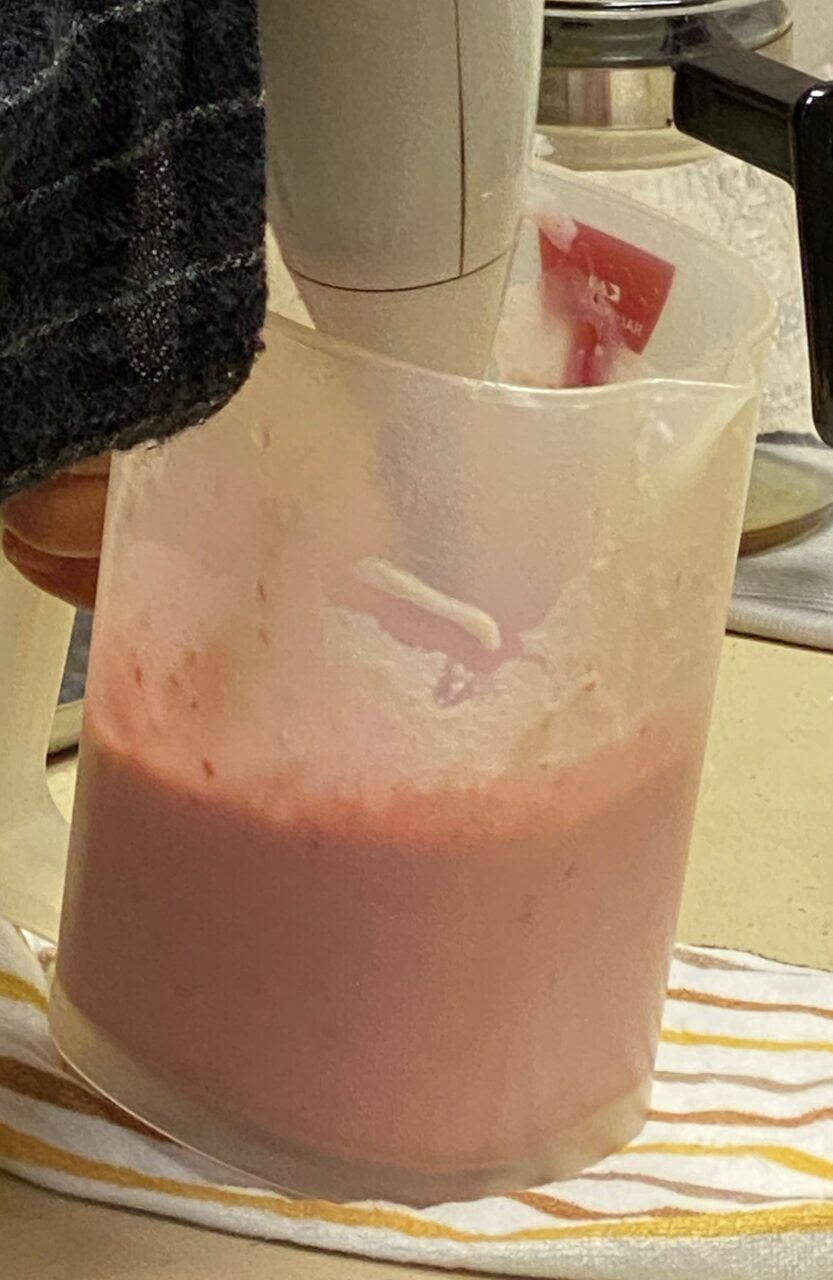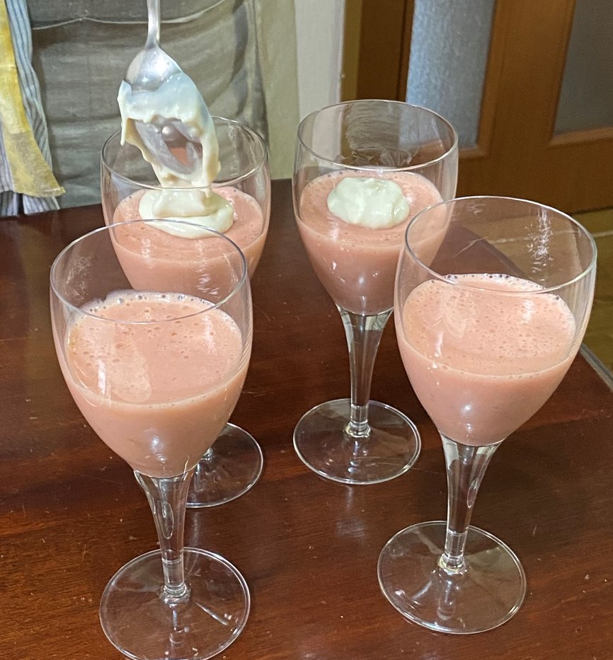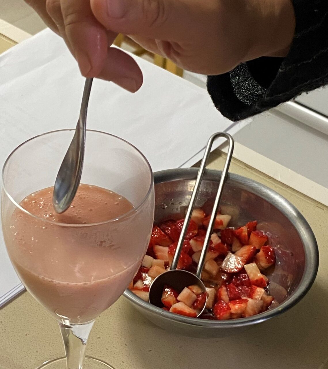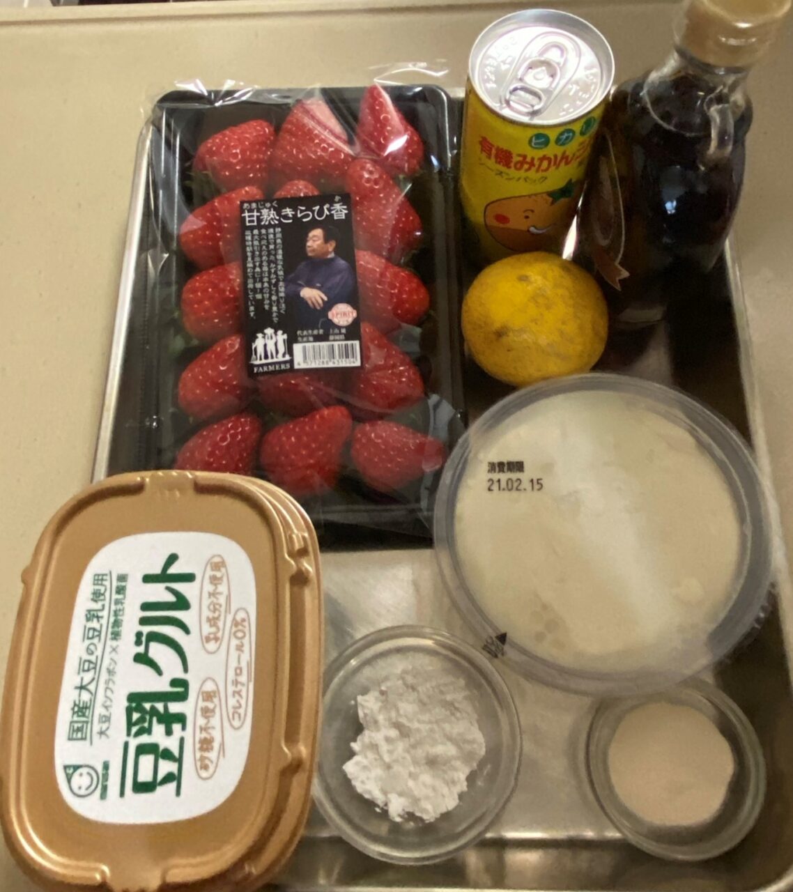 絹豆腐は軽く水切りし、いちごと共にミキサー(又はフードプロセッサー)にかけてペースト状にする。