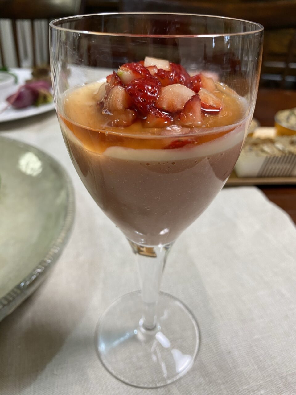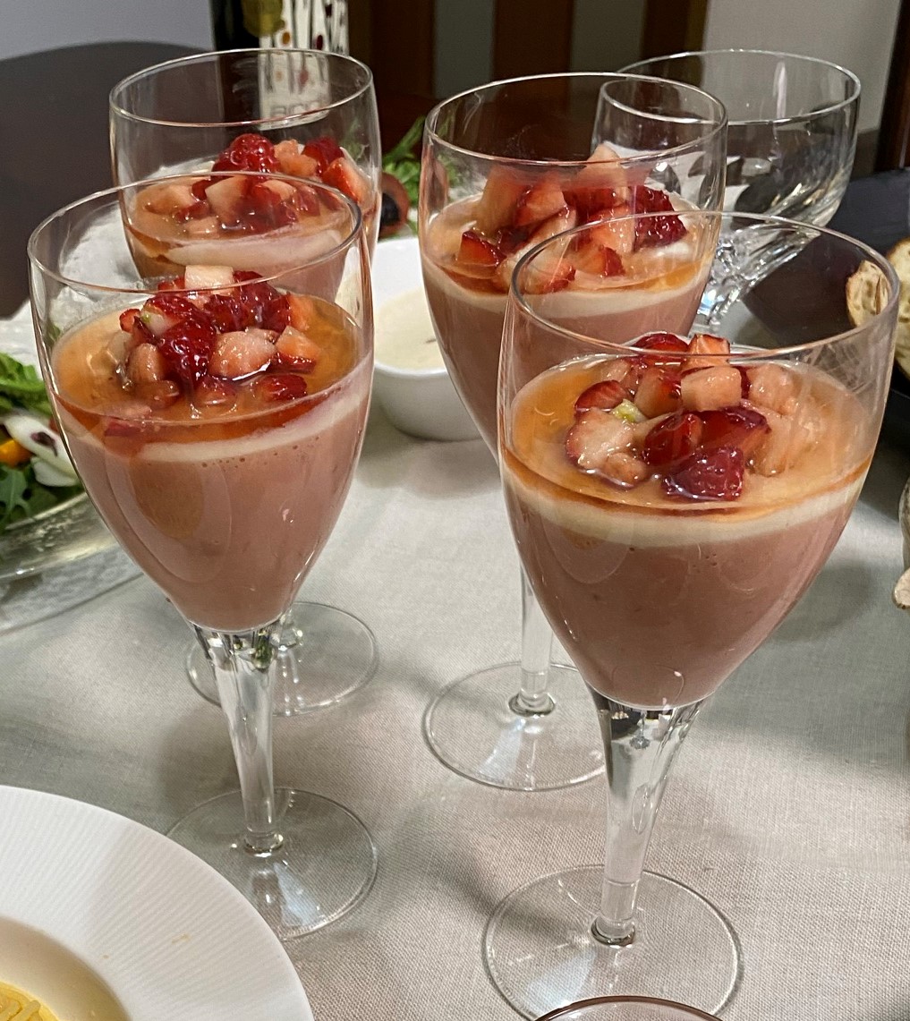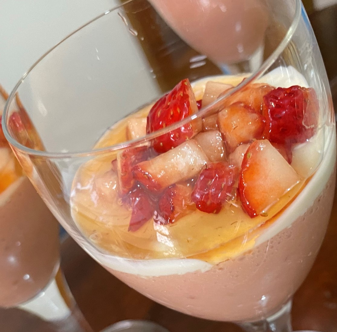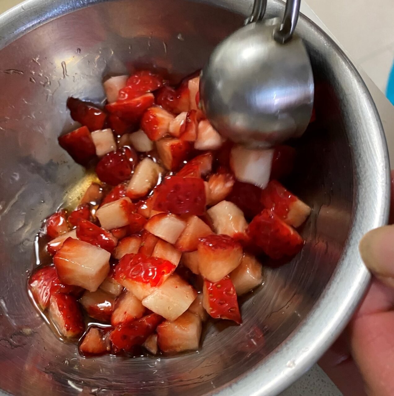 ソース用のいちごは5mm角位に切り、メープルシロップを加えて混ぜ合わせる。好みでブランデー等を加えても良い。