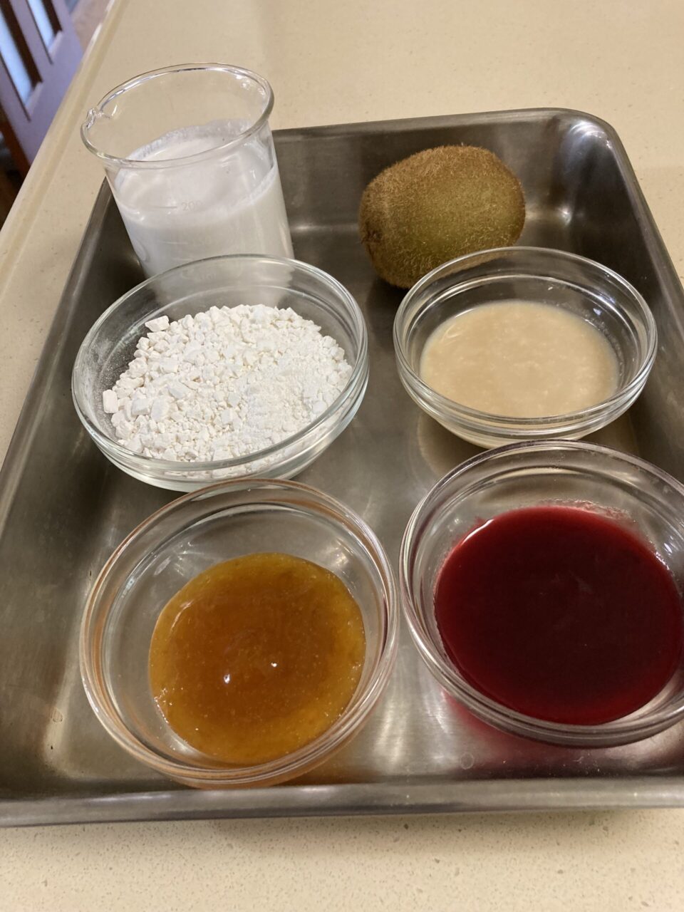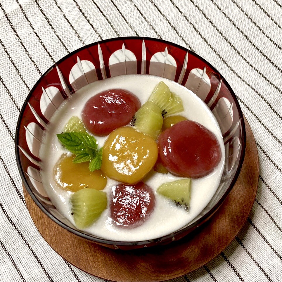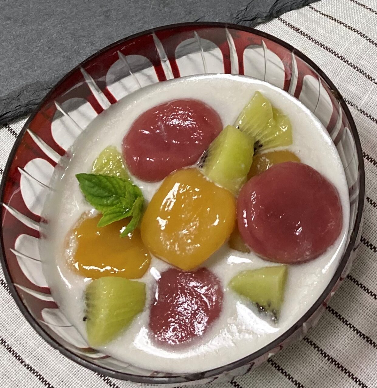 Aを鍋に入れて一度加熱してから、冷やしておく。器に2種の白玉を入れ、③のソースをかけ、一口大に切ったフルーツを添える。二色白玉のココナッツミルク。