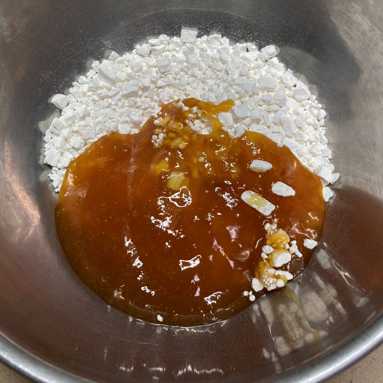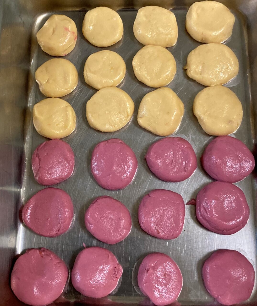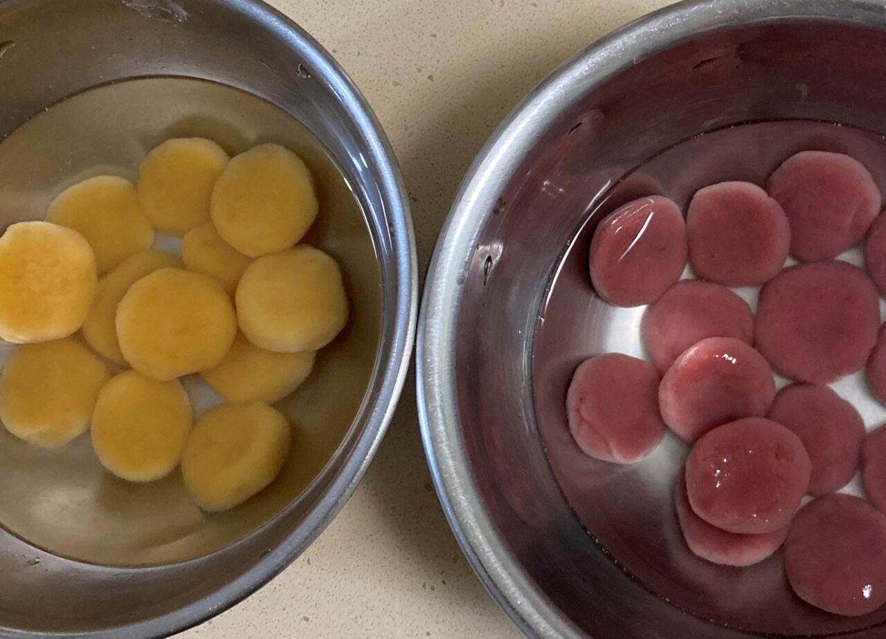 白玉粉はそれぞれジャムを加えて練る。固いようなら水適量を加えて粒が無くなるまでよくねり、耳たぶ位の固さにする。