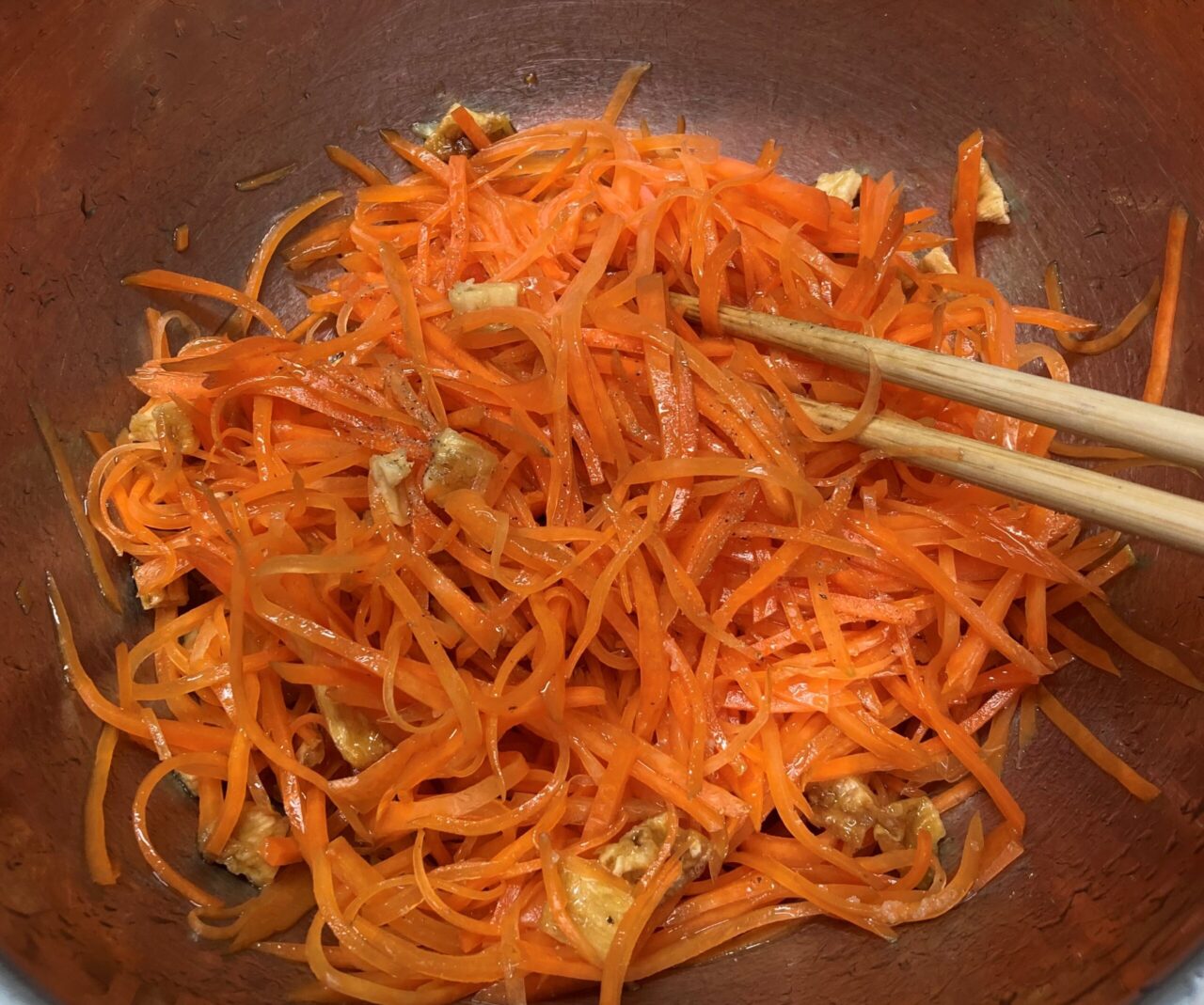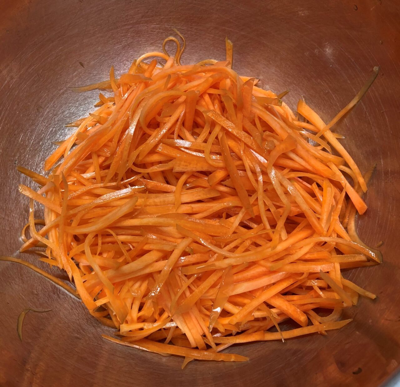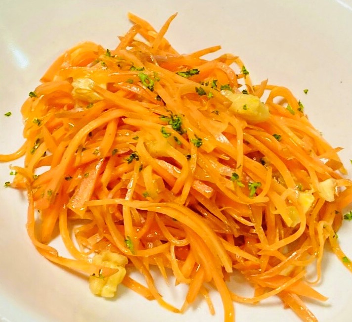 人参の水気をしっかりとしぼり、③に加え、塩、こしょうで味を調え、パセリを散らす。人参の甘さを活かしおつまみにも。