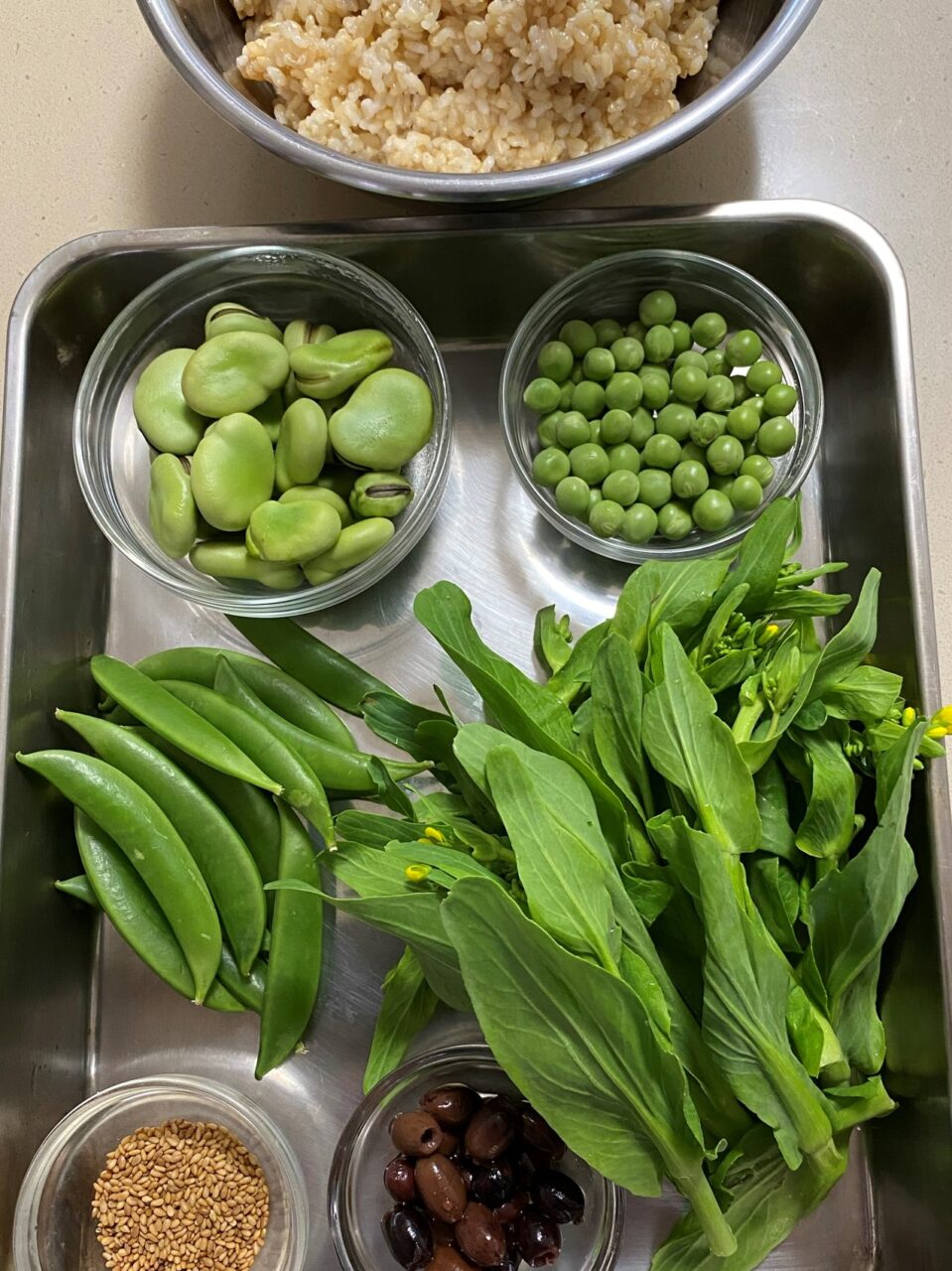 ②に①と黒オリーブを加えて混ぜ合わせ、最後に胡麻を振り入れる。