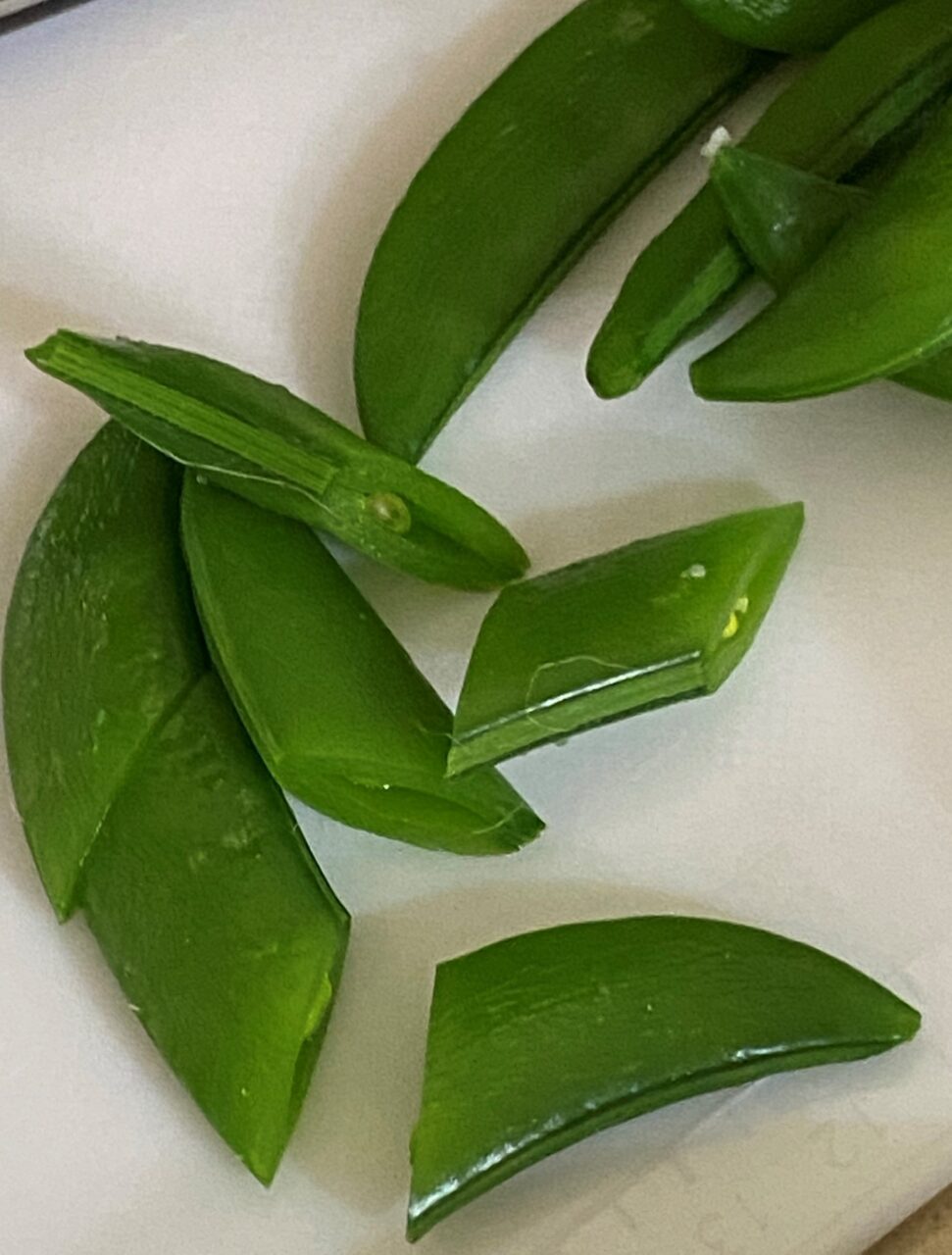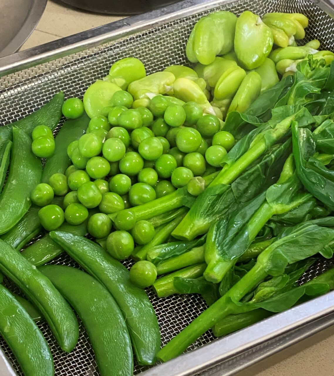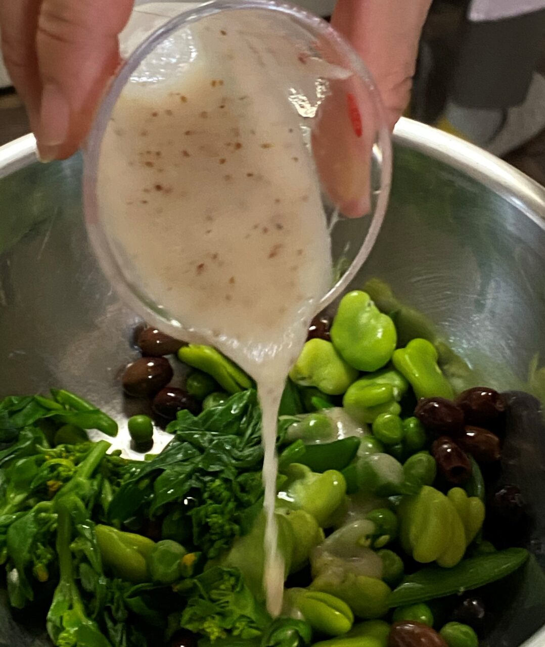 Aはゆでておく。スナップエンドウと菜花は一口大に切り、すべてをドレッシングで和えておく。