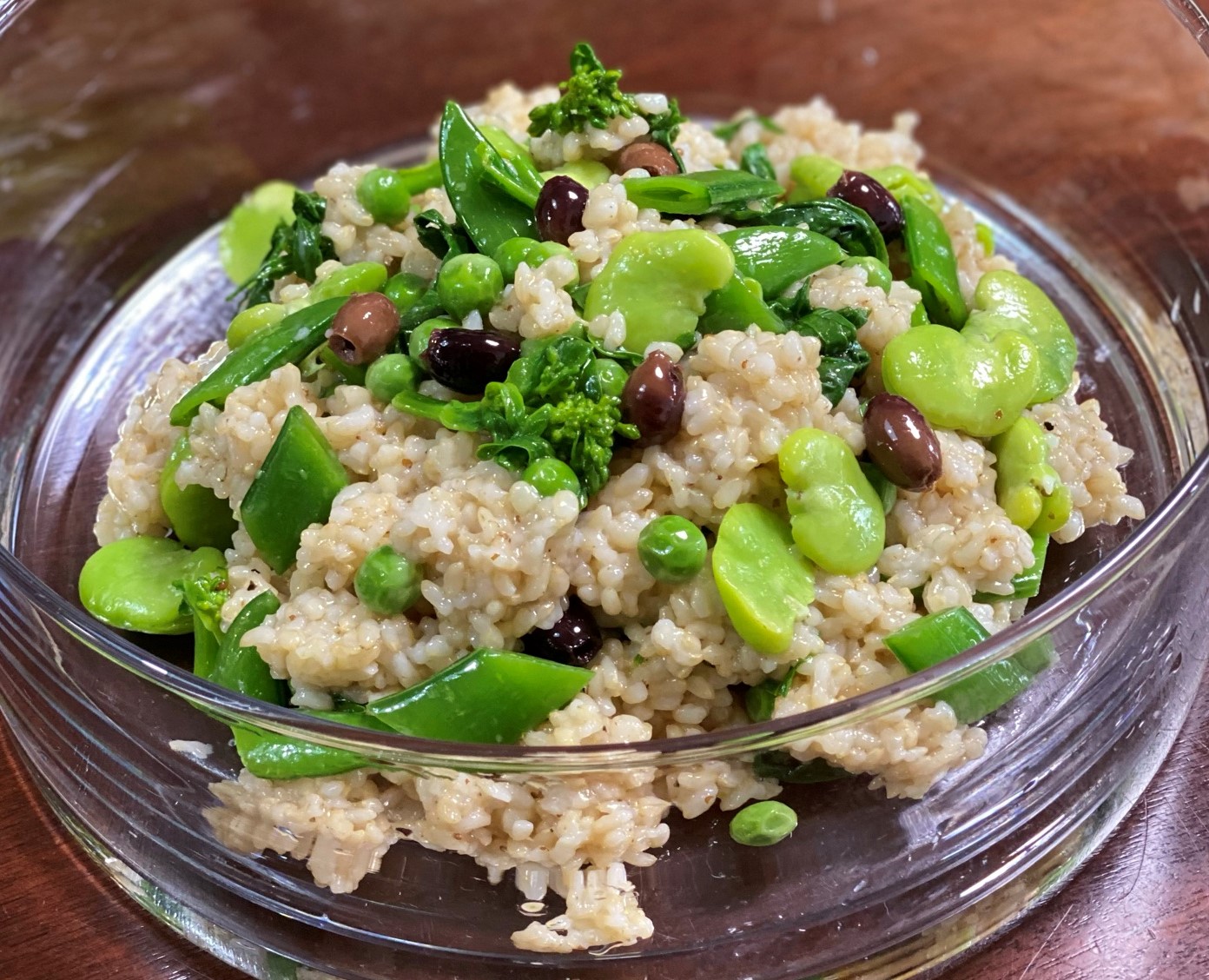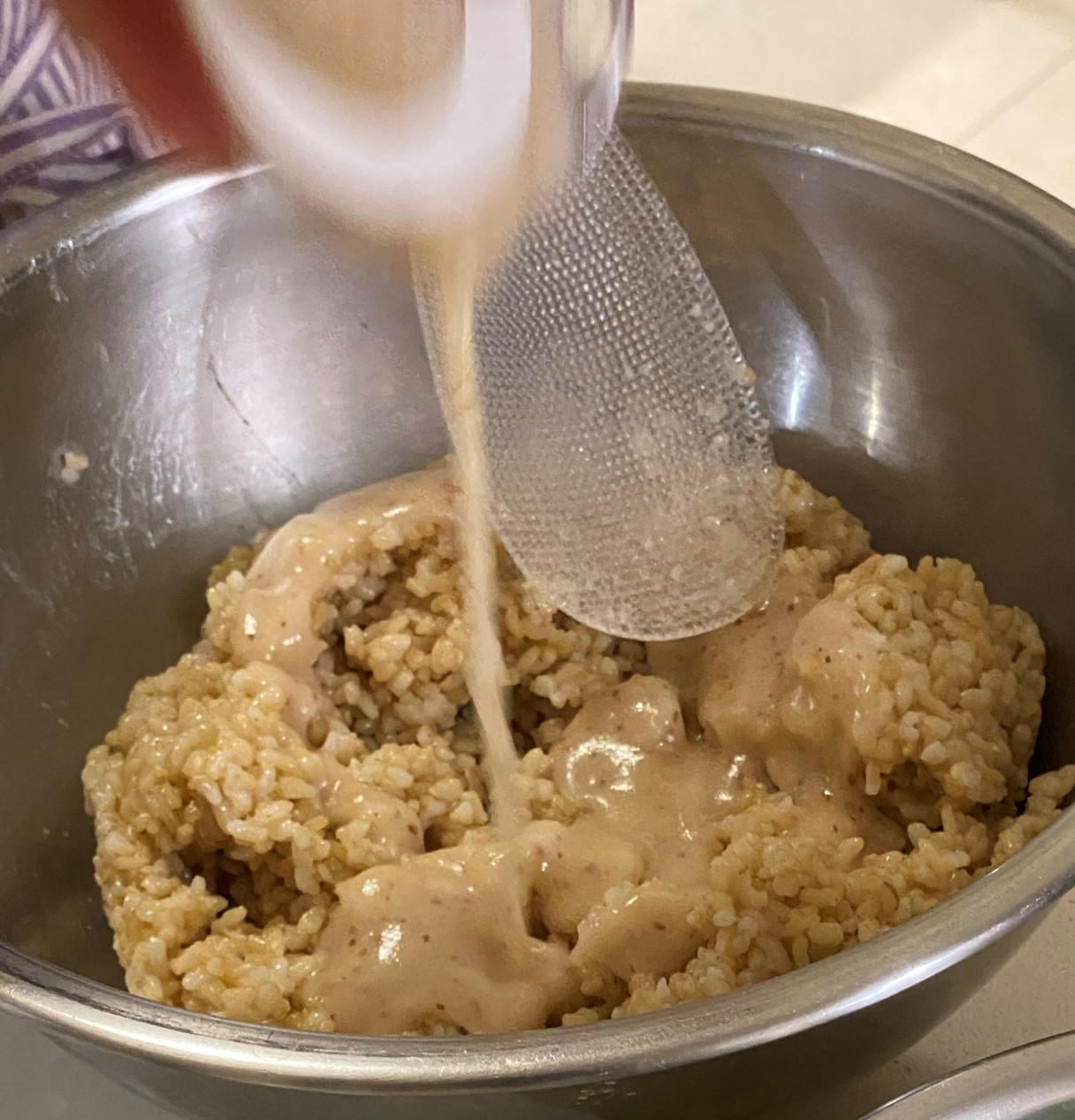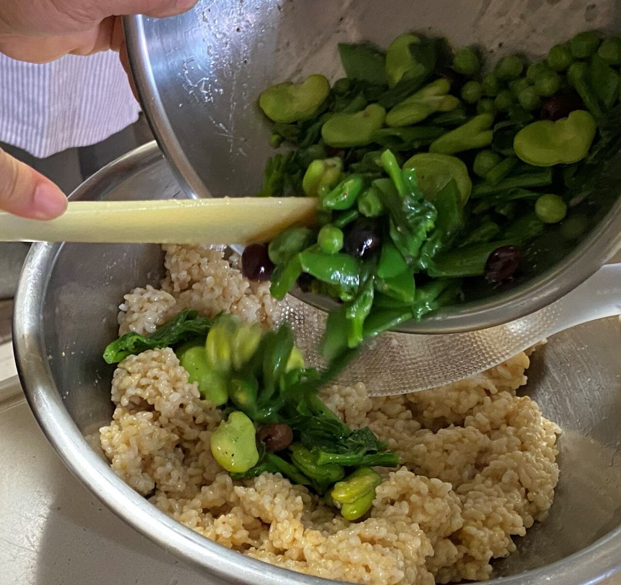 玄米は炊き上がったら、ドレッシングをかけて切るように混ぜる。