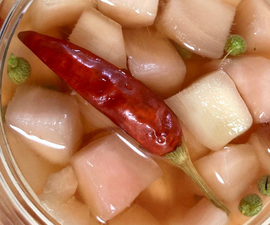 保存瓶にしょうがと赤唐辛子を入れ、さましたAを注ぐ。