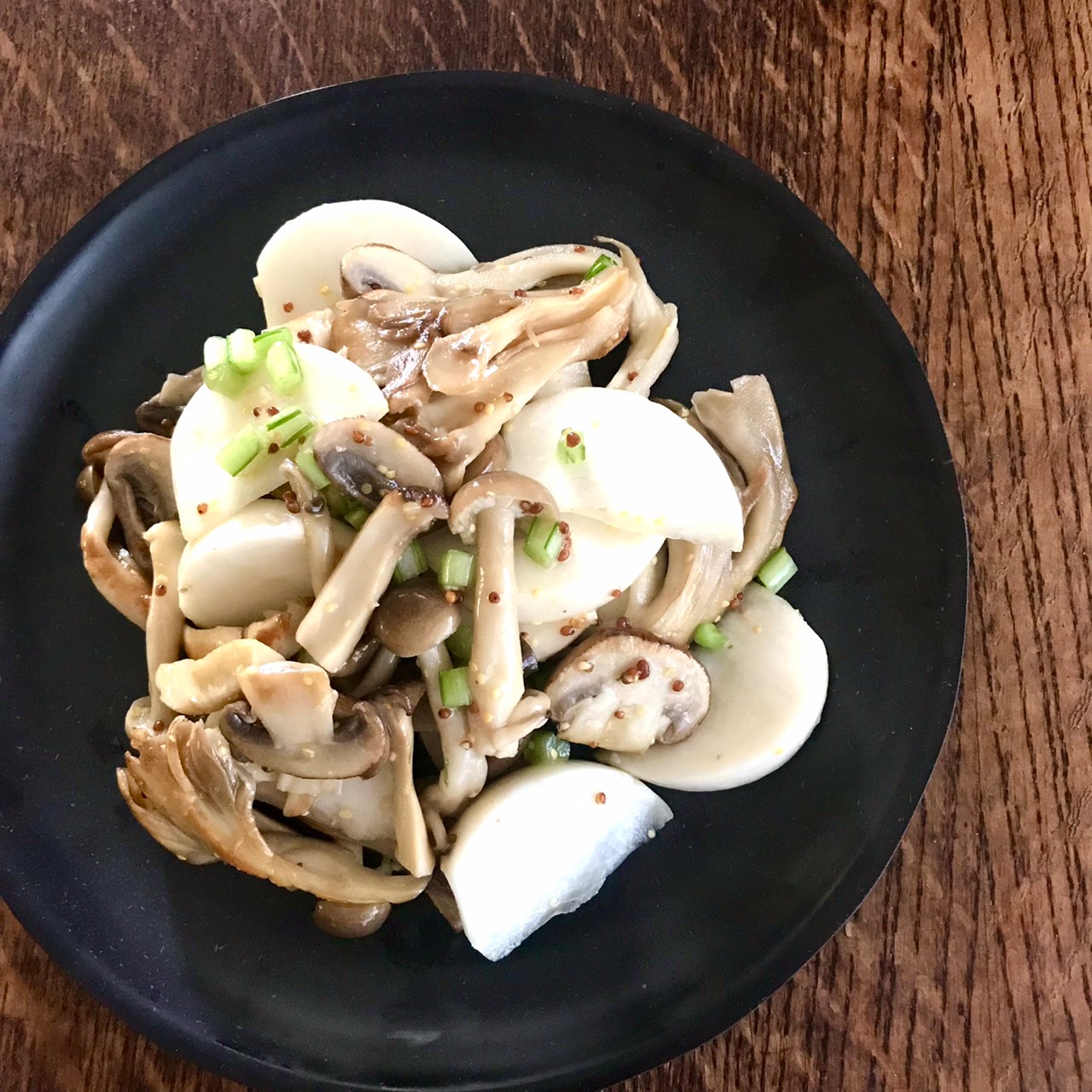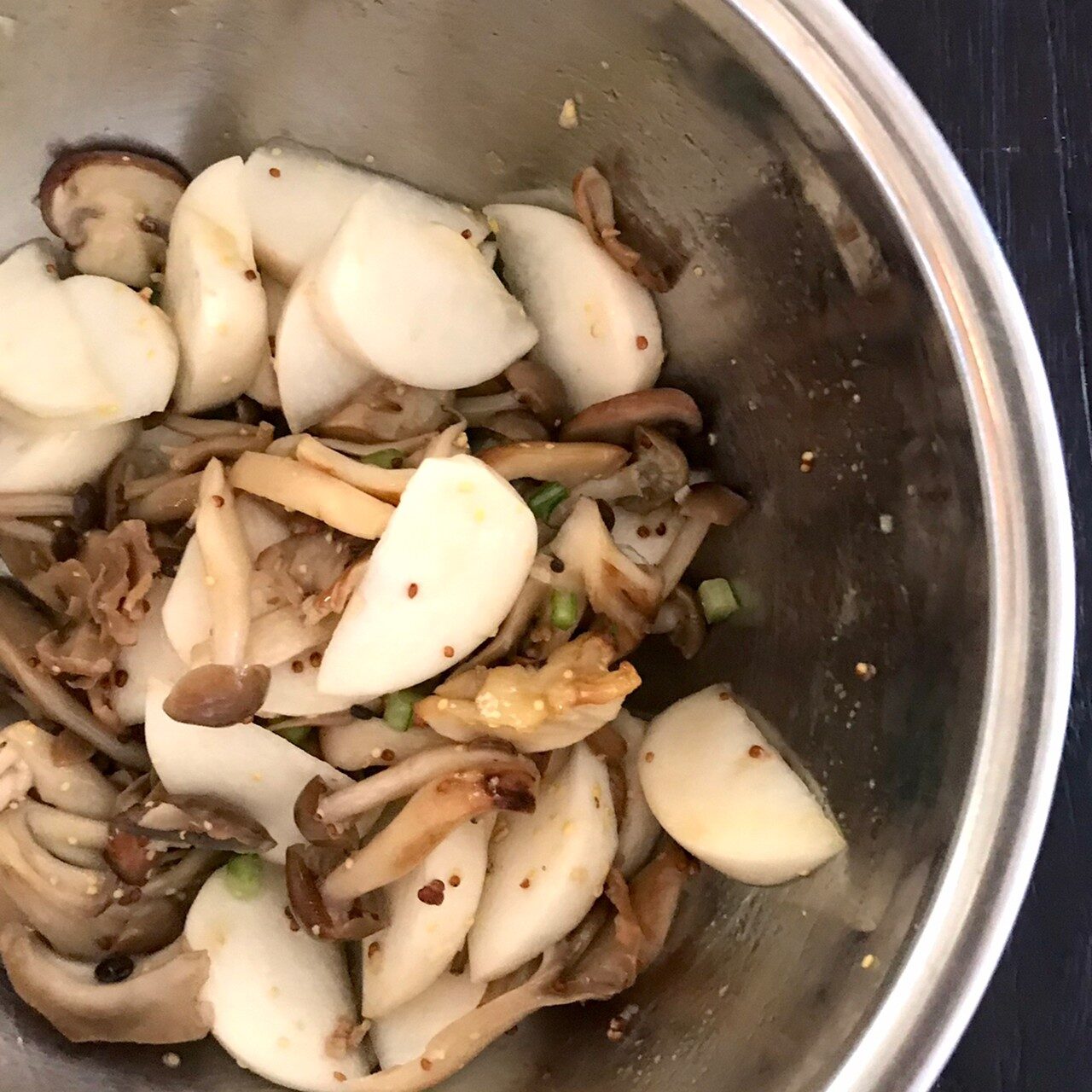 ①のボールに熱々の③をあけ、マスタードドレッシングを混ぜ合わせる。