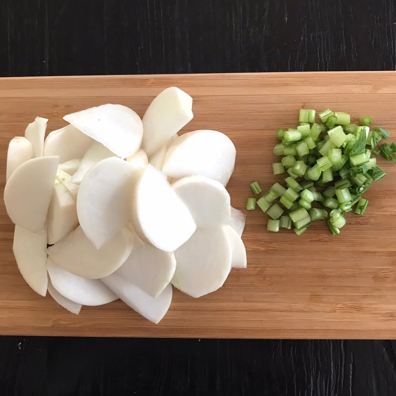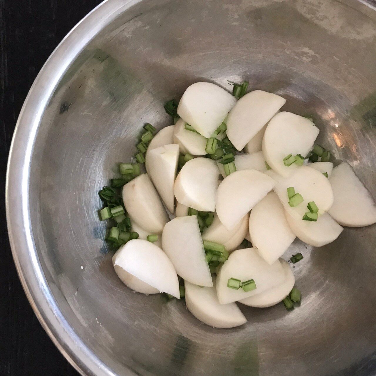 かぶは薄めのくし切りにする。葉の部分もあれば小口切りにする。ポールに入れて軽く塩を振っておく。