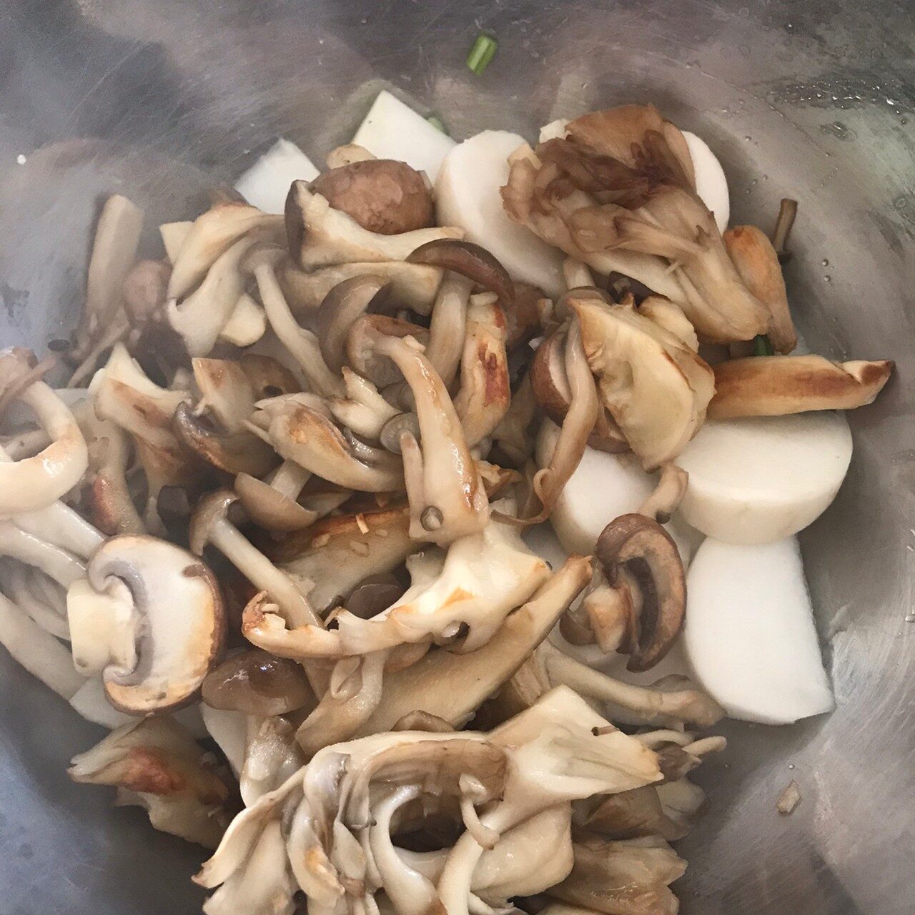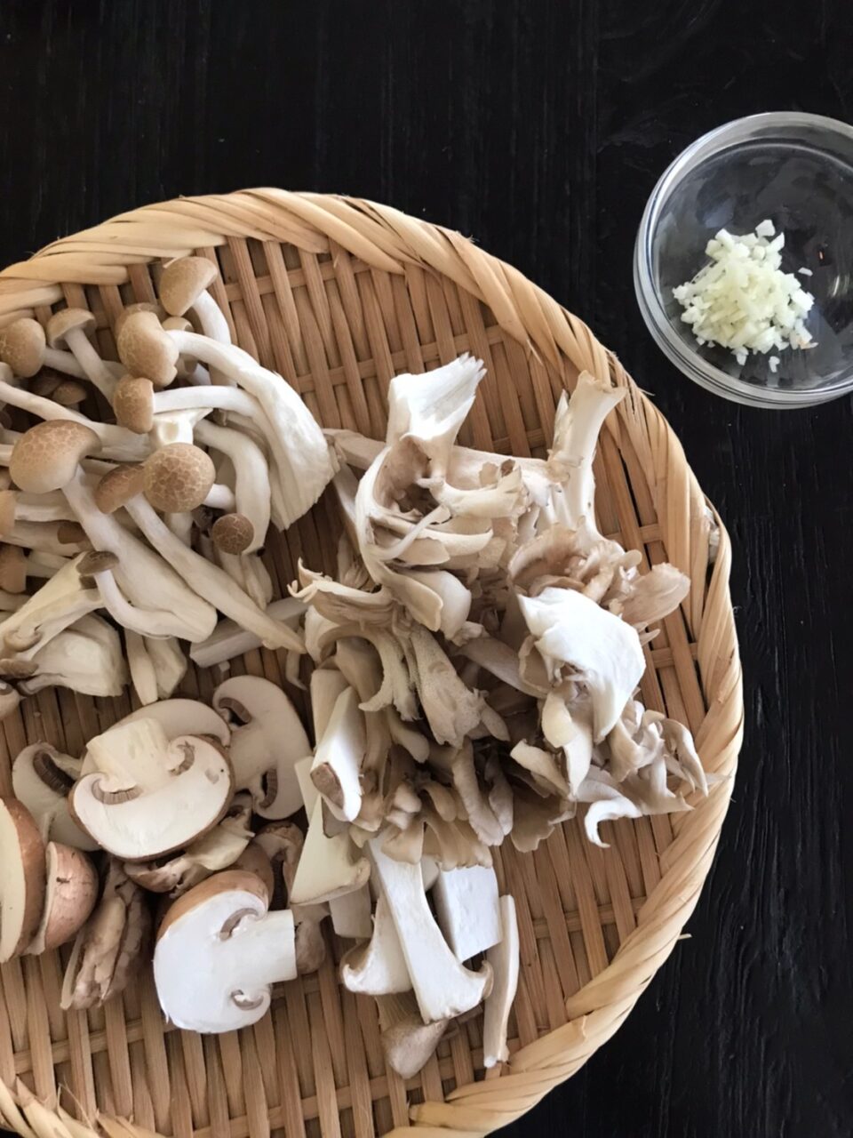 キノコはそれぞれ一口大に切る。にんにくはみじん切りにする。