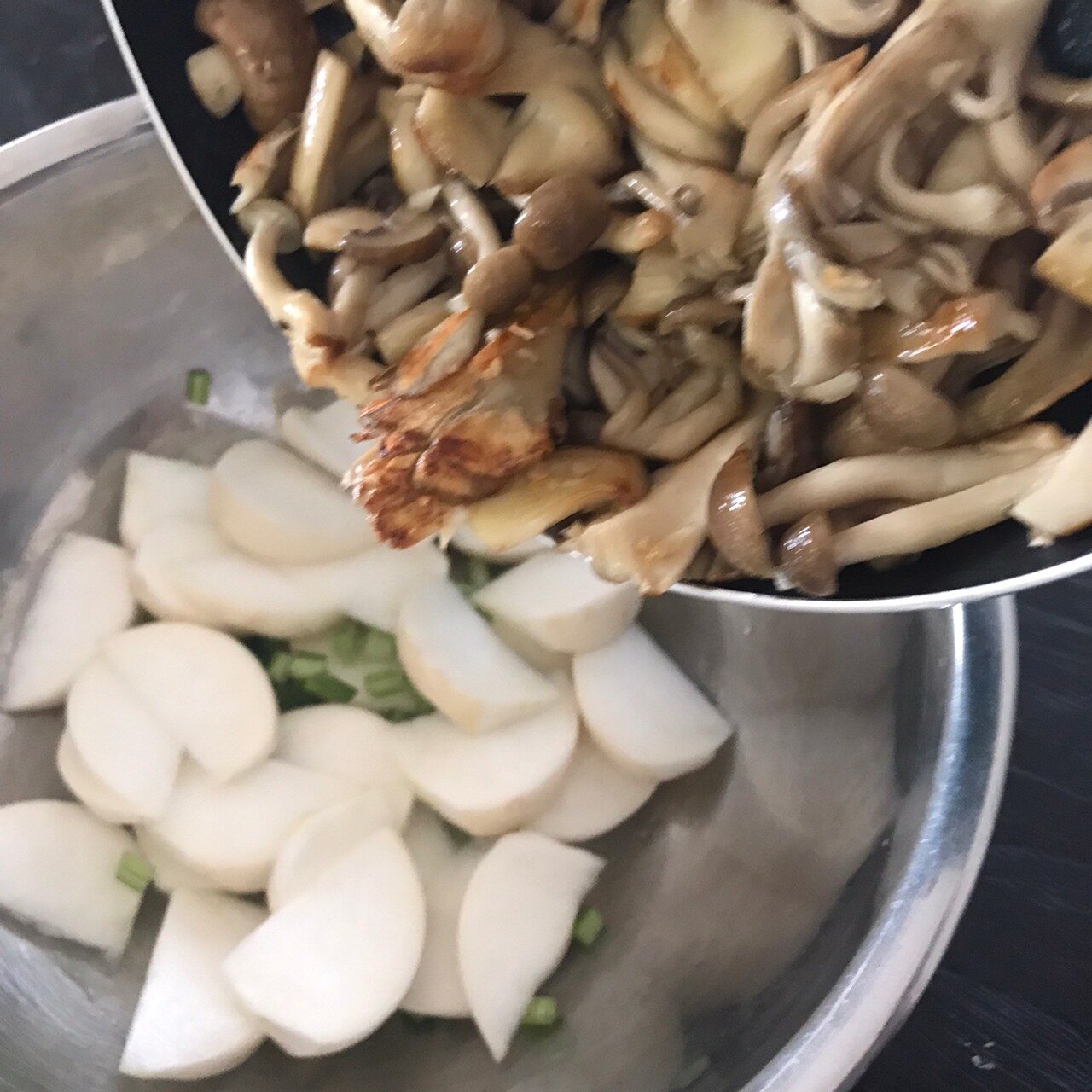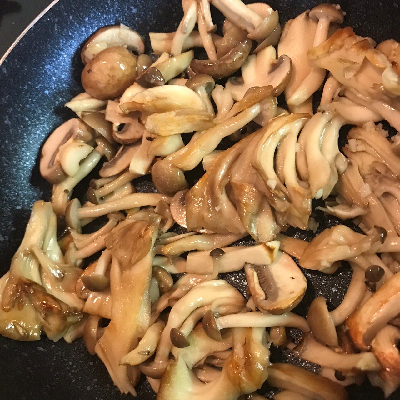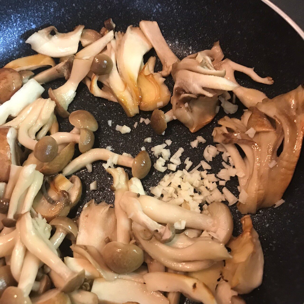 フライパンにオリーブオイルを熱し、きのこを入れ、広げてなるべく触らないように強火で炒める。炒まってきたらにんにく、塩を入れて更に炒め香りづけの醤油をたらす。
