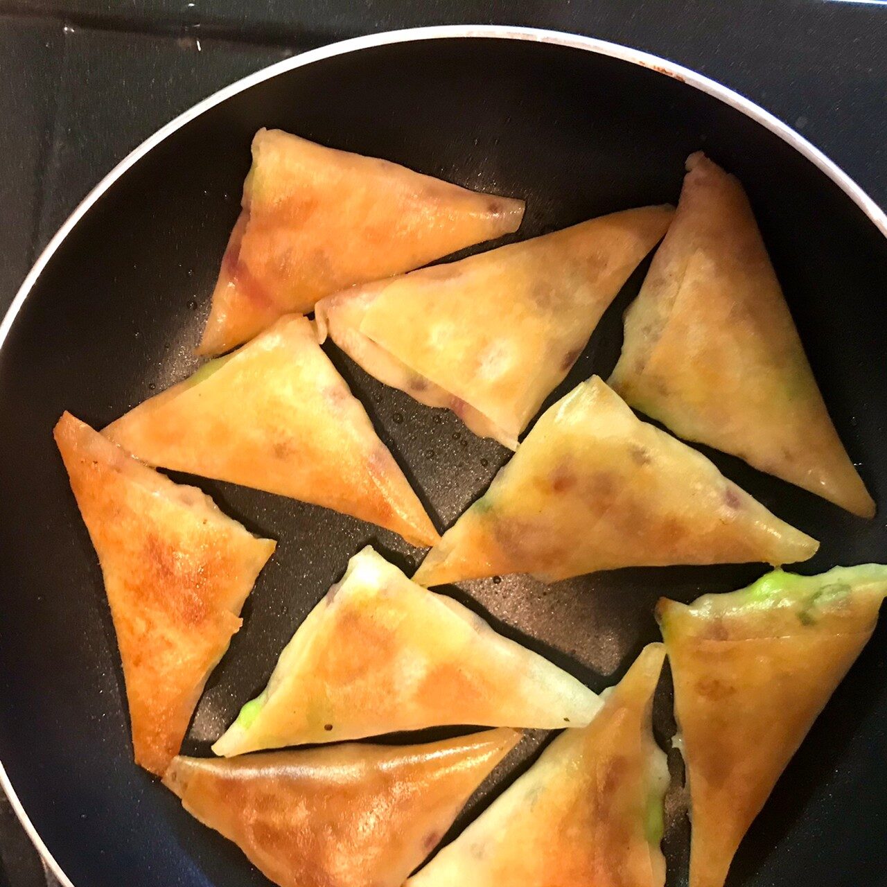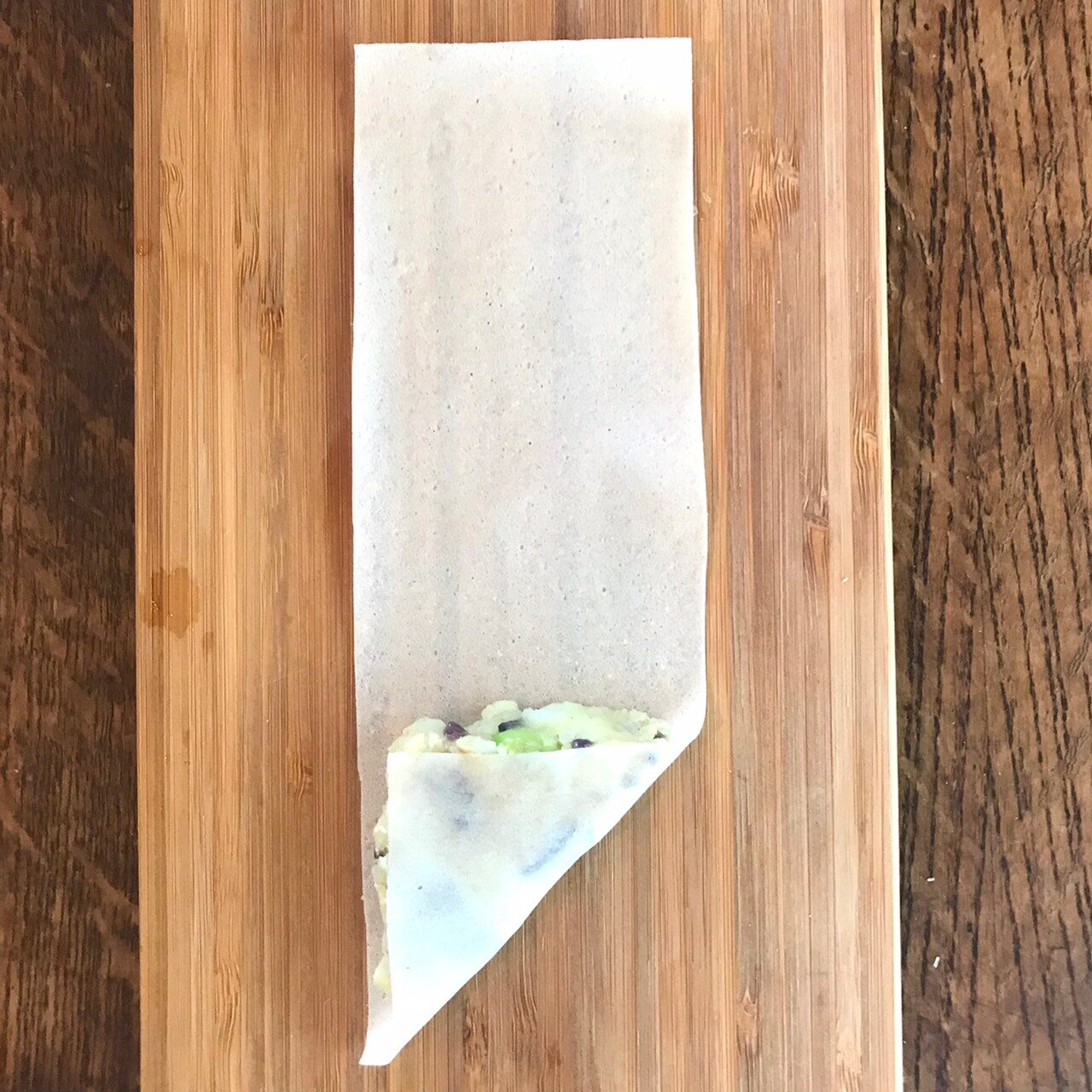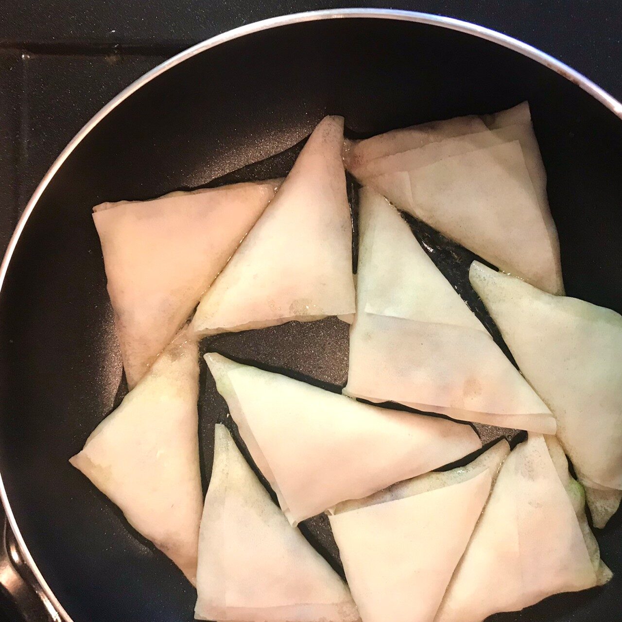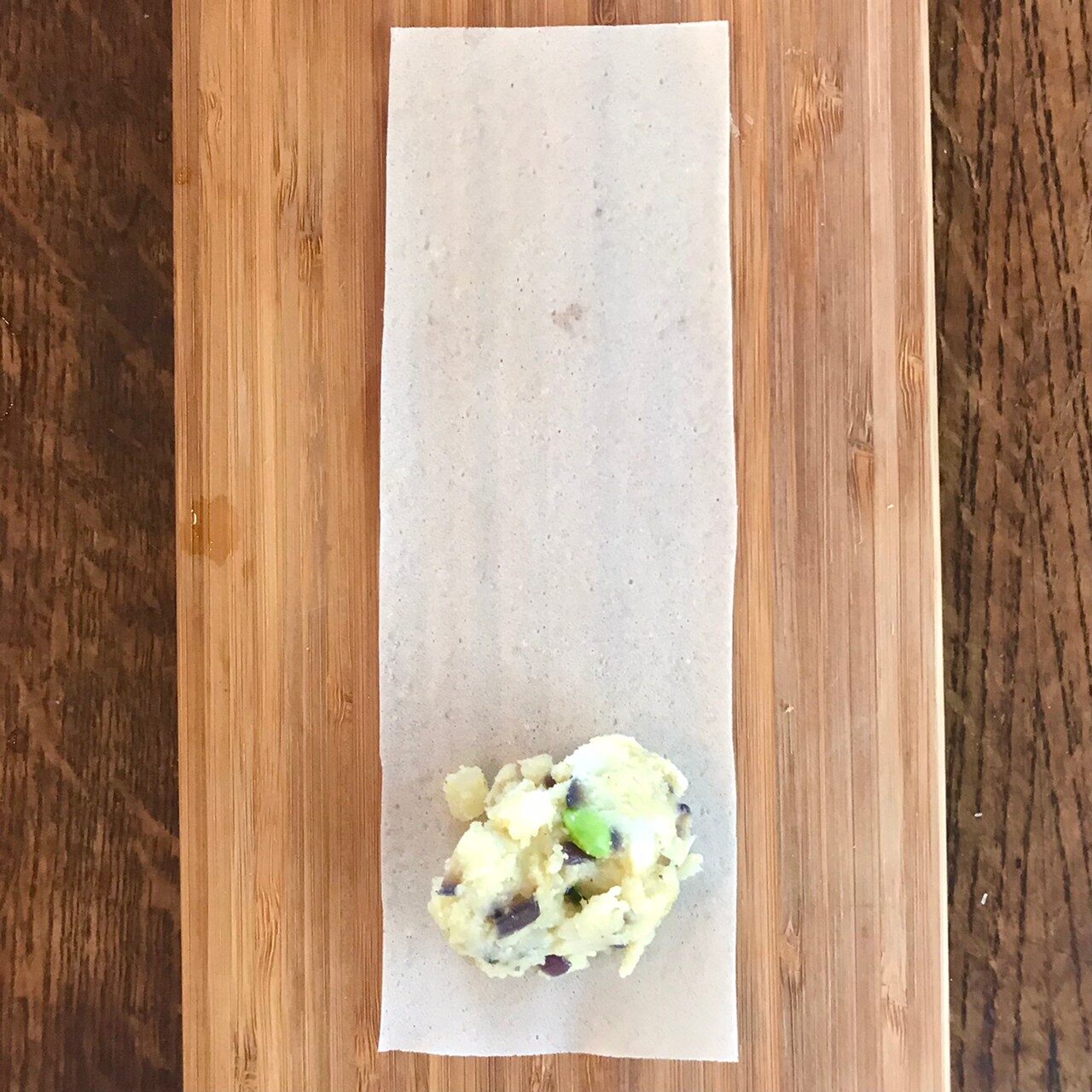 春巻きの皮を縦長に3等分に切り、3をのせて三角形になるように巻く。巻終わりに水を塗って貼り付ける。