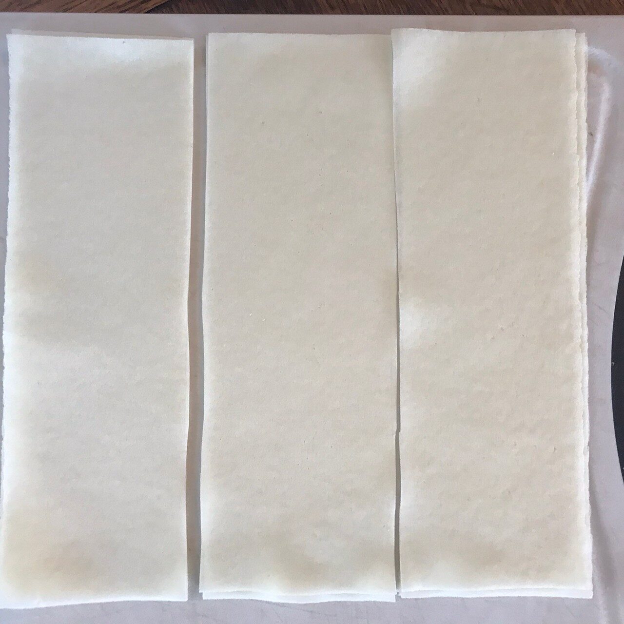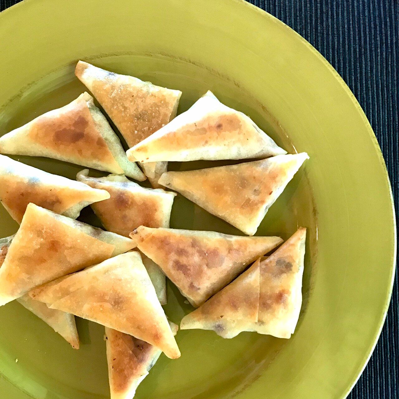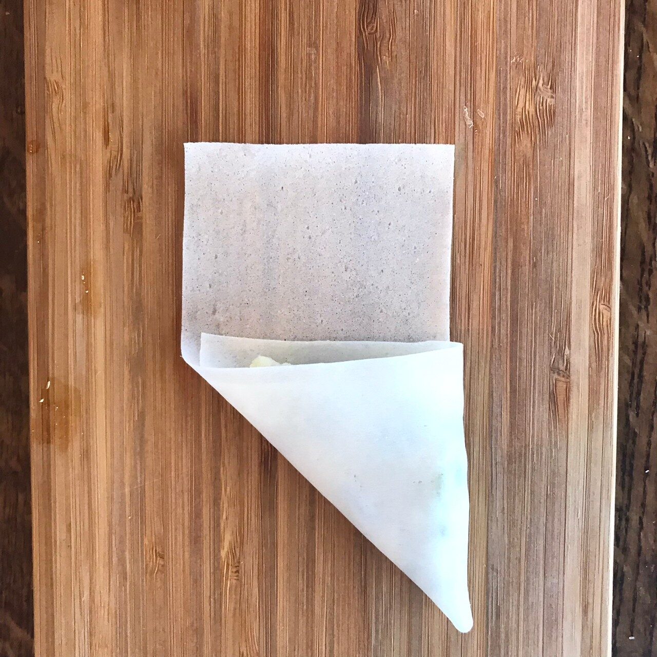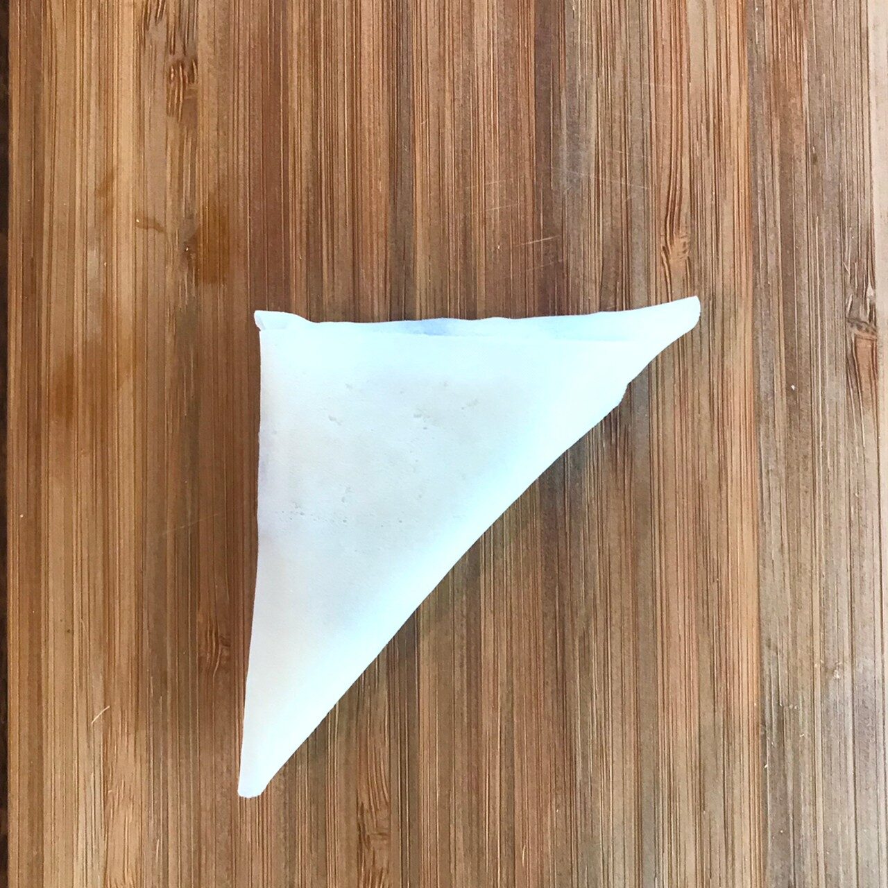 春巻きの皮を縦長に3等分に切り、3をのせて三角形になるように巻く。巻終わりに水を塗って貼り付ける。