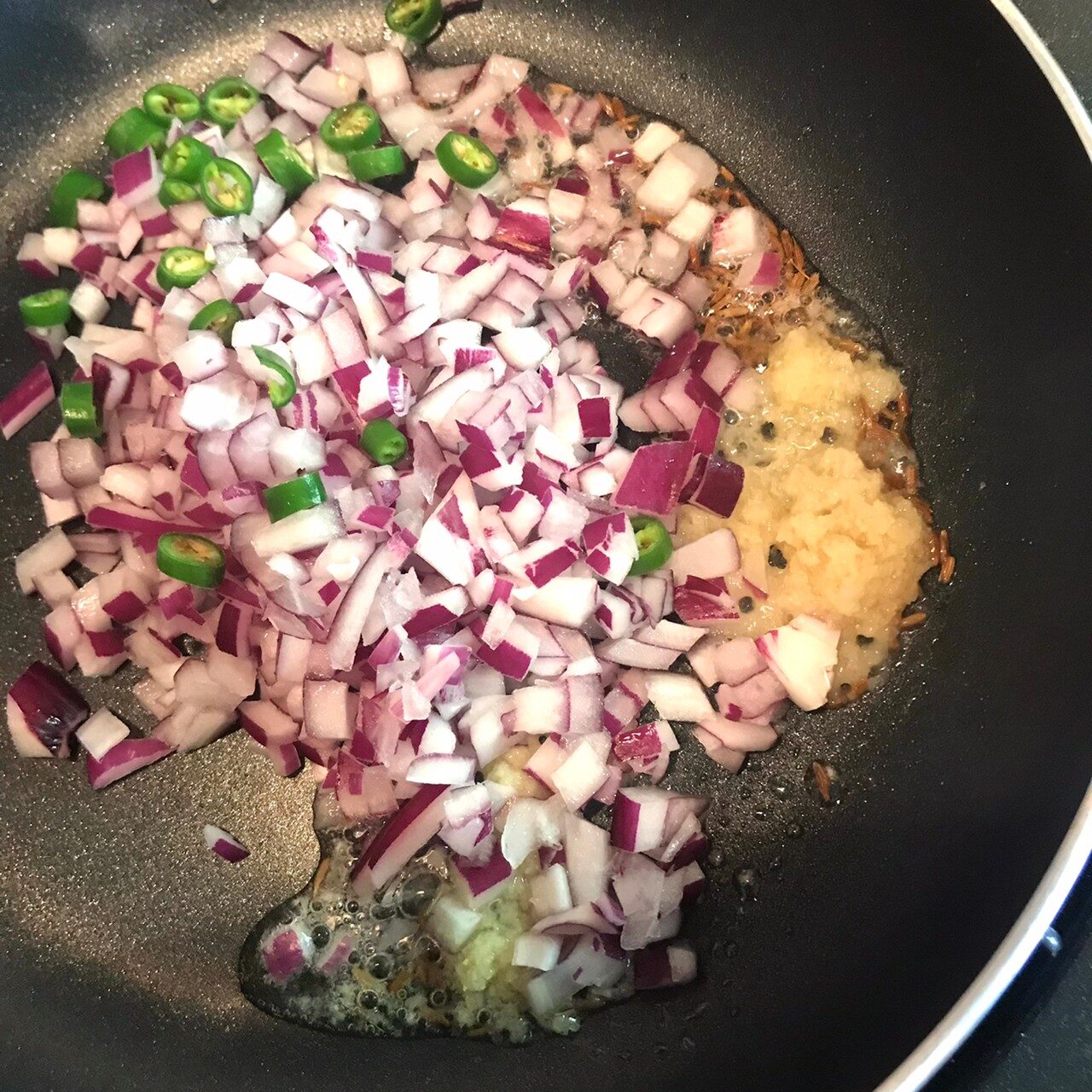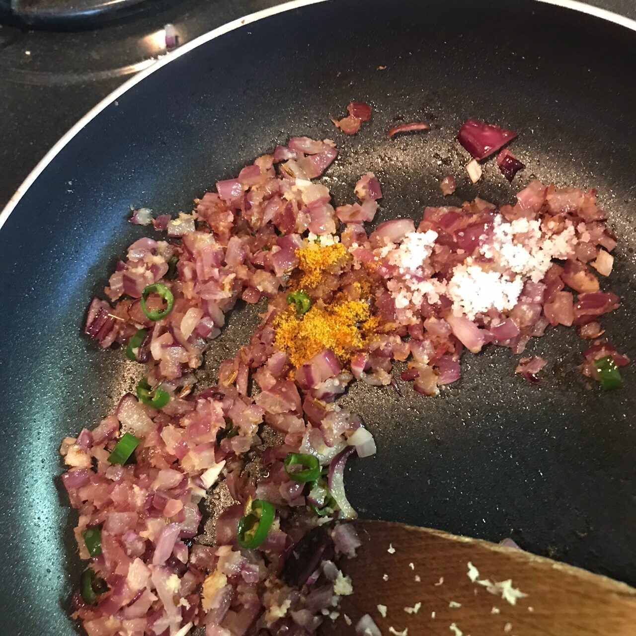 フライパンに油とクミンを入れて熱し、おろし生姜、玉ねぎ、青唐辛子も加えて炒め、塩とカレー粉を加えてさらに少し炒める。