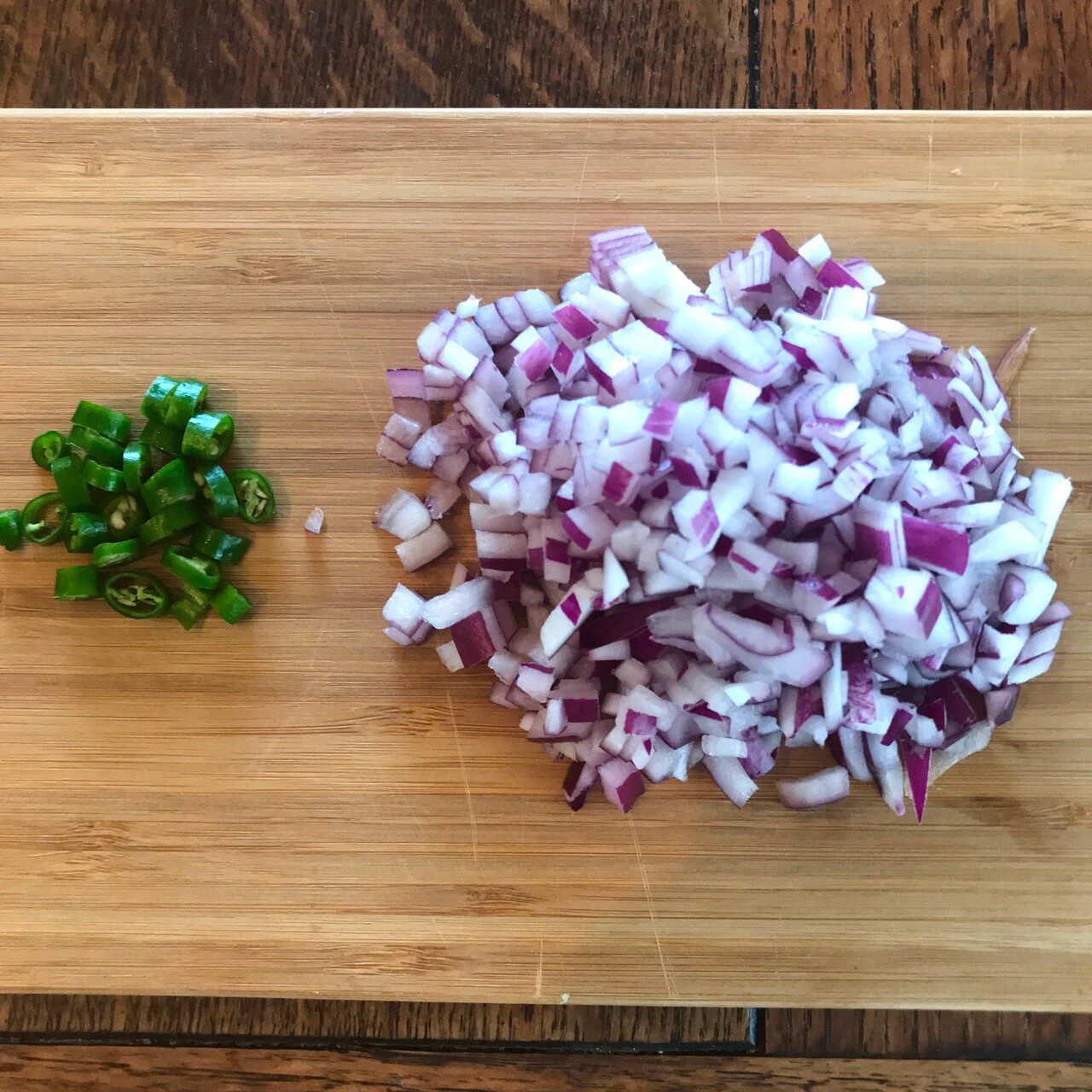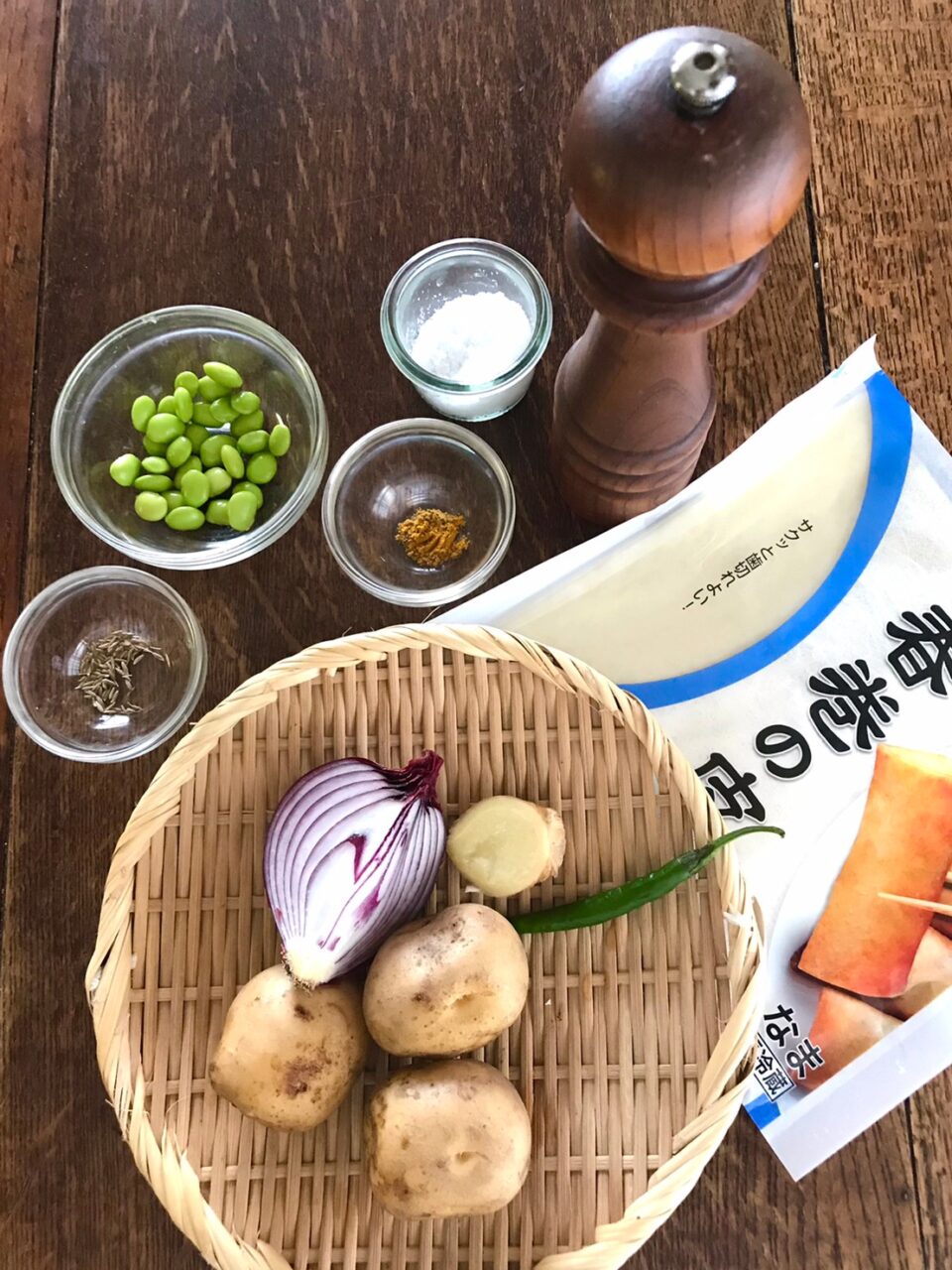 じゃがいもを蒸して熱いうちに皮をむいて潰す。赤玉ねぎはみじん切り、青唐辛子は小口切りにする。