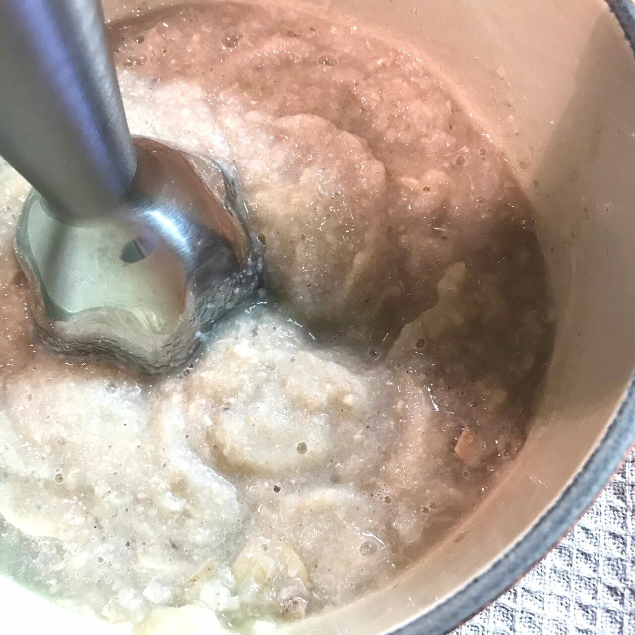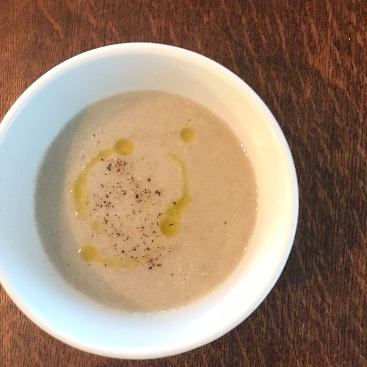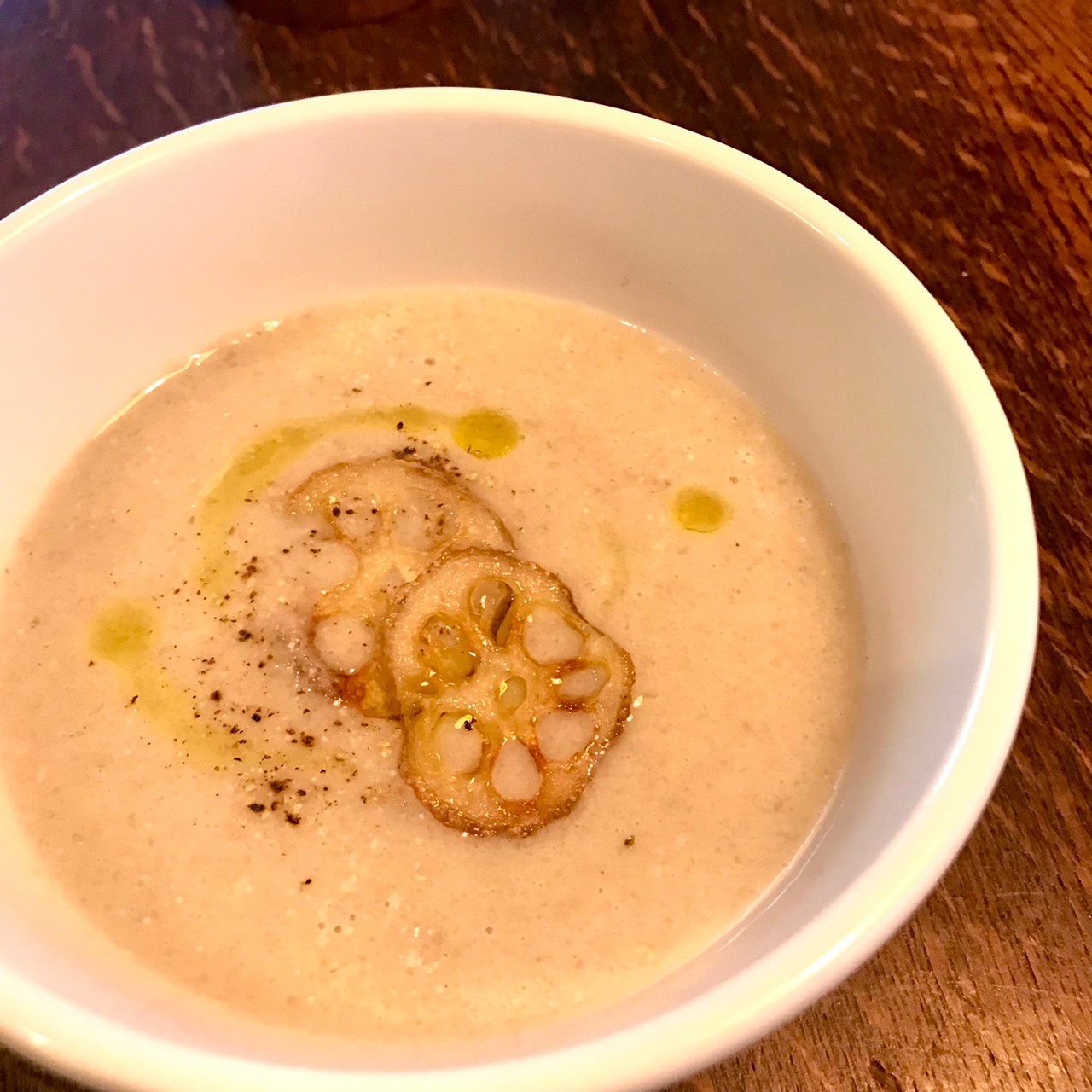 ハンドミキサーで滑らかにする。豆乳と白味噌を加えてもう一度温め、塩で味を調える。オリーブオイルと黒胡椒をかけていただく。好みでレンコンの素揚げをトッピングする。簡単でほっと温まるスープ。