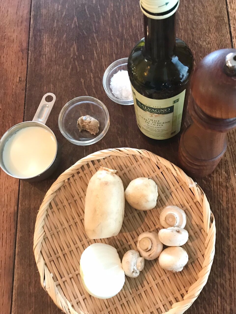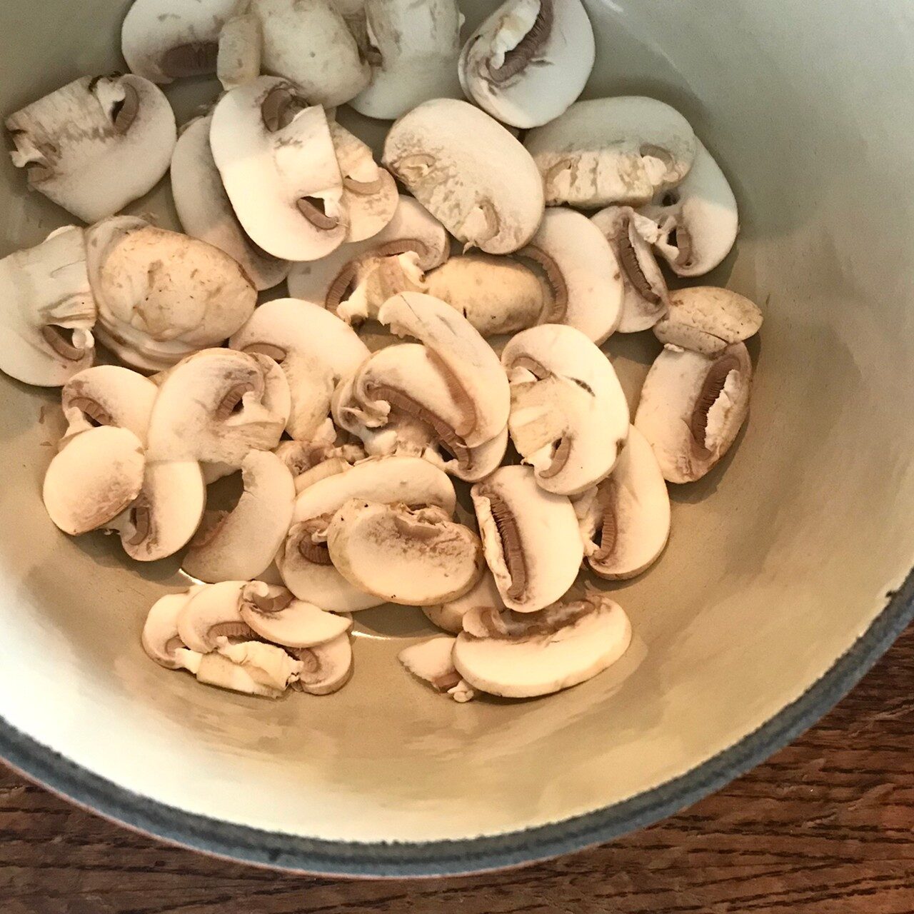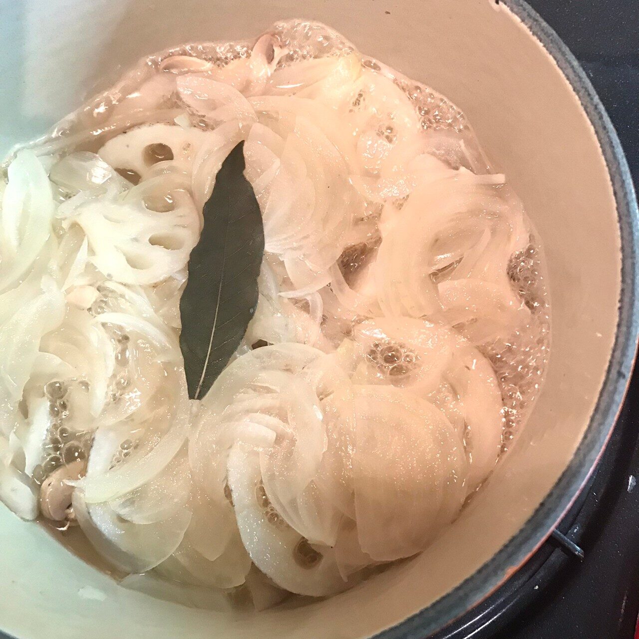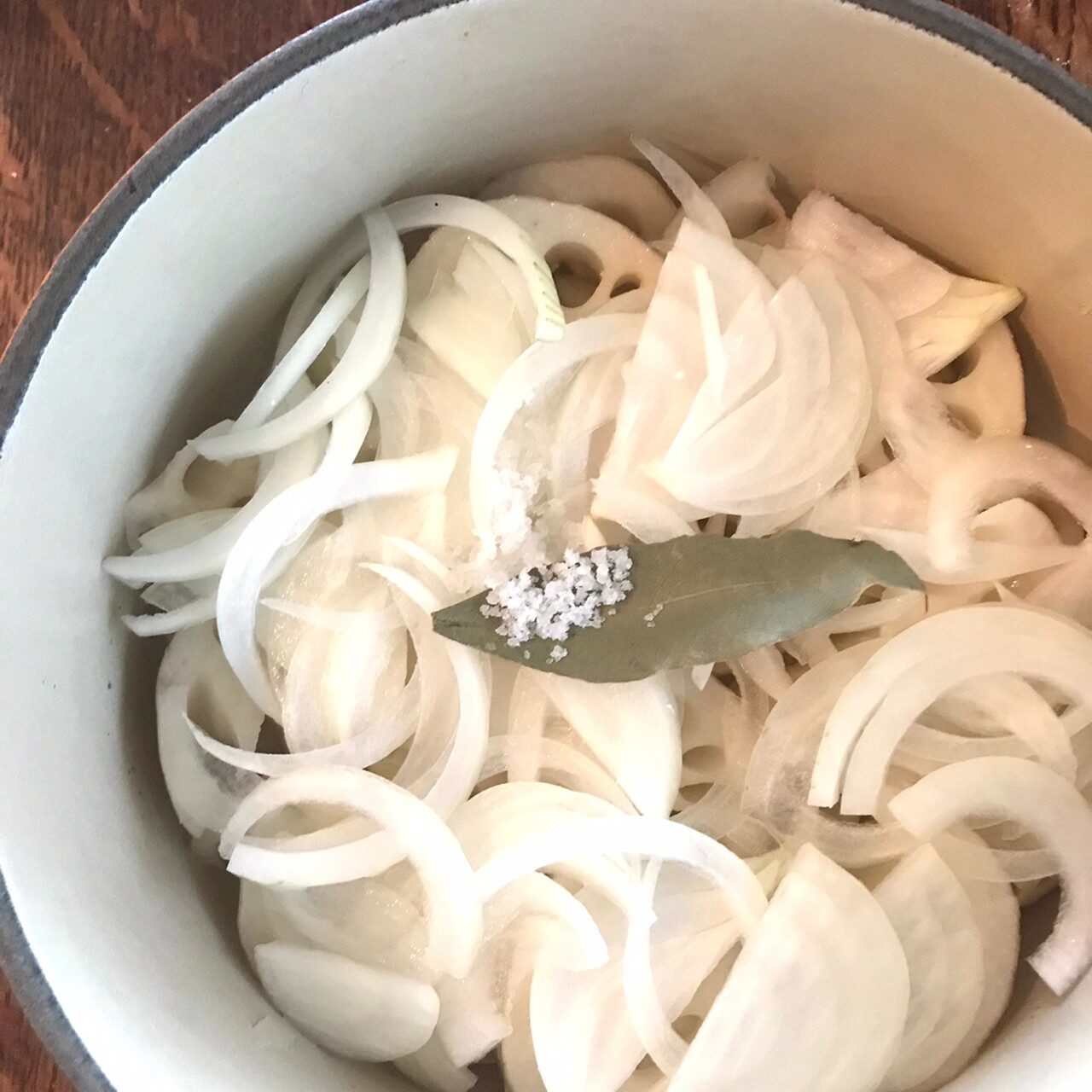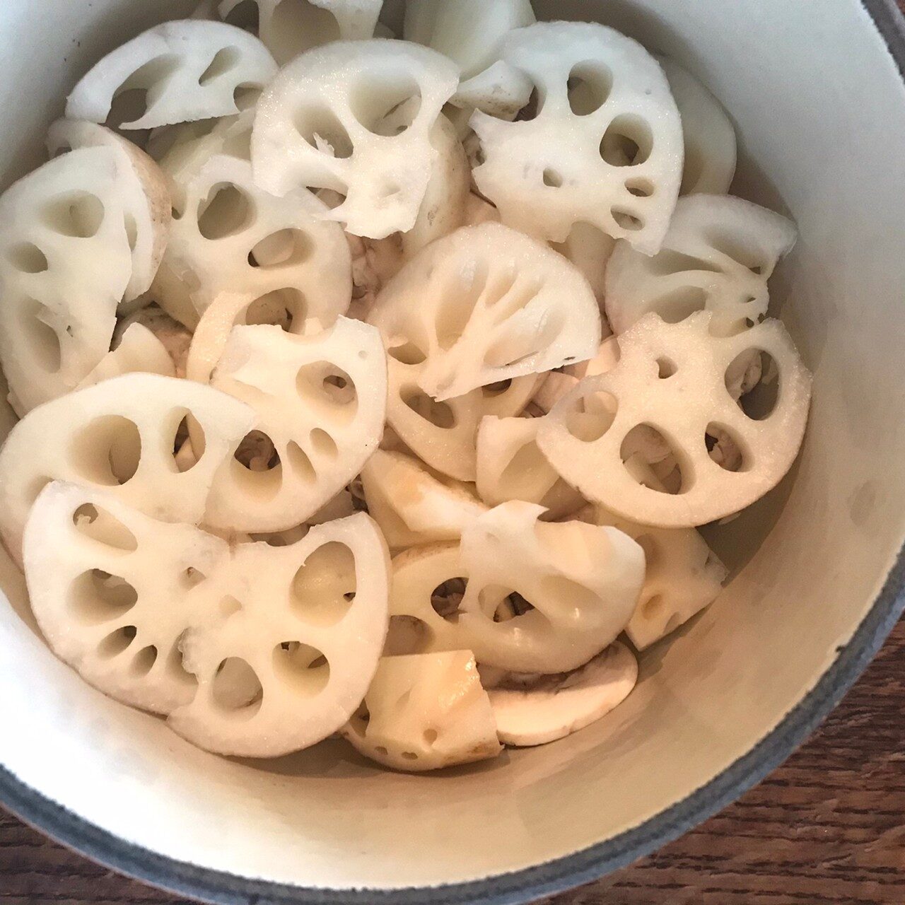 鍋にマッシュルーム、れんこん、玉ねぎの順に重ねて入れ.塩を振る。水をひたひたに注ぎ、蓋をしてれんこんが柔らかくなるまで20分ほど煮る。