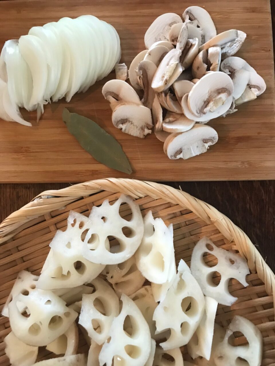 れんこんは小さめの乱切り、玉ねぎ、マッシュルームは薄切りにする。