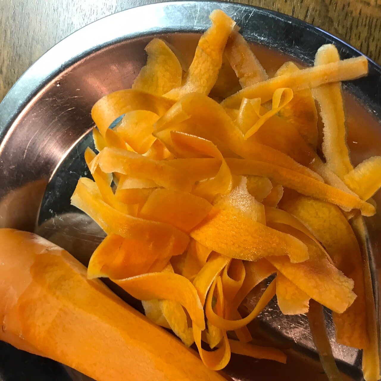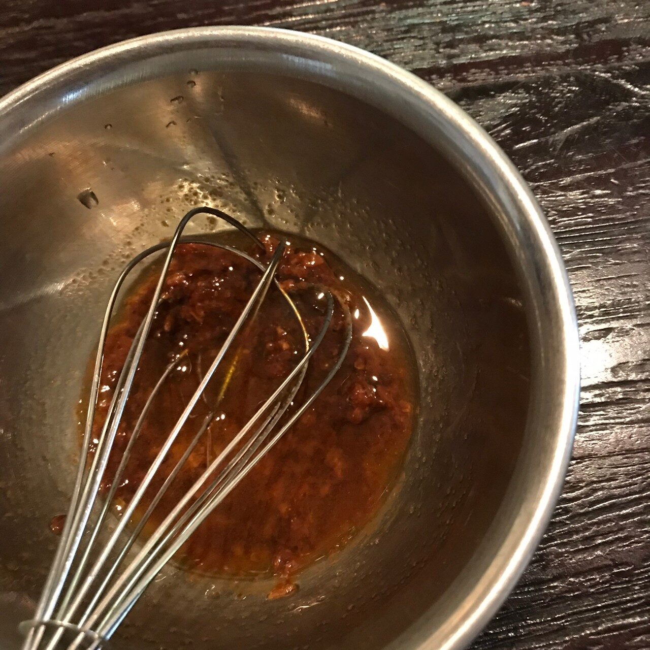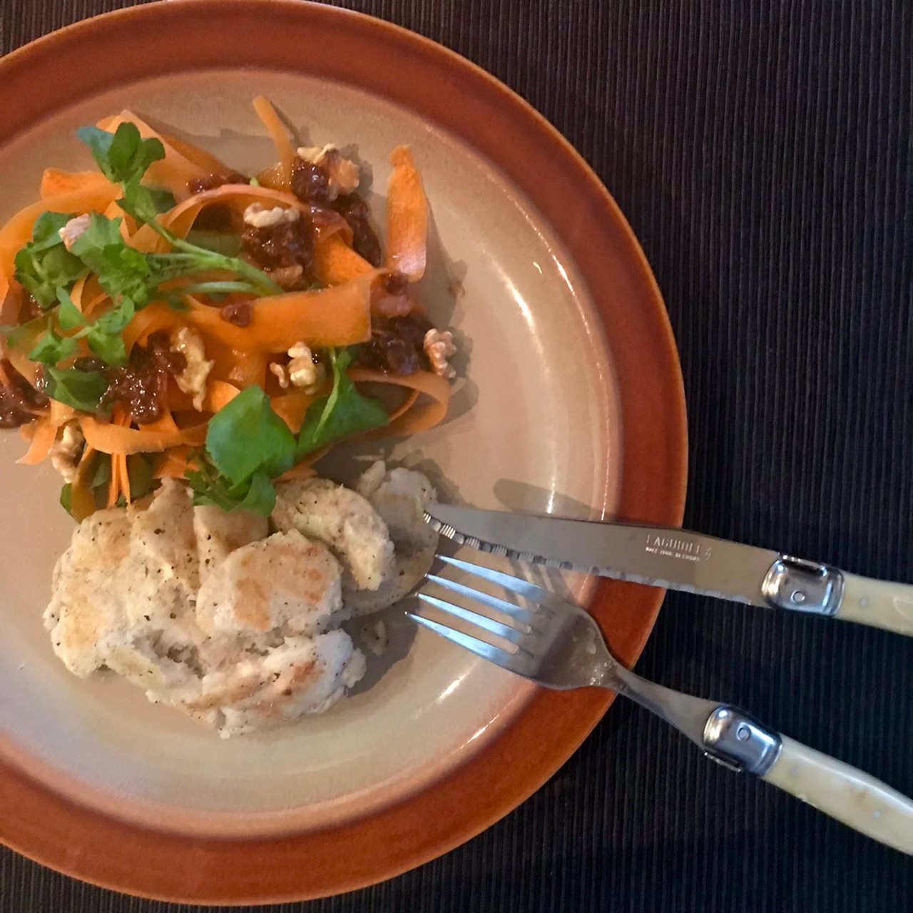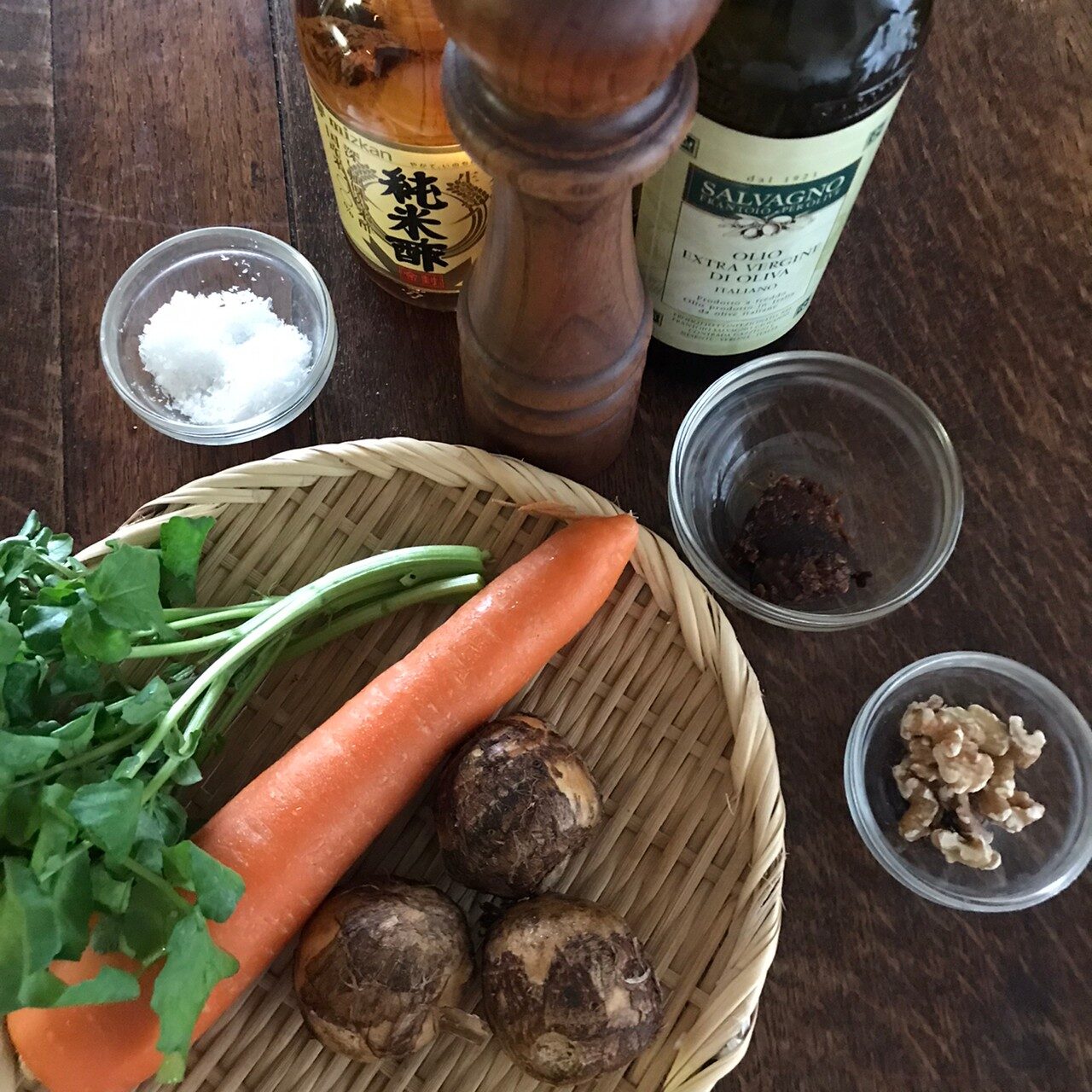 ピーラーで薄く切った人参とクレソンを皿に盛り、くるみを散らし、味噌ドレッシングをかけ、③を盛り合わせる。