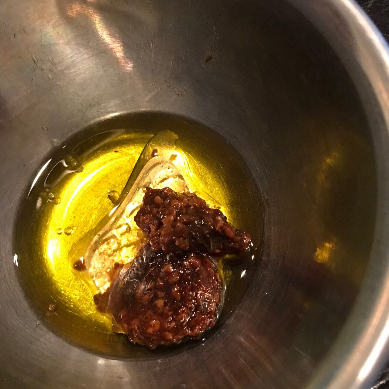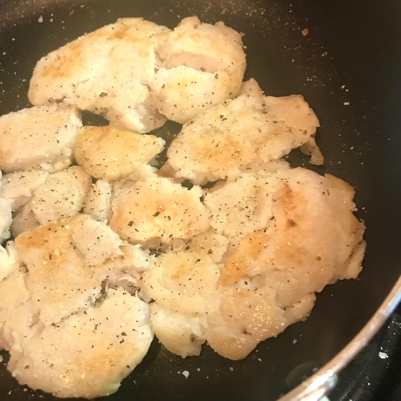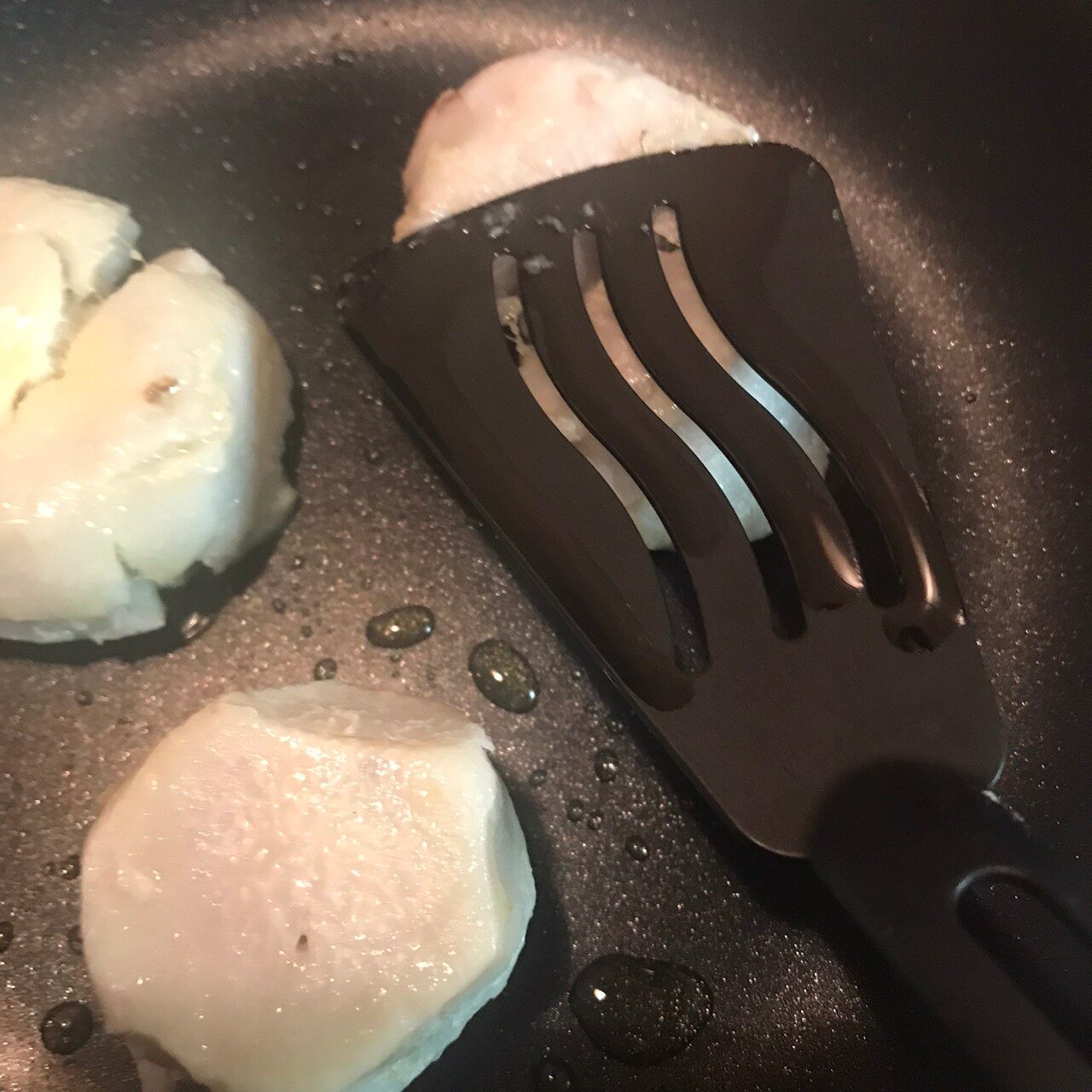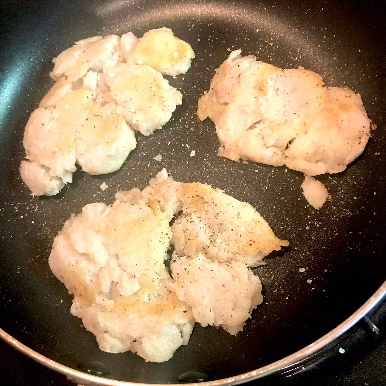フライパンにオリーブオイルを熱し、②を潰しながら焼いて塩、黒こしょうをふる。