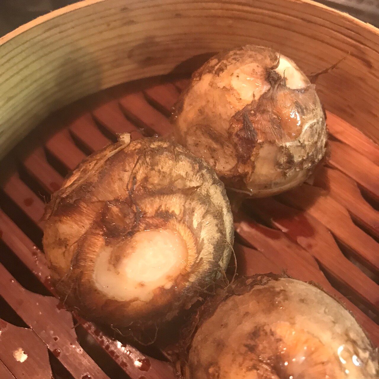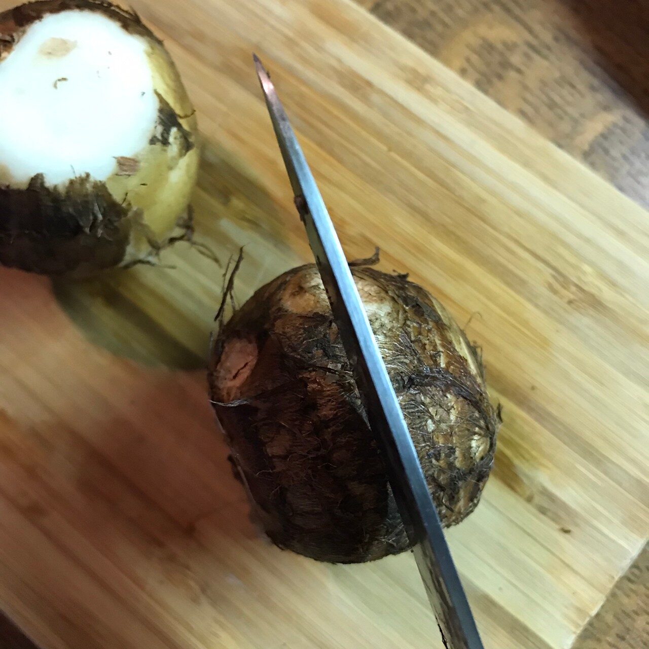 里芋を洗い、里芋に1周ぐるりと包丁で切り目を入れる。蒸し器に入れ柔らかくなるまで蒸す。