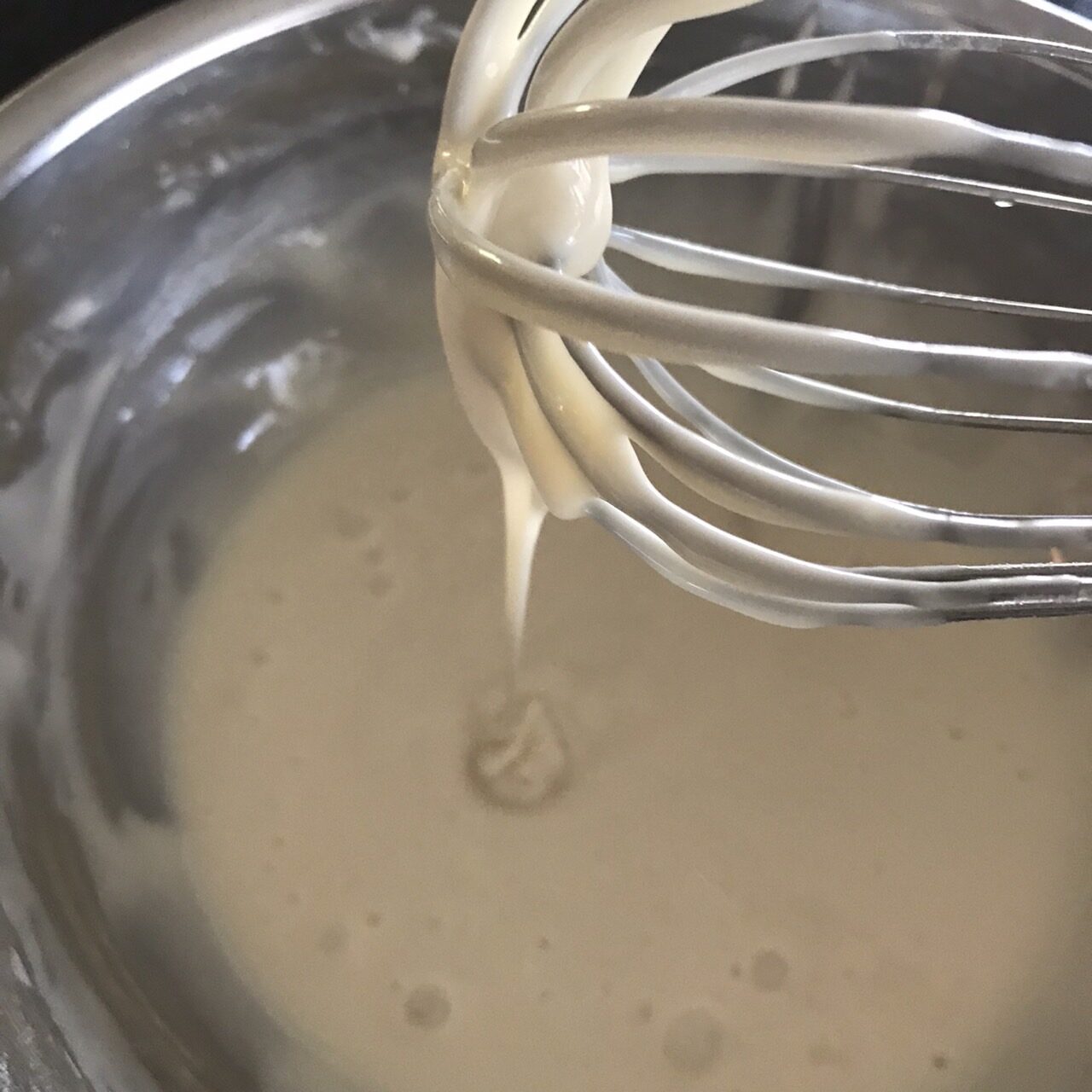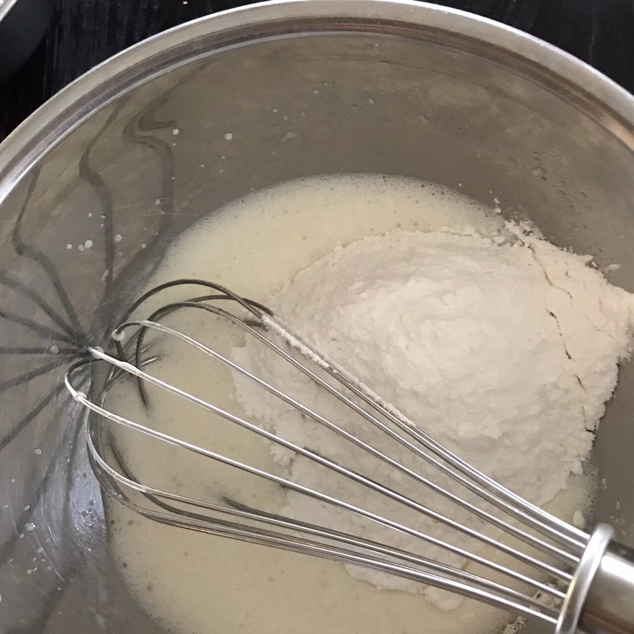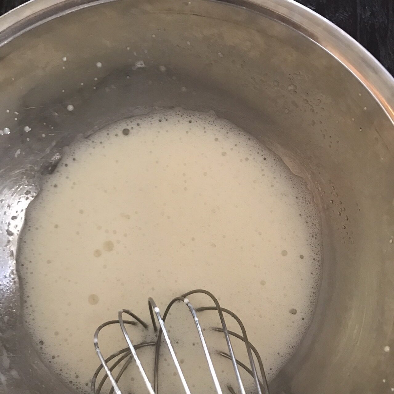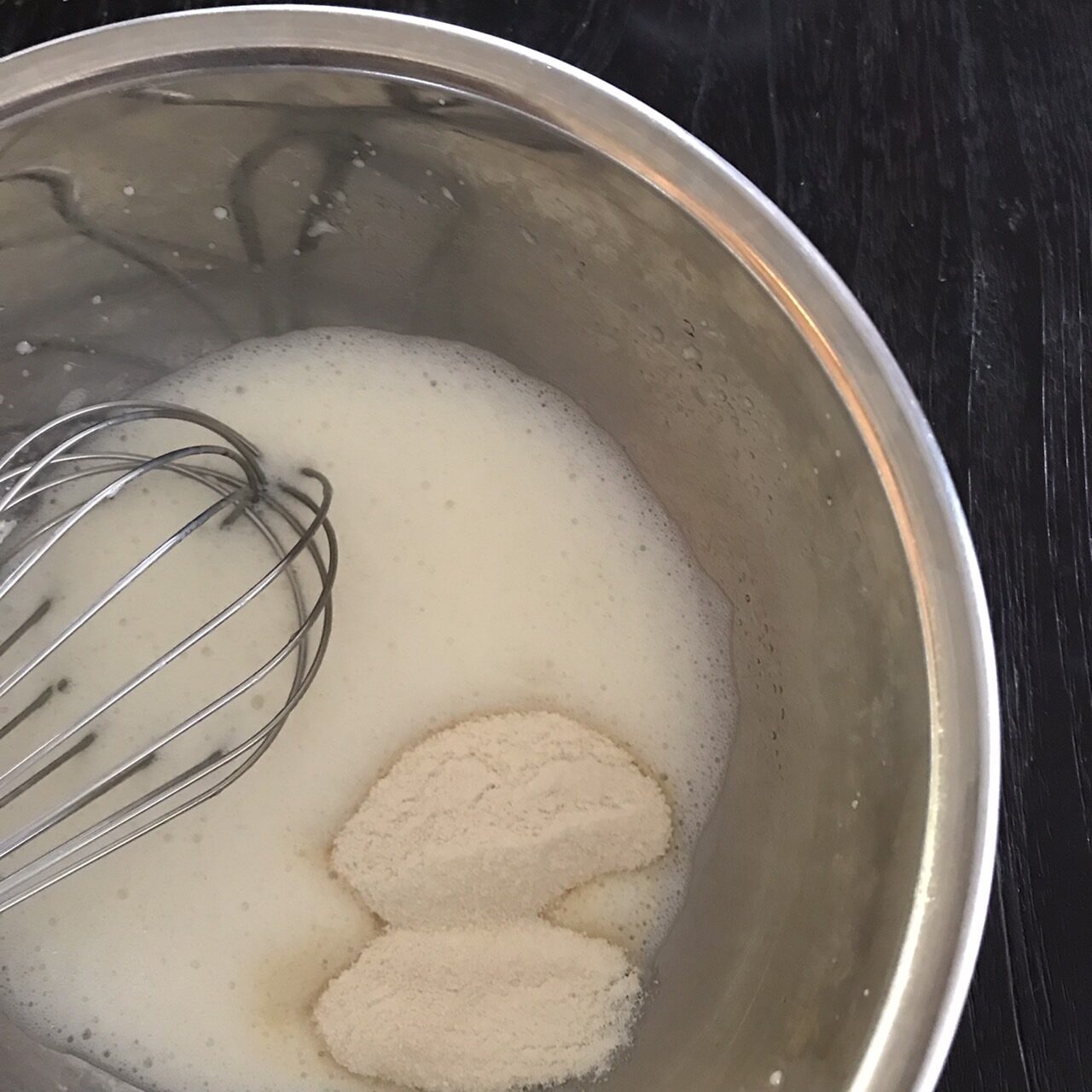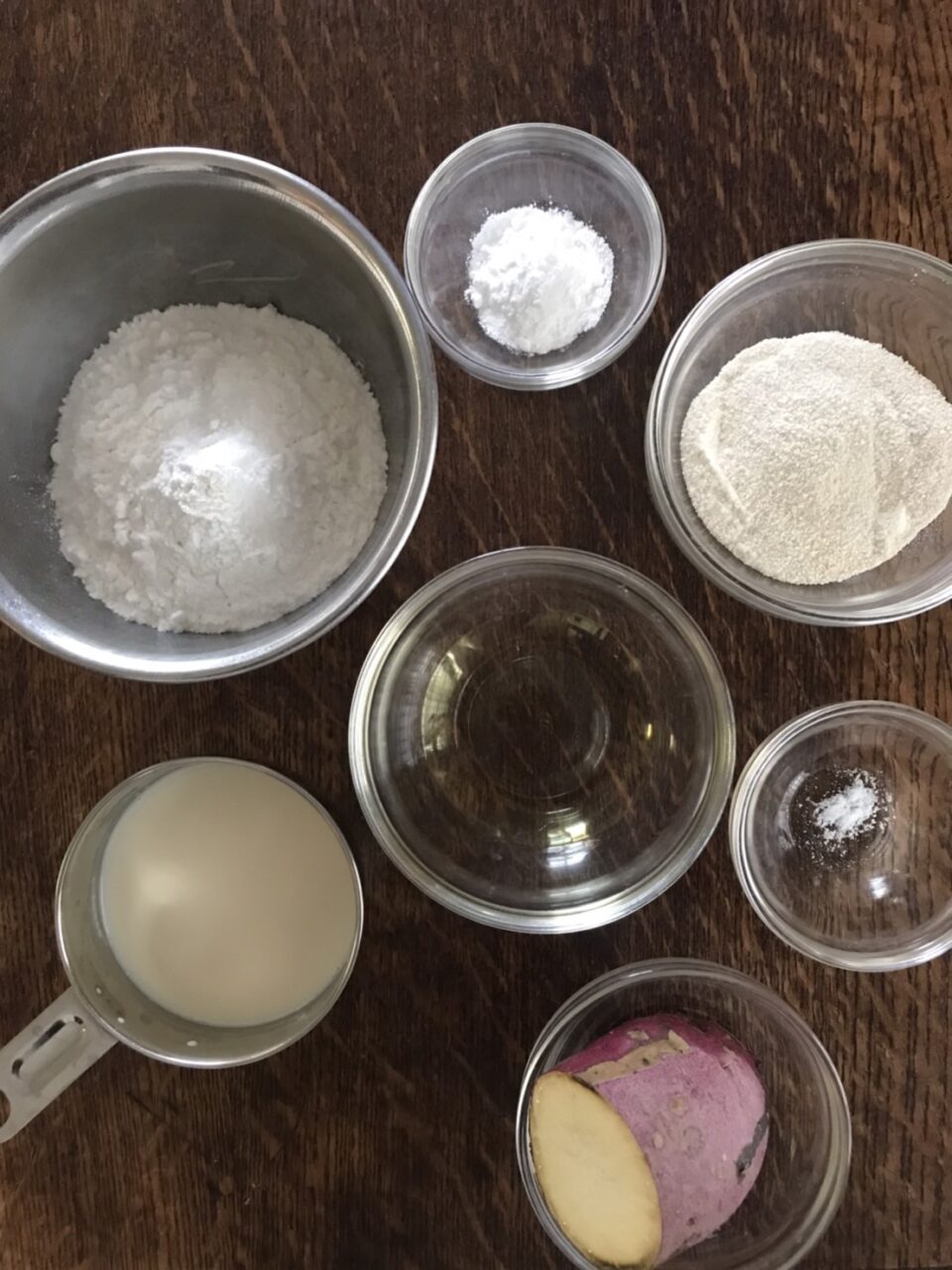 豆乳、なたねサラダ油をボールに入れて泡立てる。次にてんさい糖、塩を加えて混ぜる。米粉とベーキングパウダーを入れてさらにしっかり混ぜ合わせる。※生地が固い時は豆乳を足して調整する。